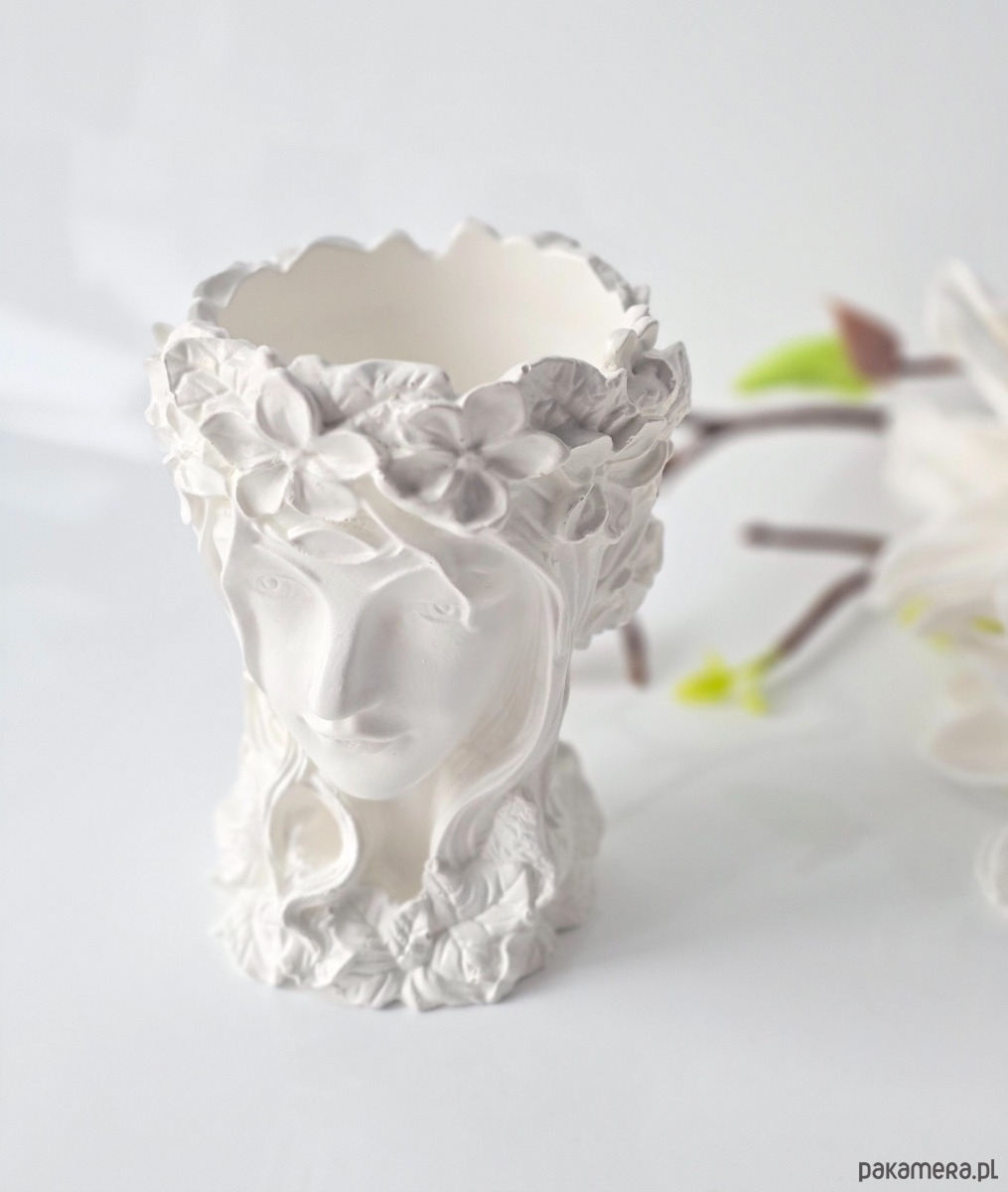 Owinięta w tajemniczą roślinność kobieta o ciepłym i życzliwym spojrzeniu wprowadzi do Twojego domu urok i magię, z kolei Twoje ulubione rośliny zyskają należytą przestrzeń. Delikatna forma i biały kolor wazonu sprawiają, że wszystkie rośliny wyglądają w nim imponująco.