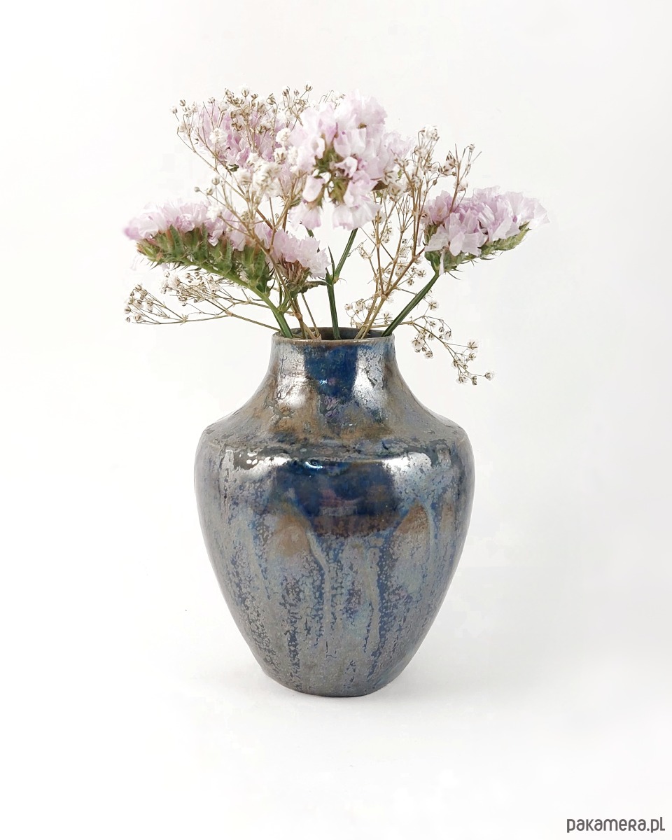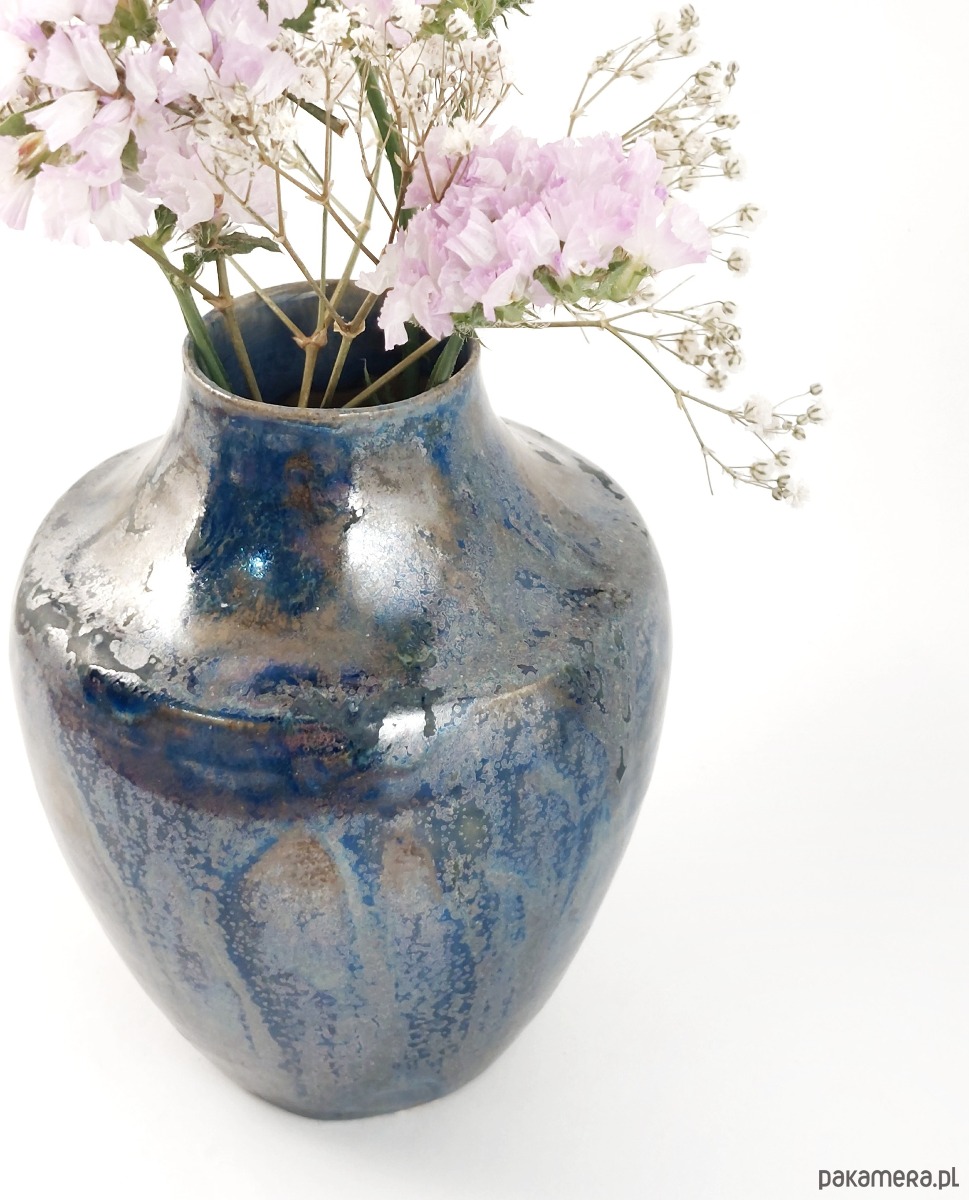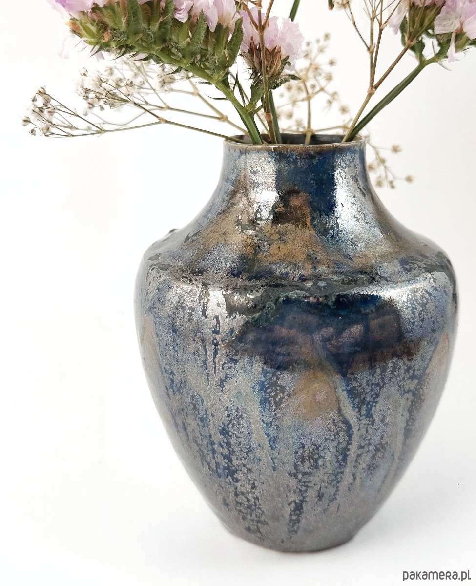 Ceramiczny wazon w kolorze srebrno-granatowym.
