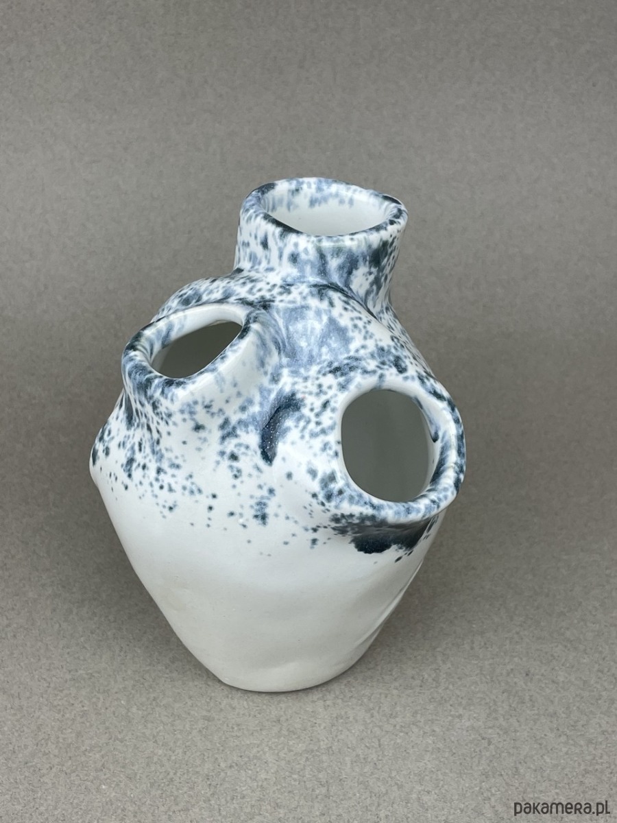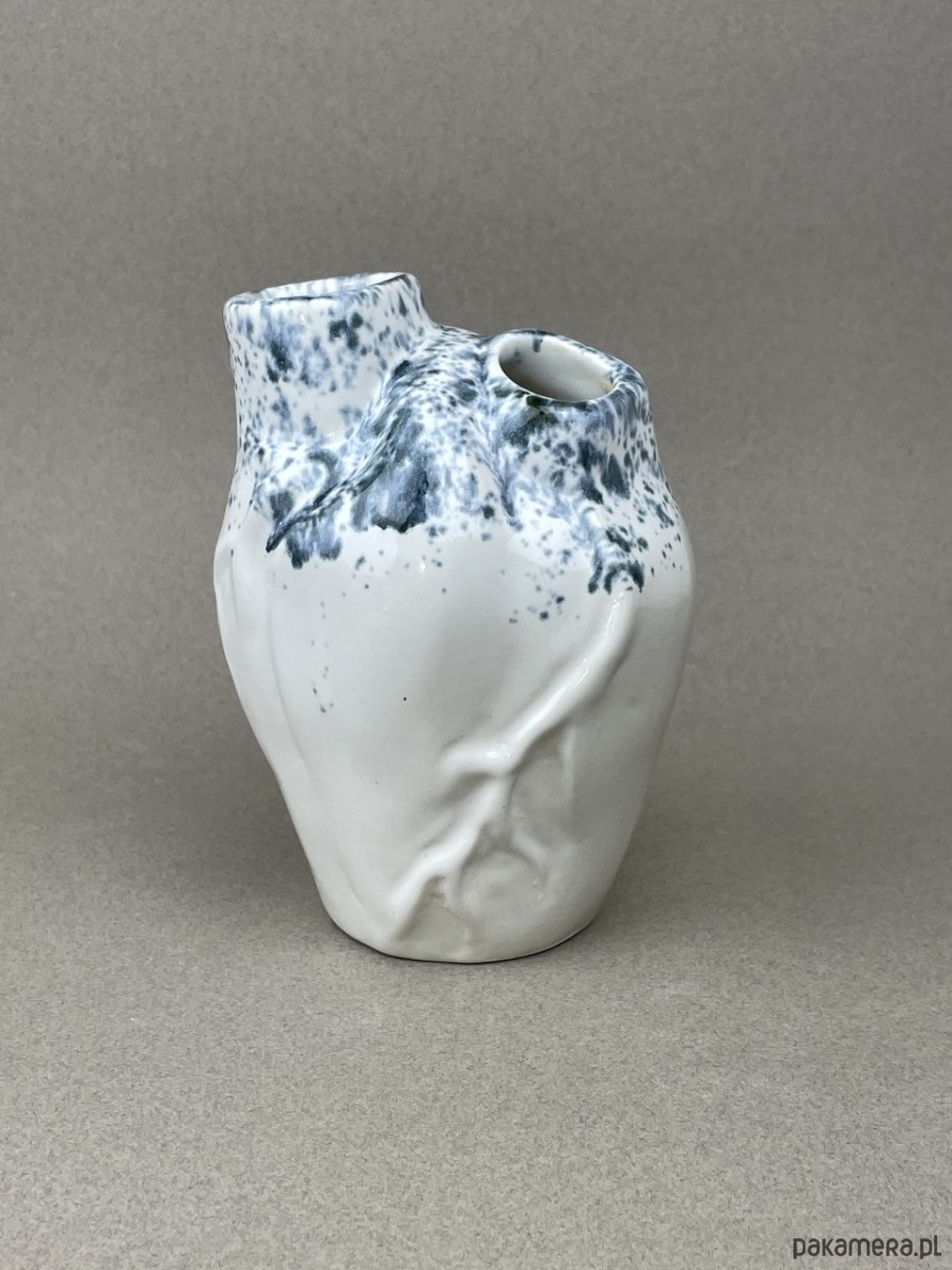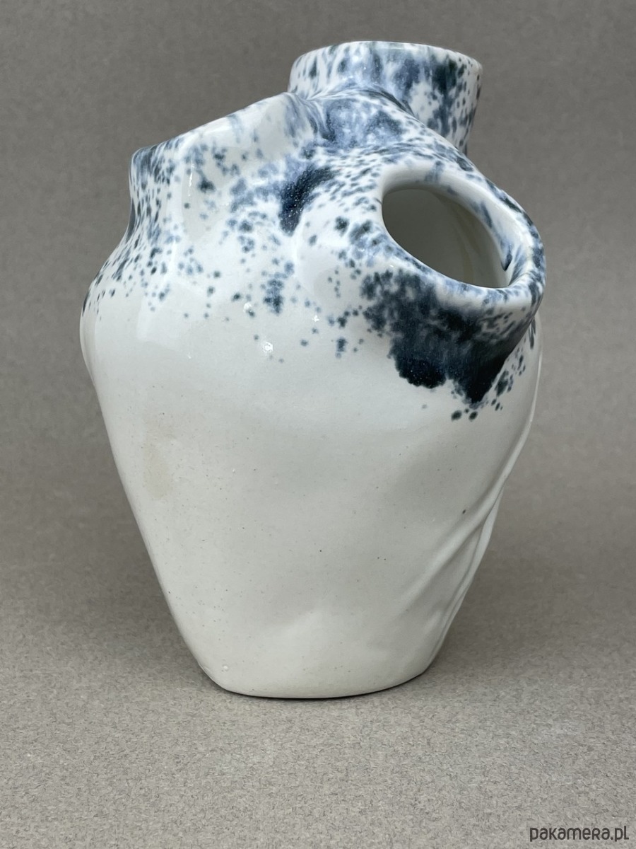 Ten oryginalny wazon wykonany jest z białej gliny, pokryty białym, błyszczącym szkliwem z dodatkiem atramentowego efektu.