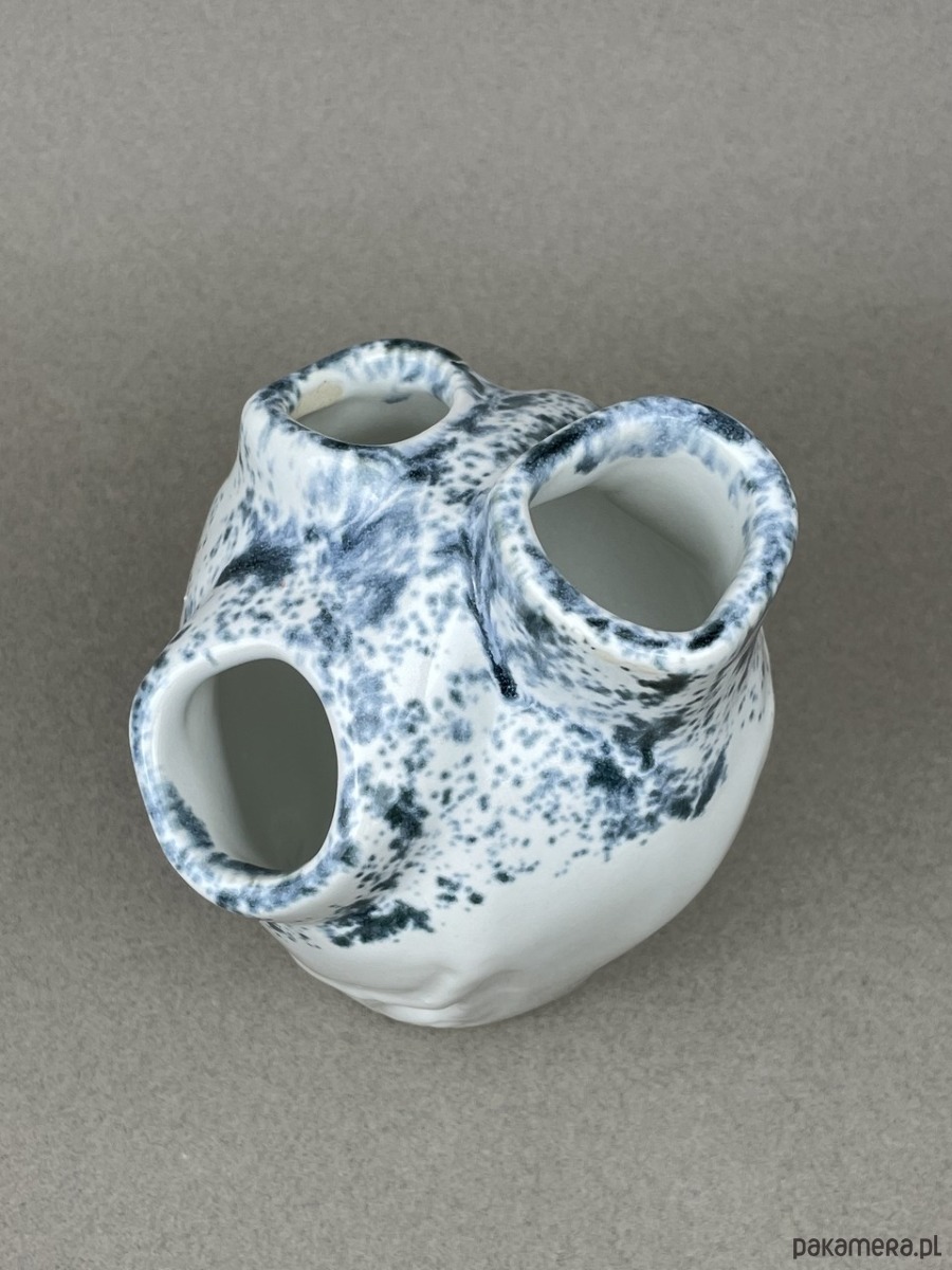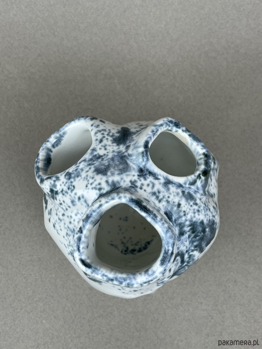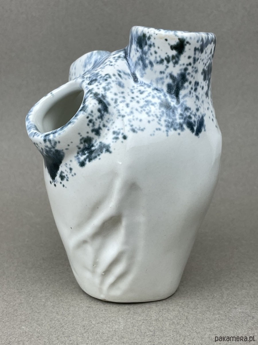 Ten oryginalny wazon wykonany jest z białej gliny, pokryty białym, błyszczącym szkliwem z dodatkiem atramentowego efektu.