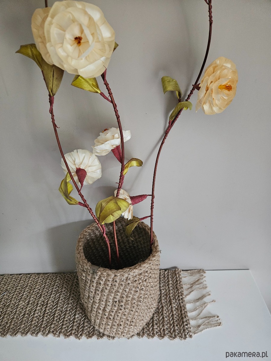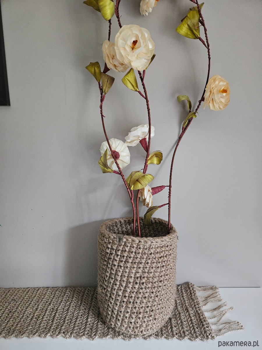 Dodaj wnętrzu ciepła i naturalnego charakteru dzięki wyjątkowej osłonce / wazonowi wykonanemu ręcznie ze sznurka konopnego. To nie tylko praktyczny element dekoracyjny, ale też stylowy dodatek w duchu boho i eko. Idealny na suszone kwiaty, trawy pampasowe lub jako osłonka na doniczkę.
