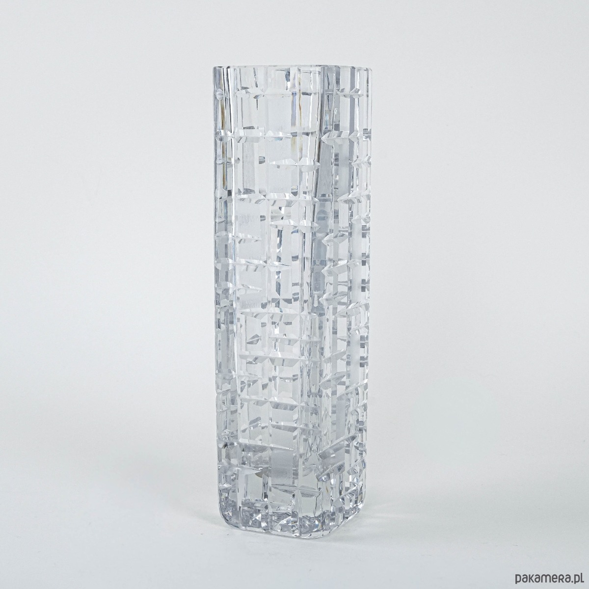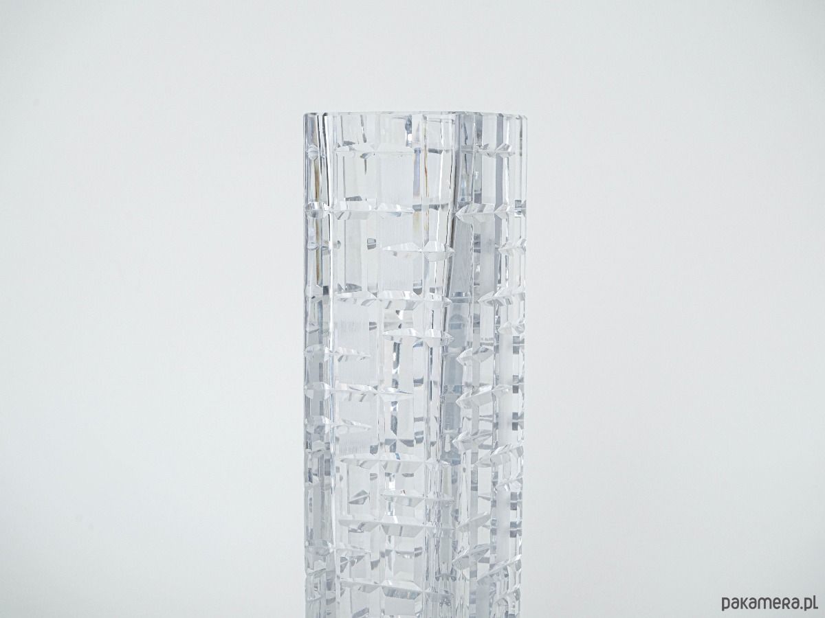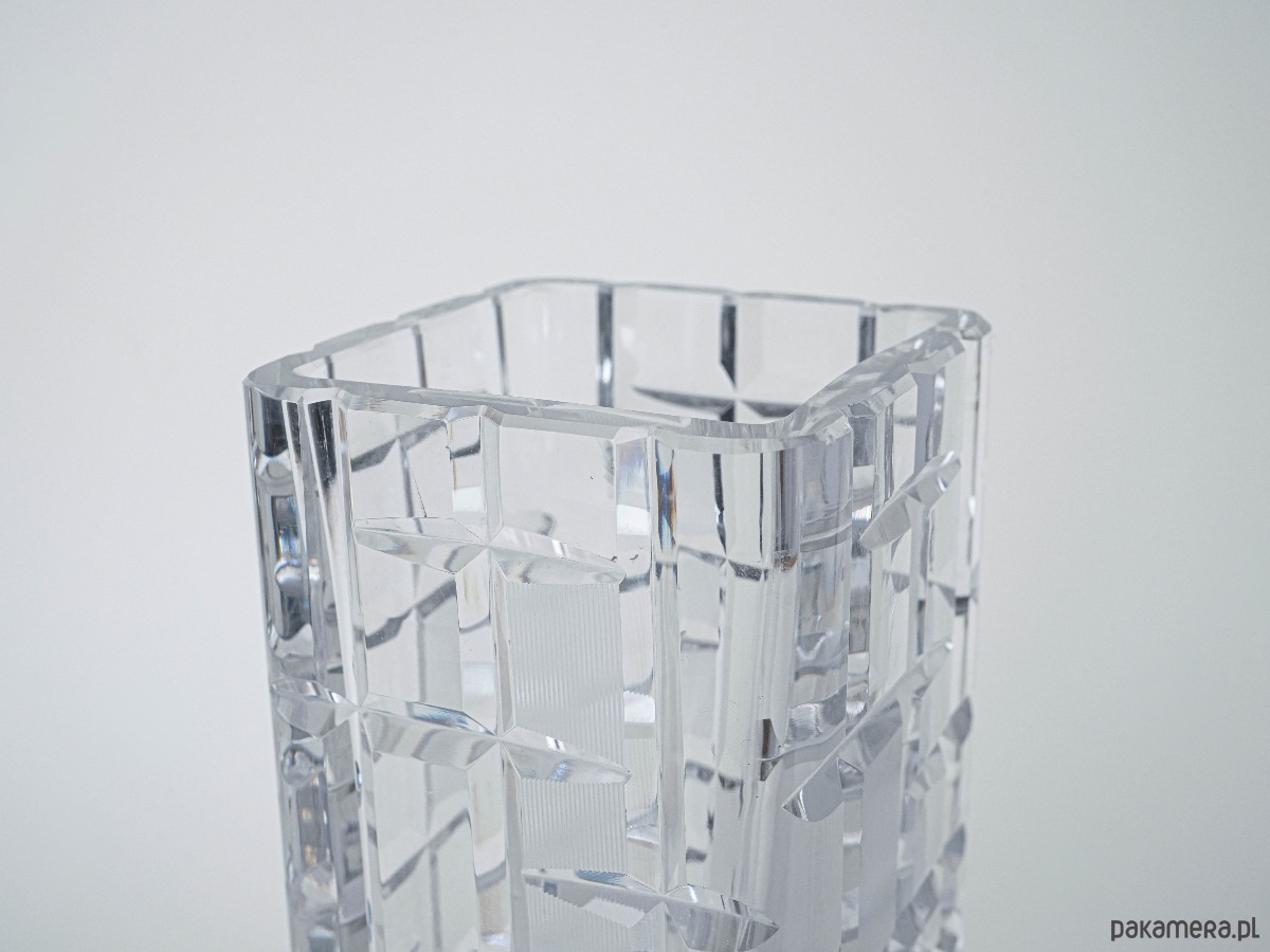 Wazon kryształowy z lat 60.–70. Geometryczny, reliefowy szlif tworzy efekt głębi i świetlistych refleksów, charakterystyczny dla europejskiej sztuki szkła użytkowego epoki mid-century modern. Wykonany z ciężkiego, klarownego kryształu, stanowi wyraz kunsztu rzemieślniczego i ponadczasowej elegancji. Autentyczny egzemplarz vintage, poszukiwany zarówno jako element kolekcjonerski, jak i dekoracyjny akcent wnętrza.