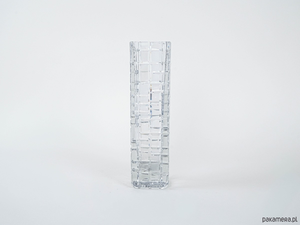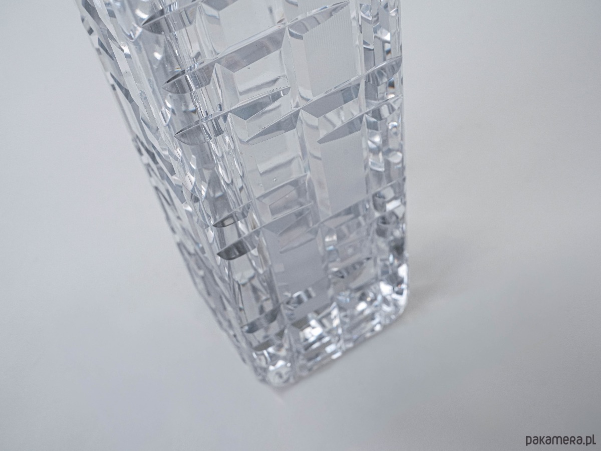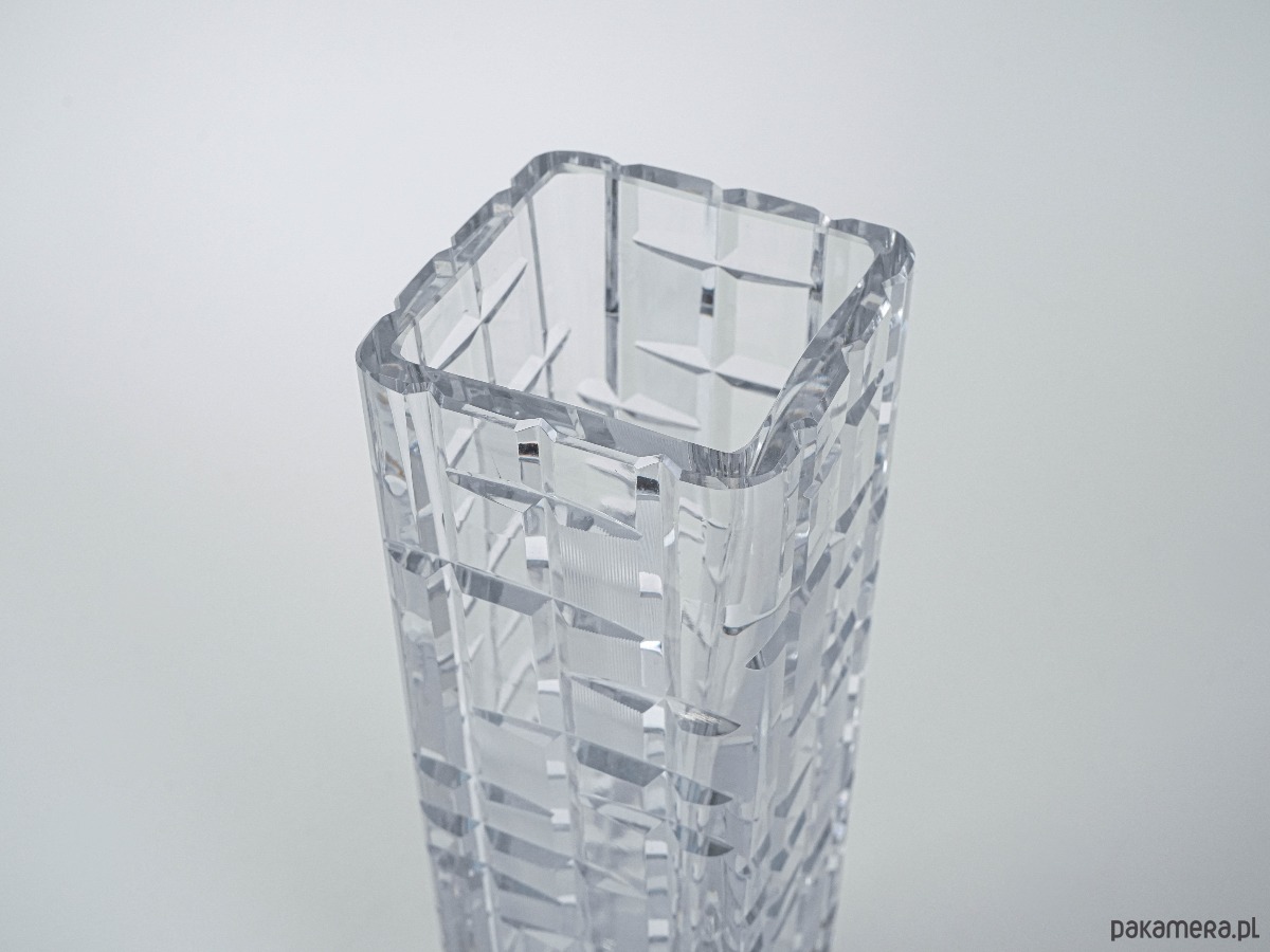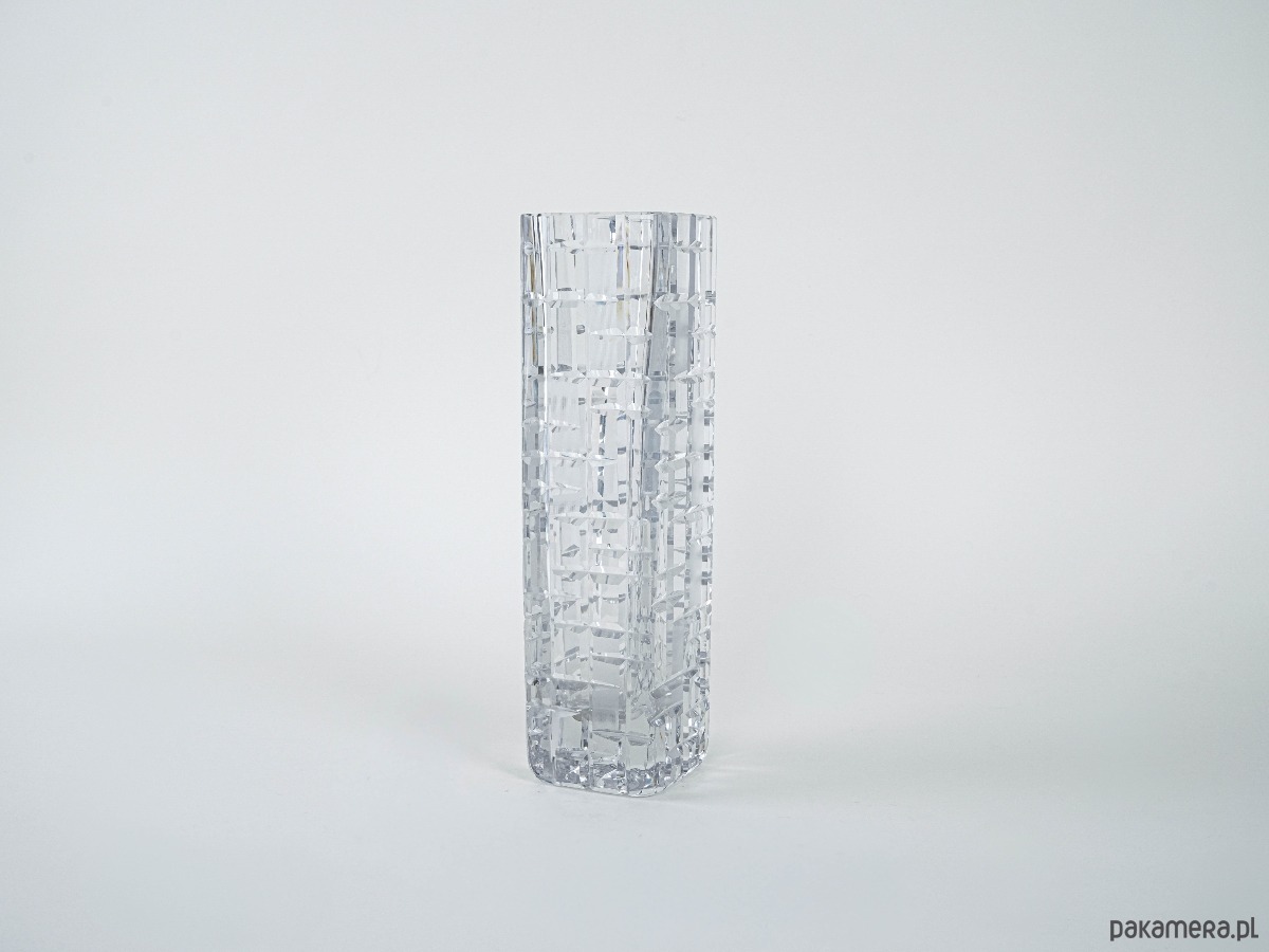 Wazon kryształowy z lat 60.–70. Geometryczny, reliefowy szlif tworzy efekt głębi i świetlistych refleksów, charakterystyczny dla europejskiej sztuki szkła użytkowego epoki mid-century modern. Wykonany z ciężkiego, klarownego kryształu, stanowi wyraz kunsztu rzemieślniczego i ponadczasowej elegancji. Autentyczny egzemplarz vintage, poszukiwany zarówno jako element kolekcjonerski, jak i dekoracyjny akcent wnętrza.
