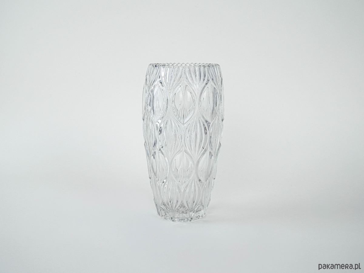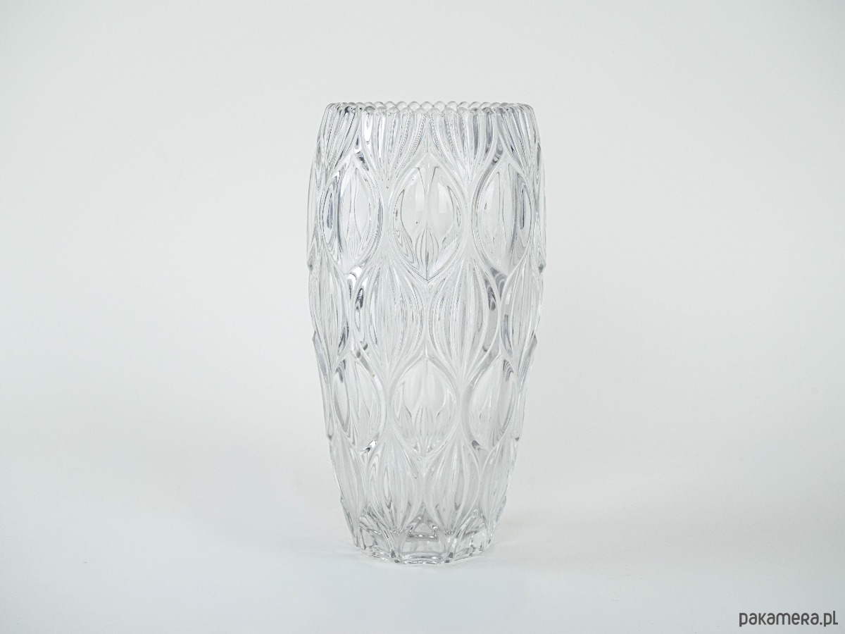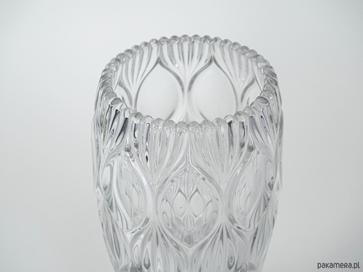 Wazon kryształowy z lat 60.–70., zdobiony tłoczonym wzorem w formie wypukłych, migdałowych motywów. Charakterystyczna faktura pięknie załamuje światło, tworząc bogate refleksy i nadając całości wyjątkową dekoracyjność. Przykład europejskiej szkoły szkła użytkowego epoki mid-century modern.
