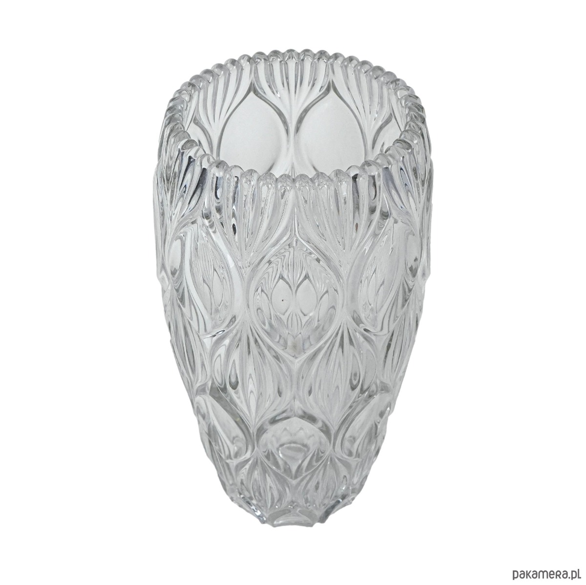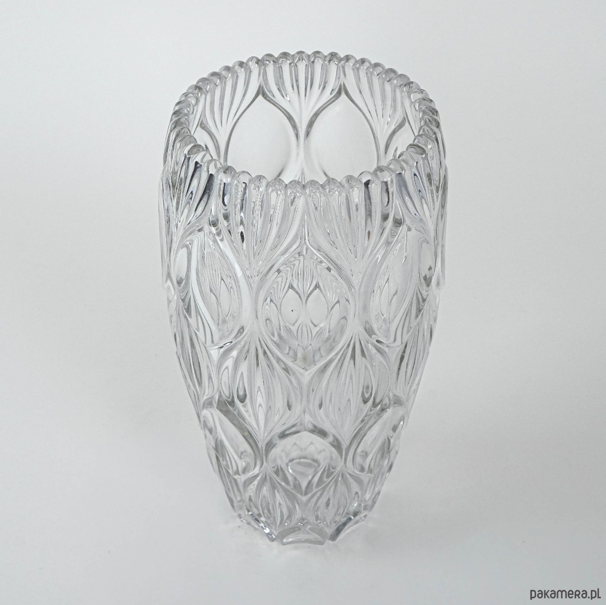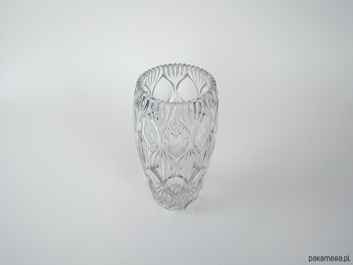 Wazon kryształowy z lat 60.–70., zdobiony tłoczonym wzorem w formie wypukłych, migdałowych motywów. Charakterystyczna faktura pięknie załamuje światło, tworząc bogate refleksy i nadając całości wyjątkową dekoracyjność. Przykład europejskiej szkoły szkła użytkowego epoki mid-century modern.