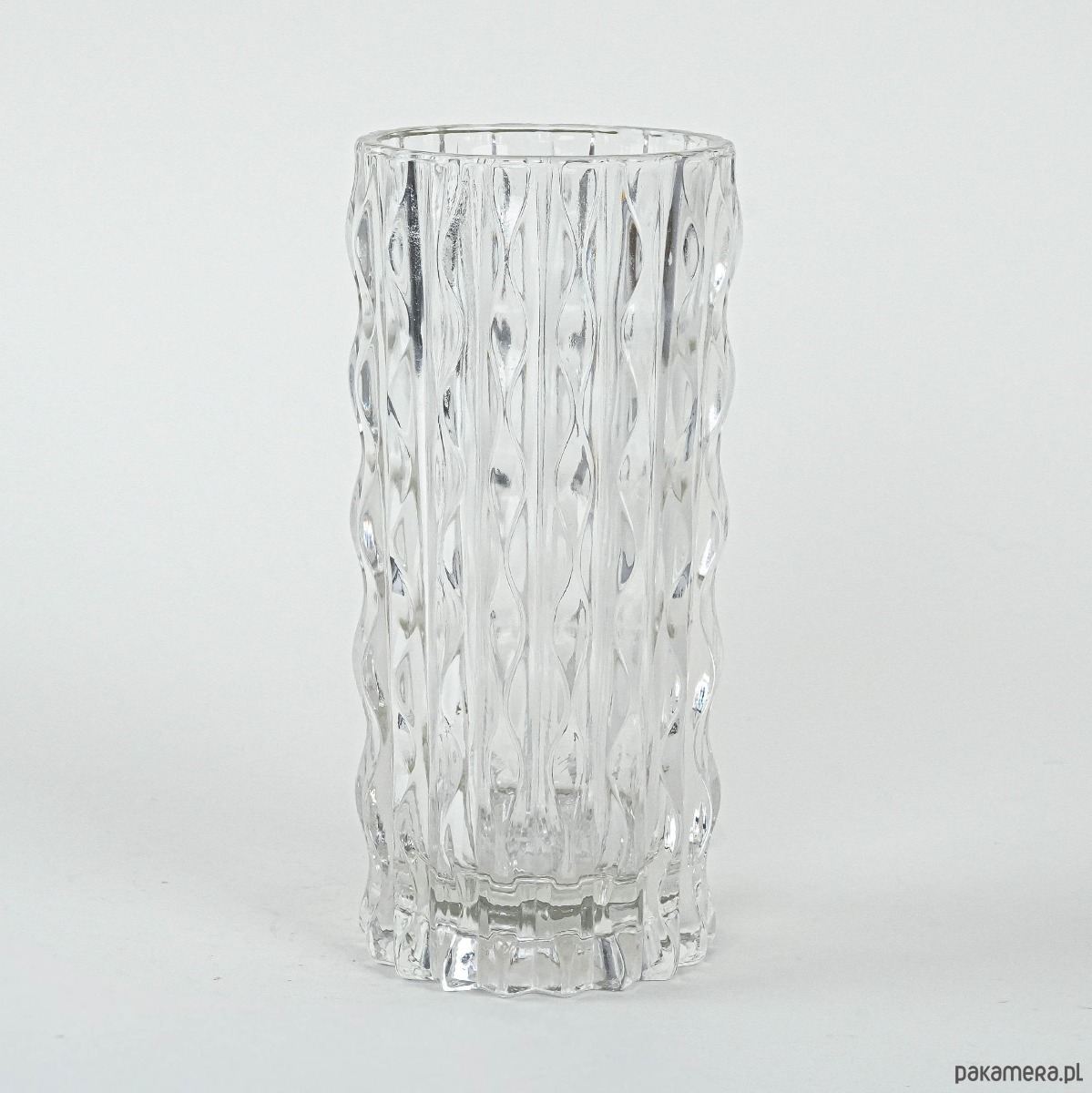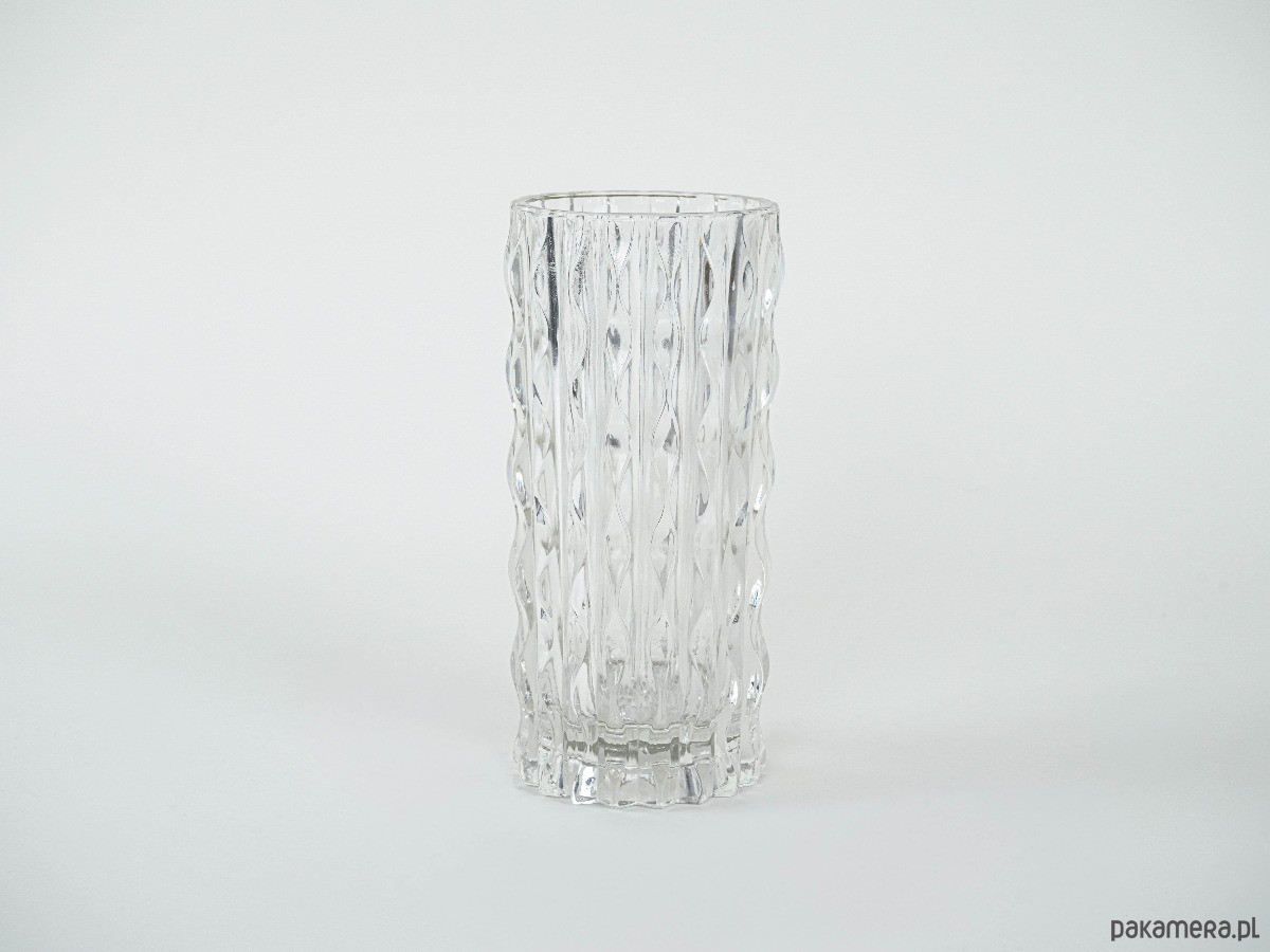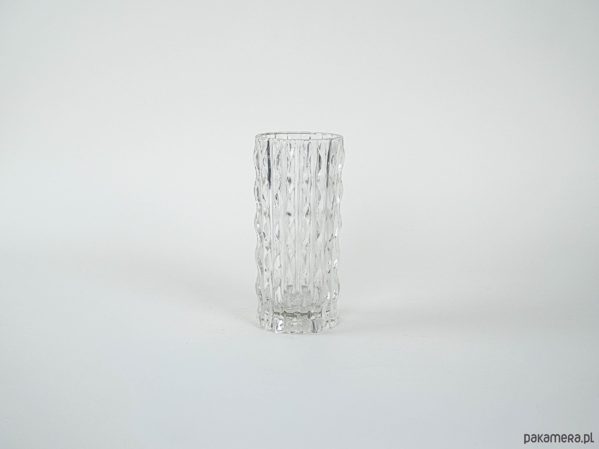 Wazon kryształowy z lat 60.–70., o cylindrycznej formie i dekoracyjnej, tłoczonej fakturze przypominającej pionowe, falujące pasy. Charakterystyczny dla europejskiego szkła użytkowego tamtej epoki, stanowi przykład wyrazistego designu mid-century modern.
