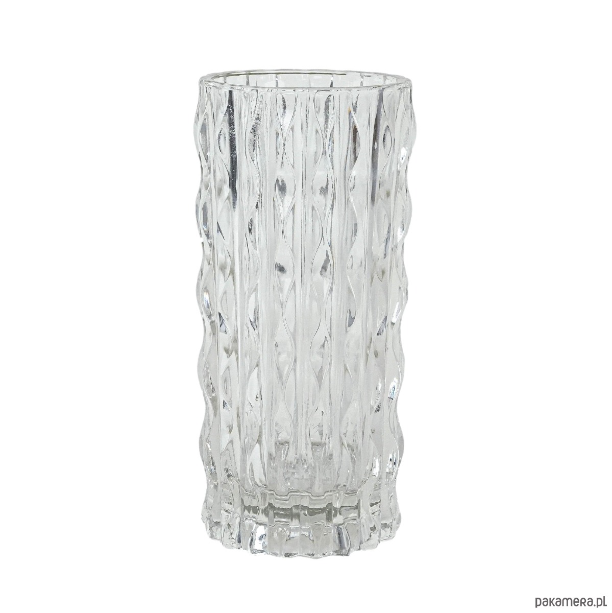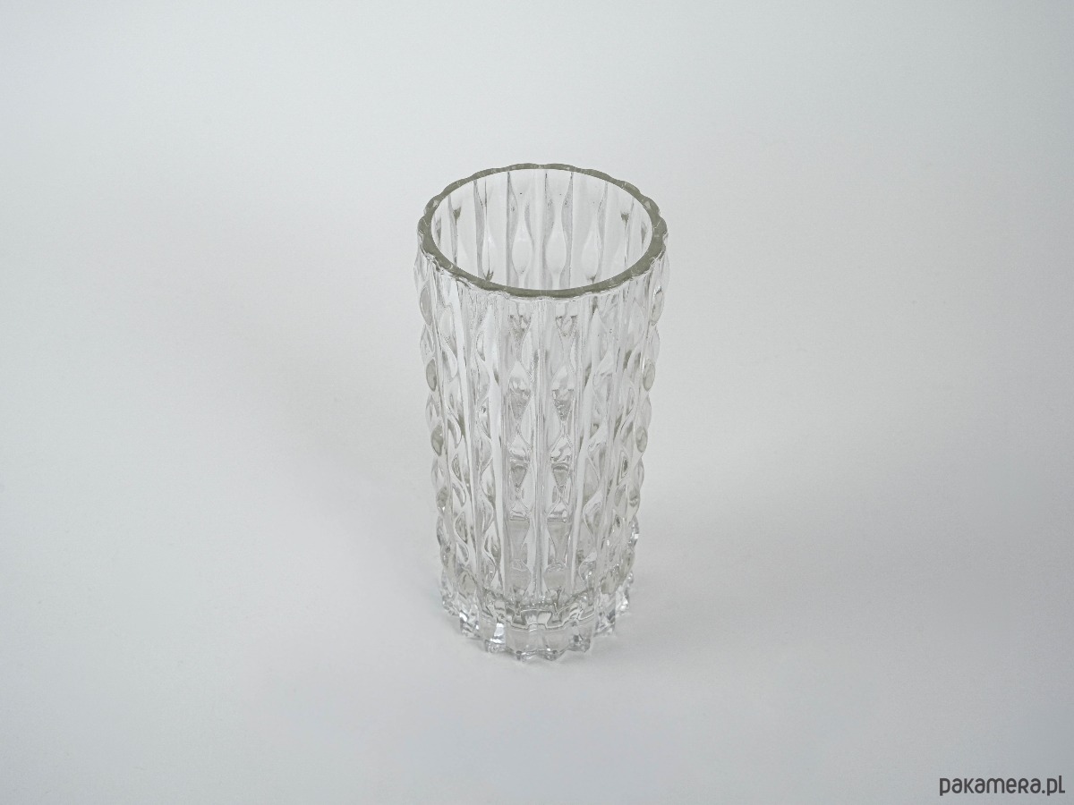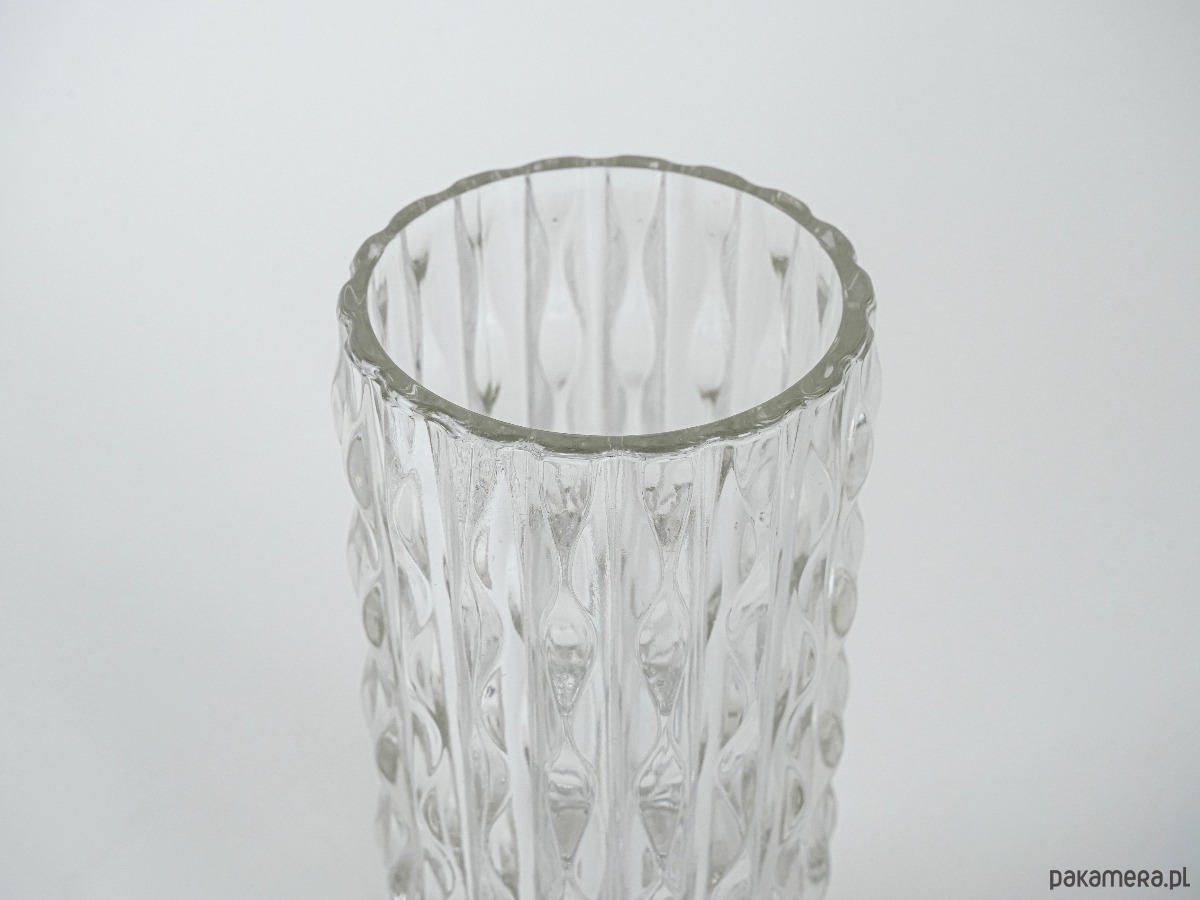 Wazon kryształowy z lat 60.–70., o cylindrycznej formie i dekoracyjnej, tłoczonej fakturze przypominającej pionowe, falujące pasy. Charakterystyczny dla europejskiego szkła użytkowego tamtej epoki, stanowi przykład wyrazistego designu mid-century modern.