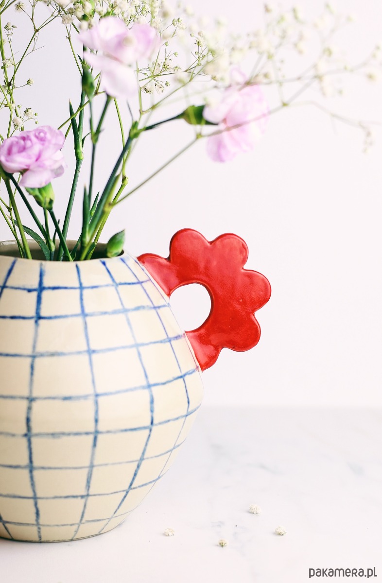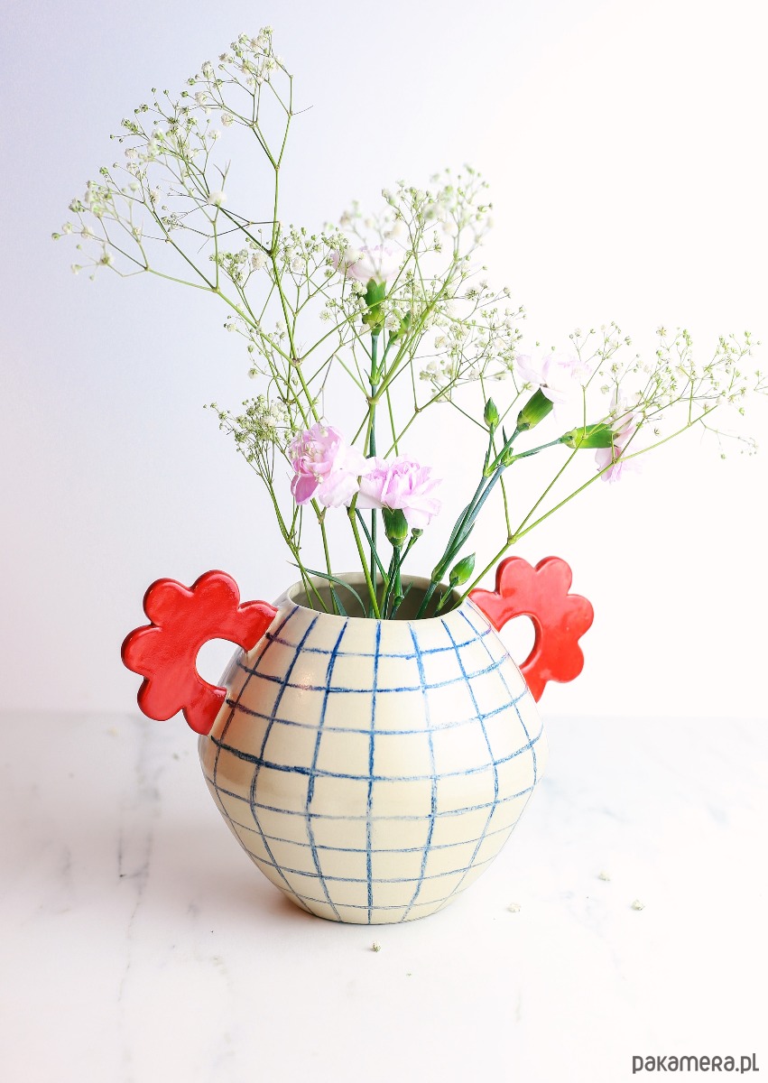 Ceramiczny wazon w odręcznie narysowaną granatową kratkę i intensywnie czerwone uszy. Efektowny dodatek do wnętrza.