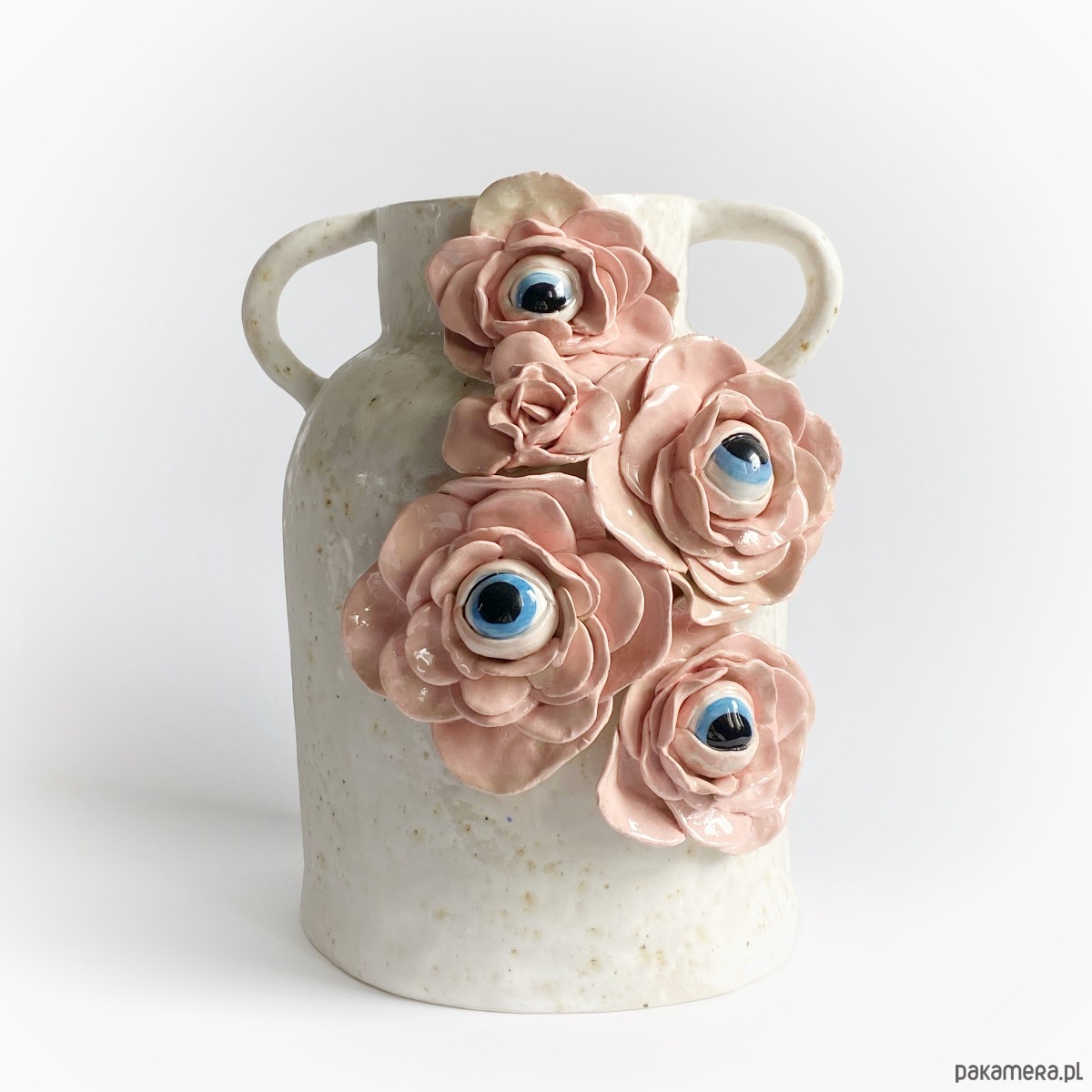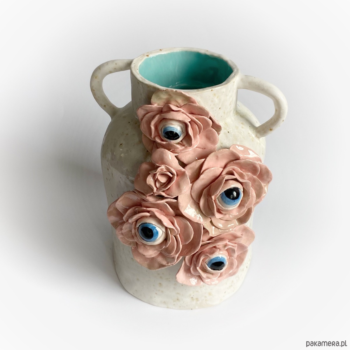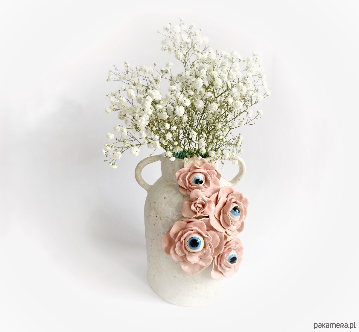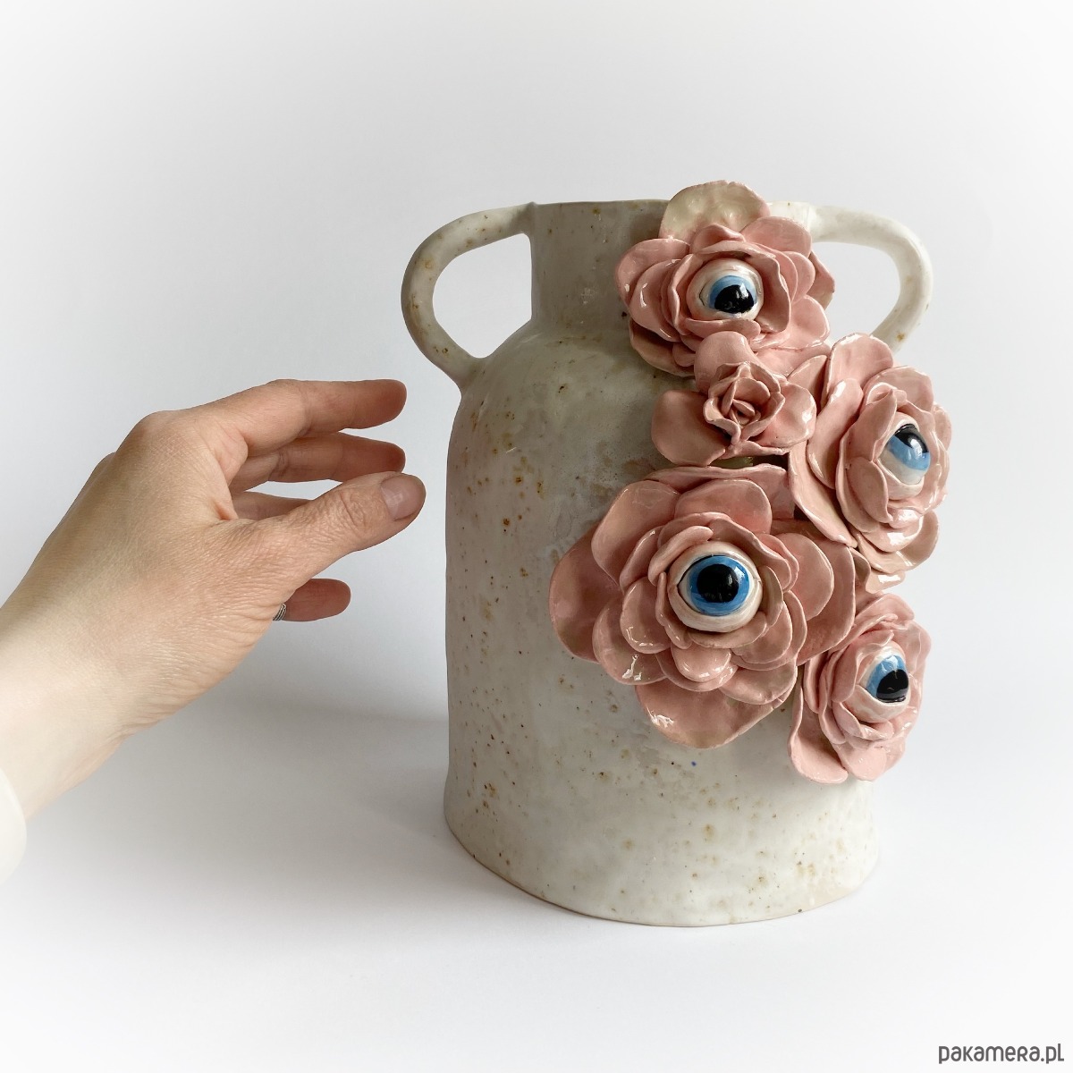 Wazon ceramiczny z morskim środkiem i różowymi kwiatami z oczami.