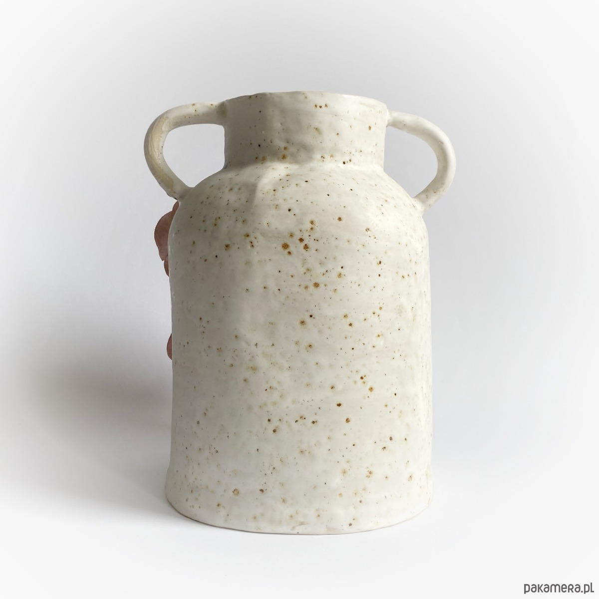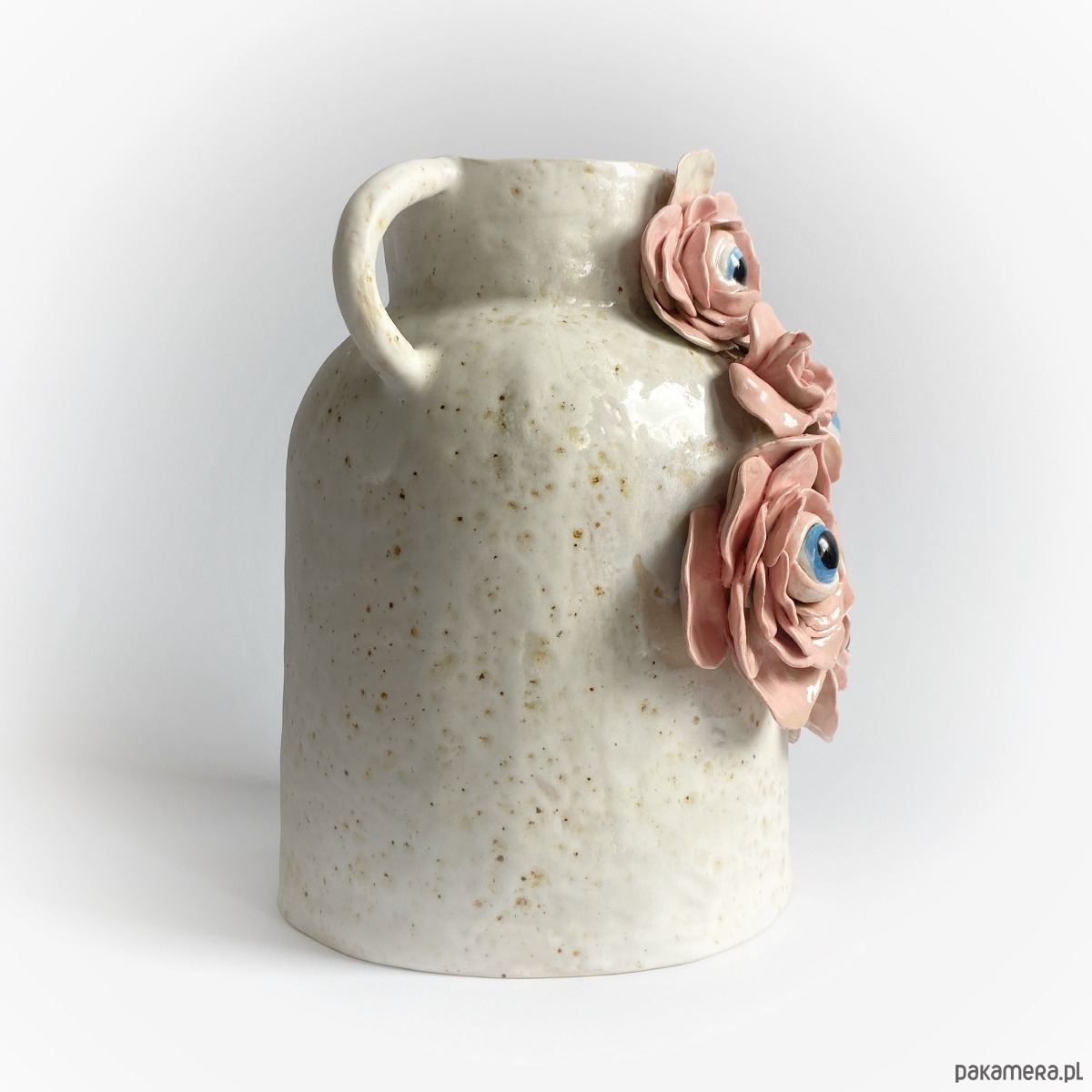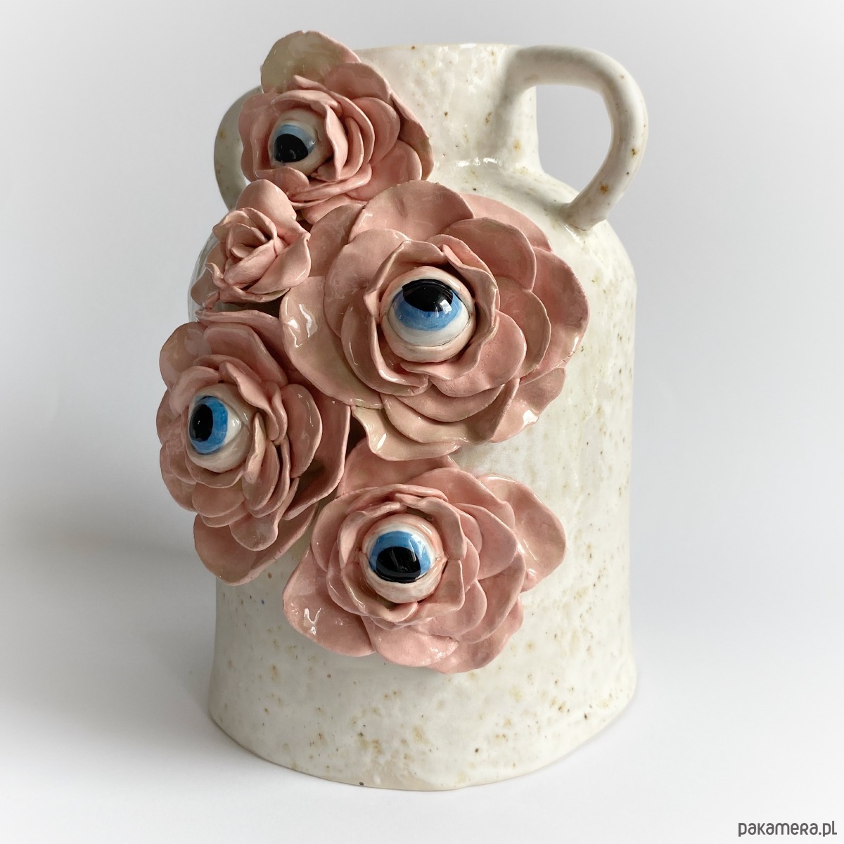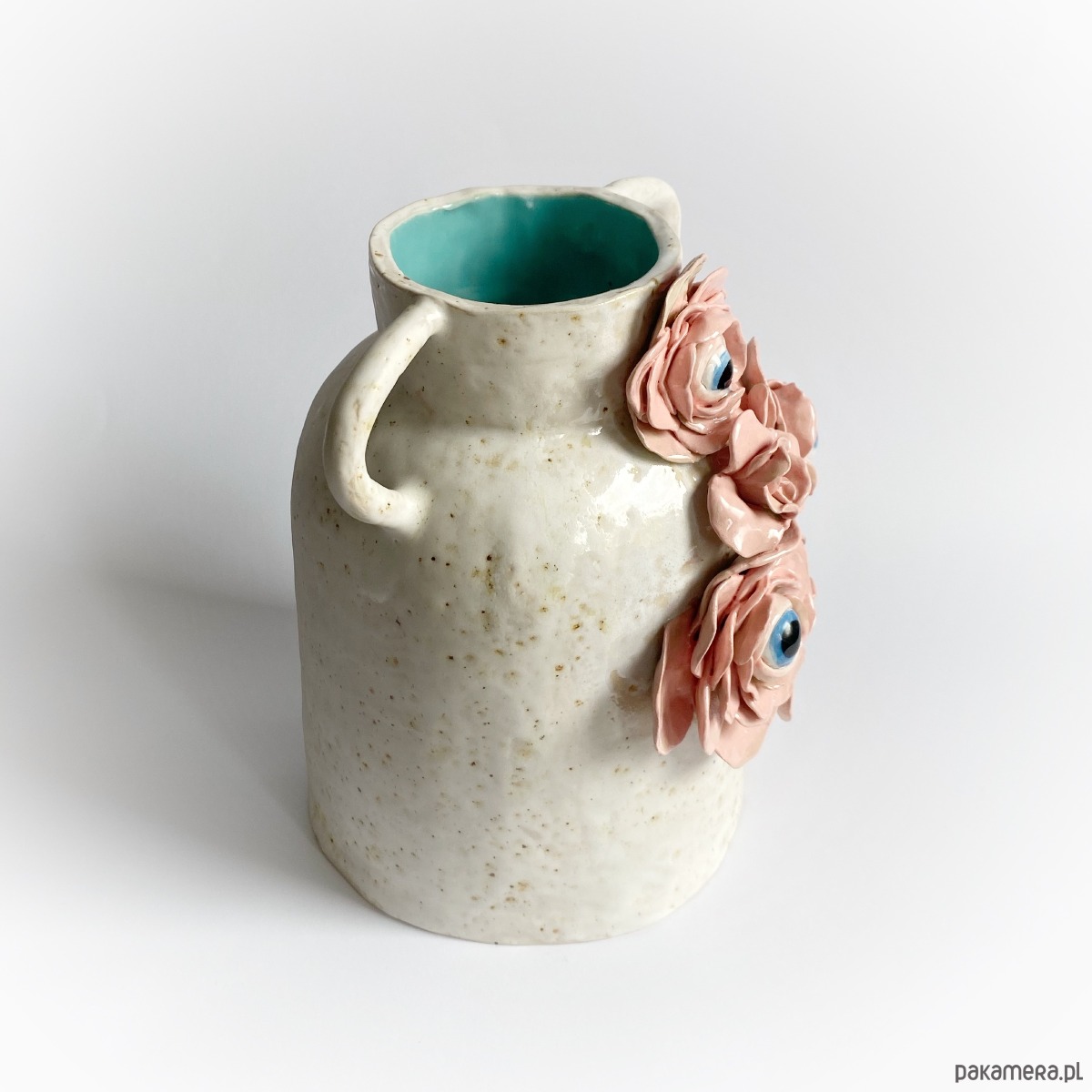 Wazon ceramiczny z morskim środkiem i różowymi kwiatami z oczami.