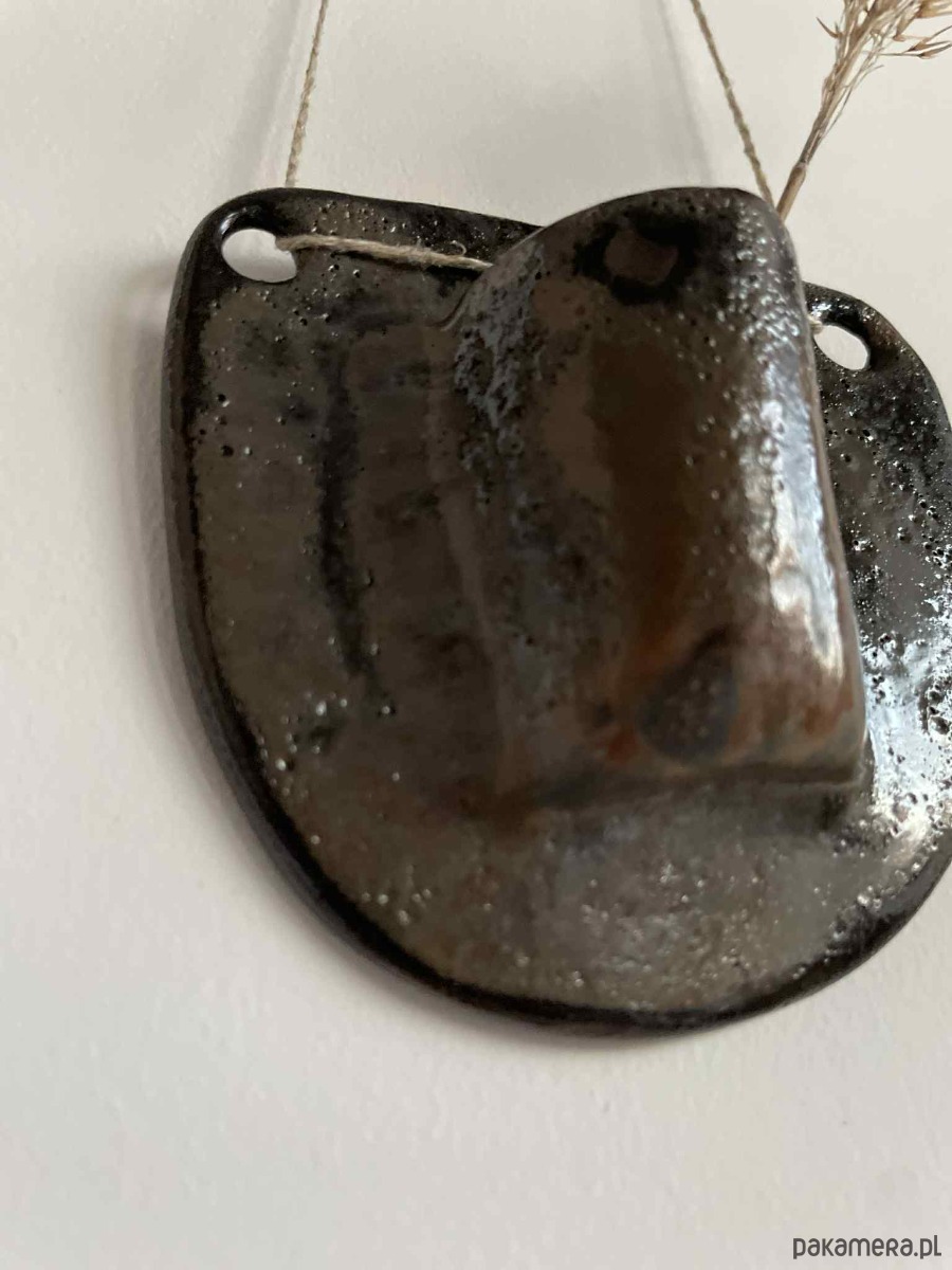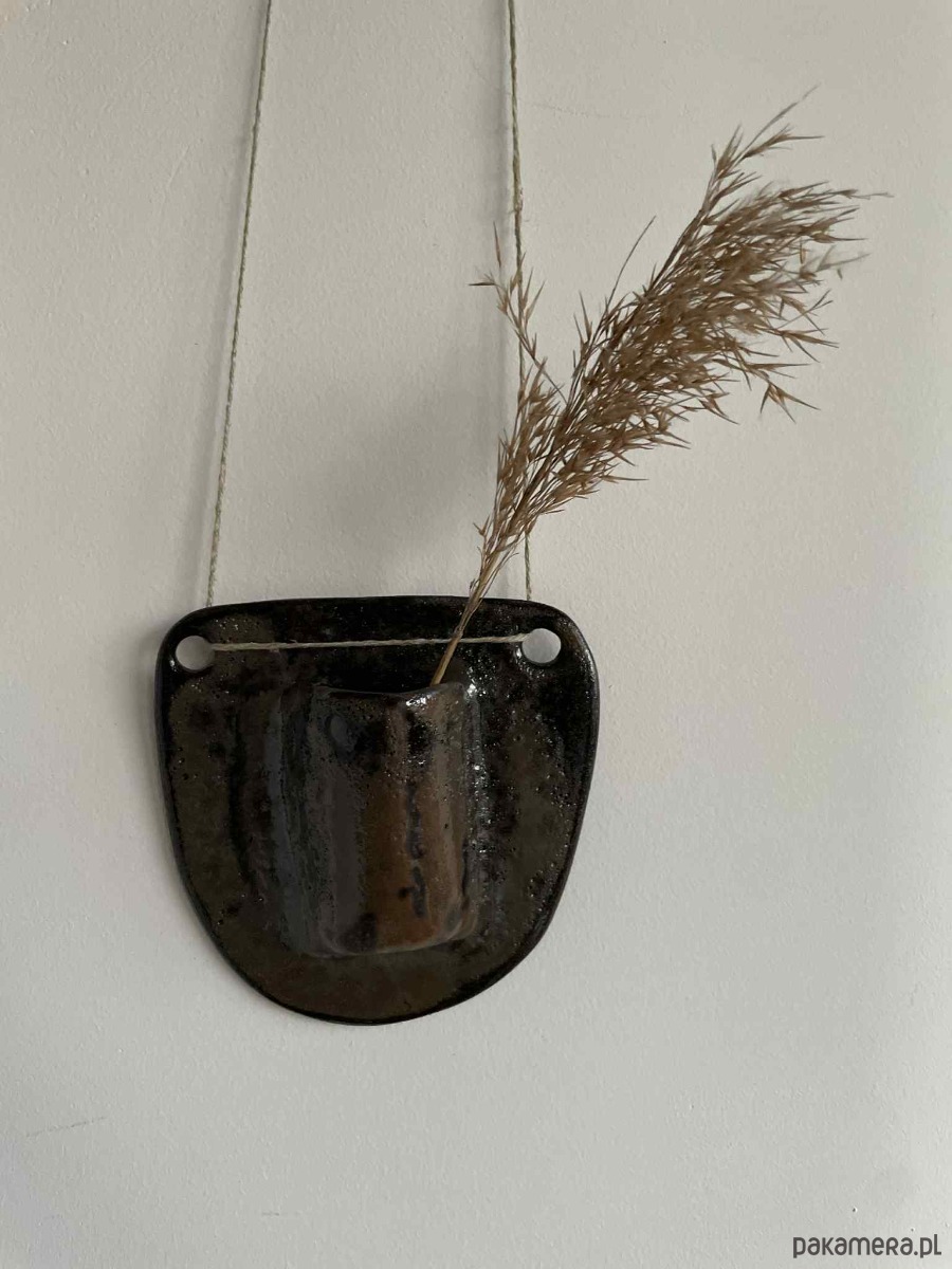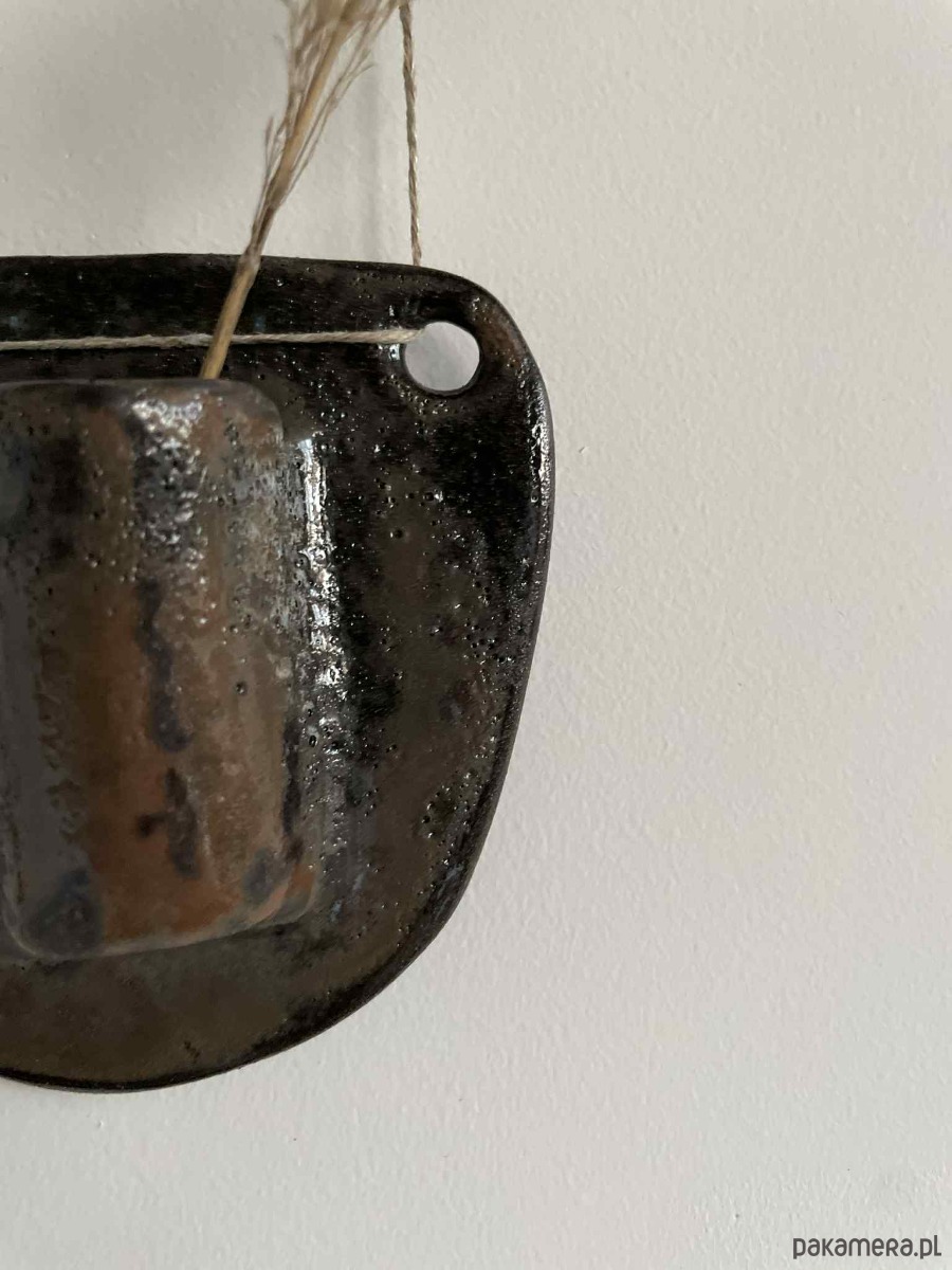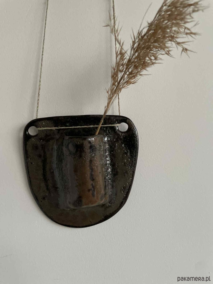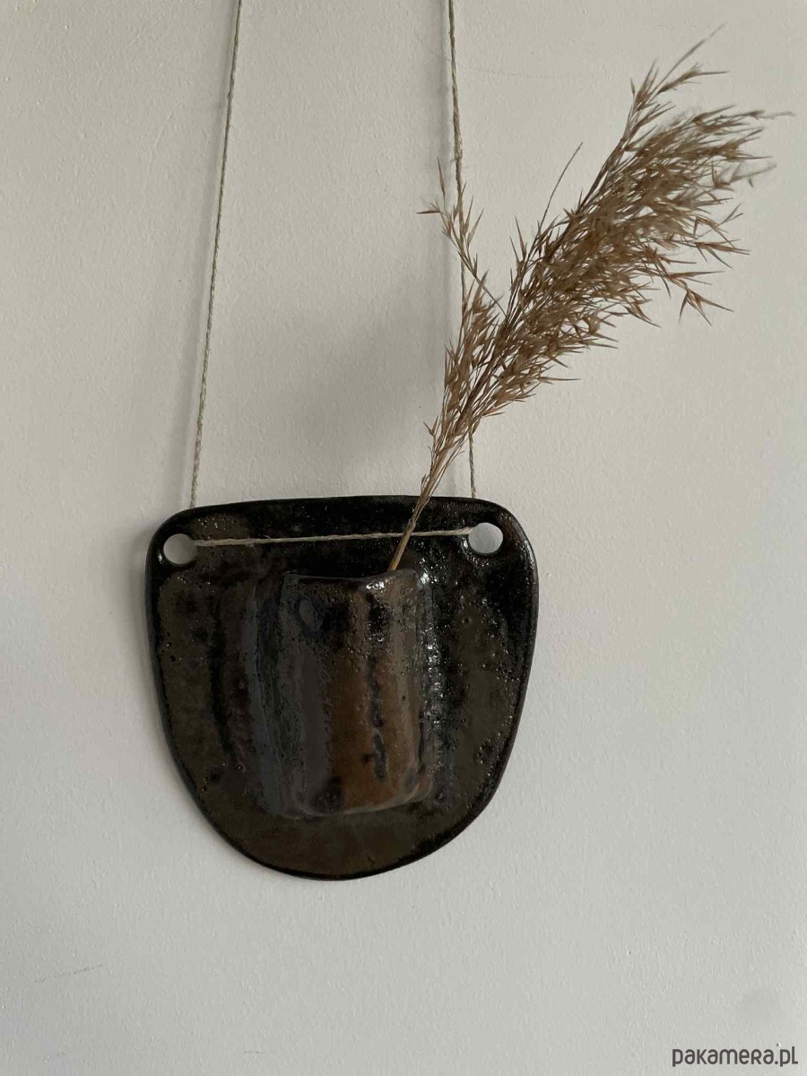 Ma kształt półowalu lub zaokrąglonej tarczy, z przodu której znajduje się niewielka, cylindryczna kieszeń na pojedynczą roślinę lub suszoną trawę. Glazura jest ciemna, w odcieniach czerni, grafitu i brązu, z nieregularnymi, lekko spływającymi przebarwieniami, co nadaje mu rustykalny, rzemieślniczy charakter. Powierzchnia wygląda na półmatową z delikatnym połyskiem w zagłębieniach.