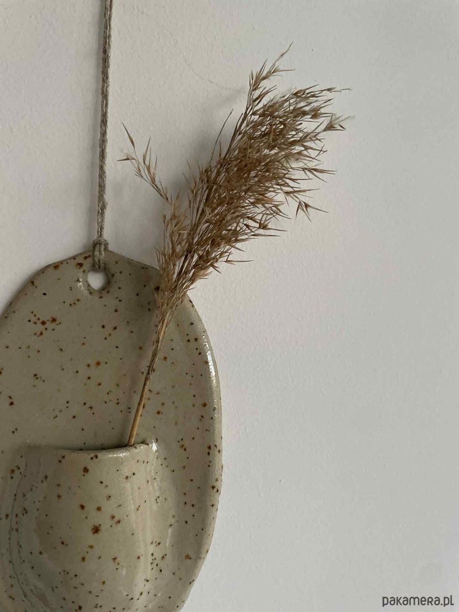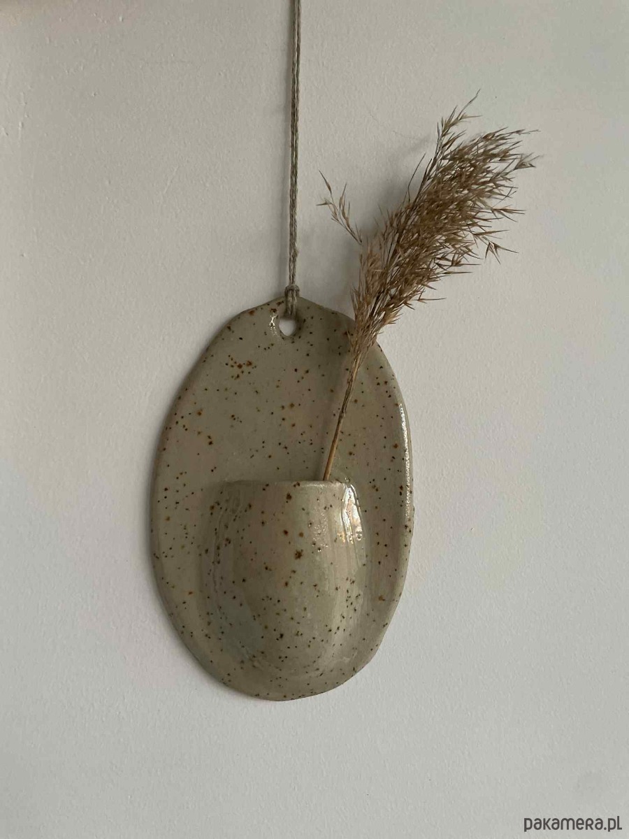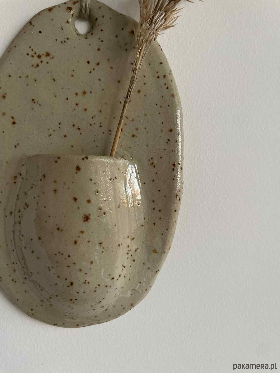 Ceramiczny wazon naścienny o miękkiej, organicznej formie, wykonany z jasnej gliny z naturalnymi drobinkami (szamotem), które tworzą charakterystyczny nakrapiany wzór. Te „kropki” są elementem samej masy ceramicznej, a nie efektem szkliwa, co podkreśla jego surowy, naturalny charakter.