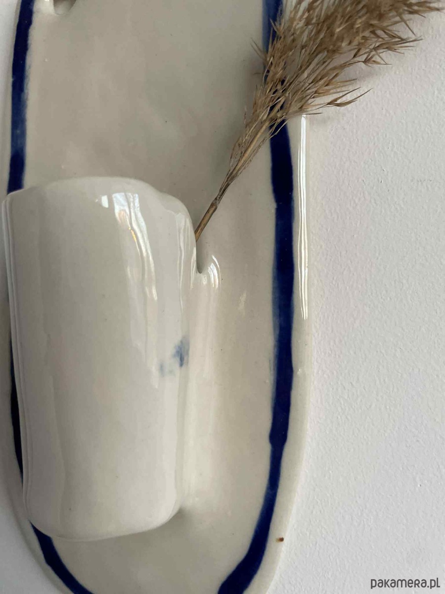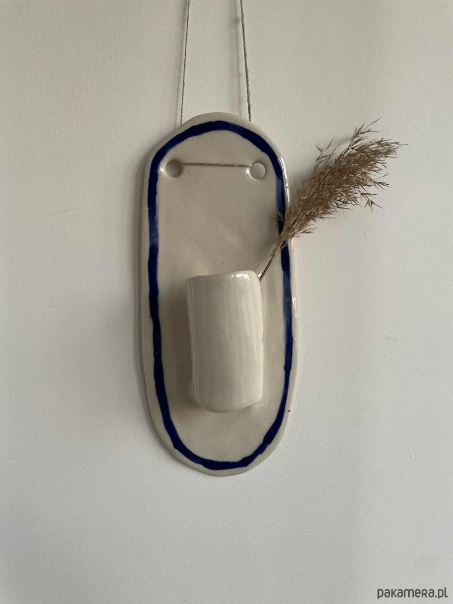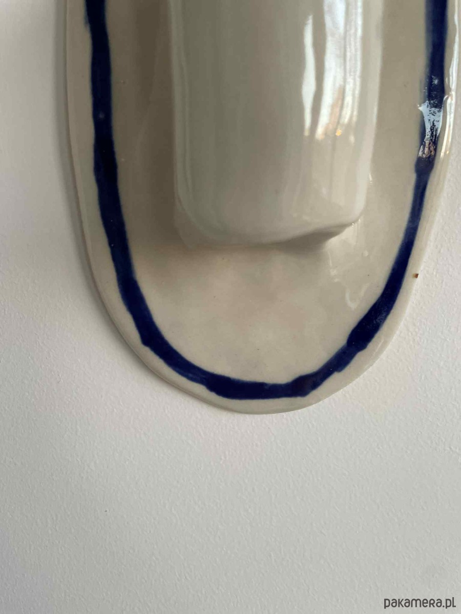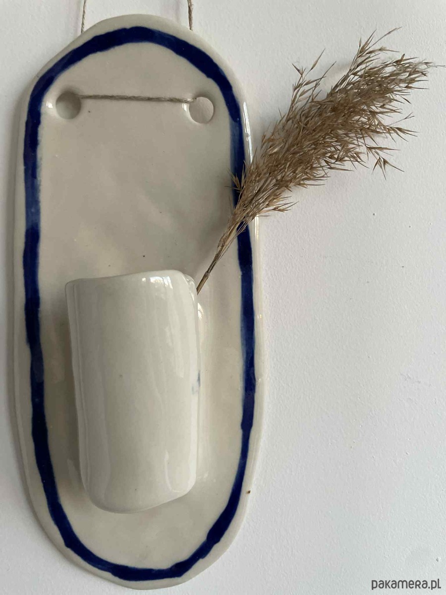 Ceramiczny wazon naścienny o miękkiej, organicznej formie, wykonany z jasnej gliny z kobaltowym nierównym obrysem. Ma mały defekt widoczny na zdjęciu - przybrudzenie szkliwem.