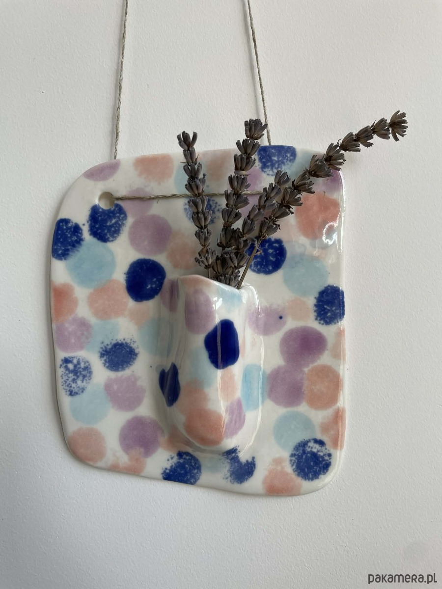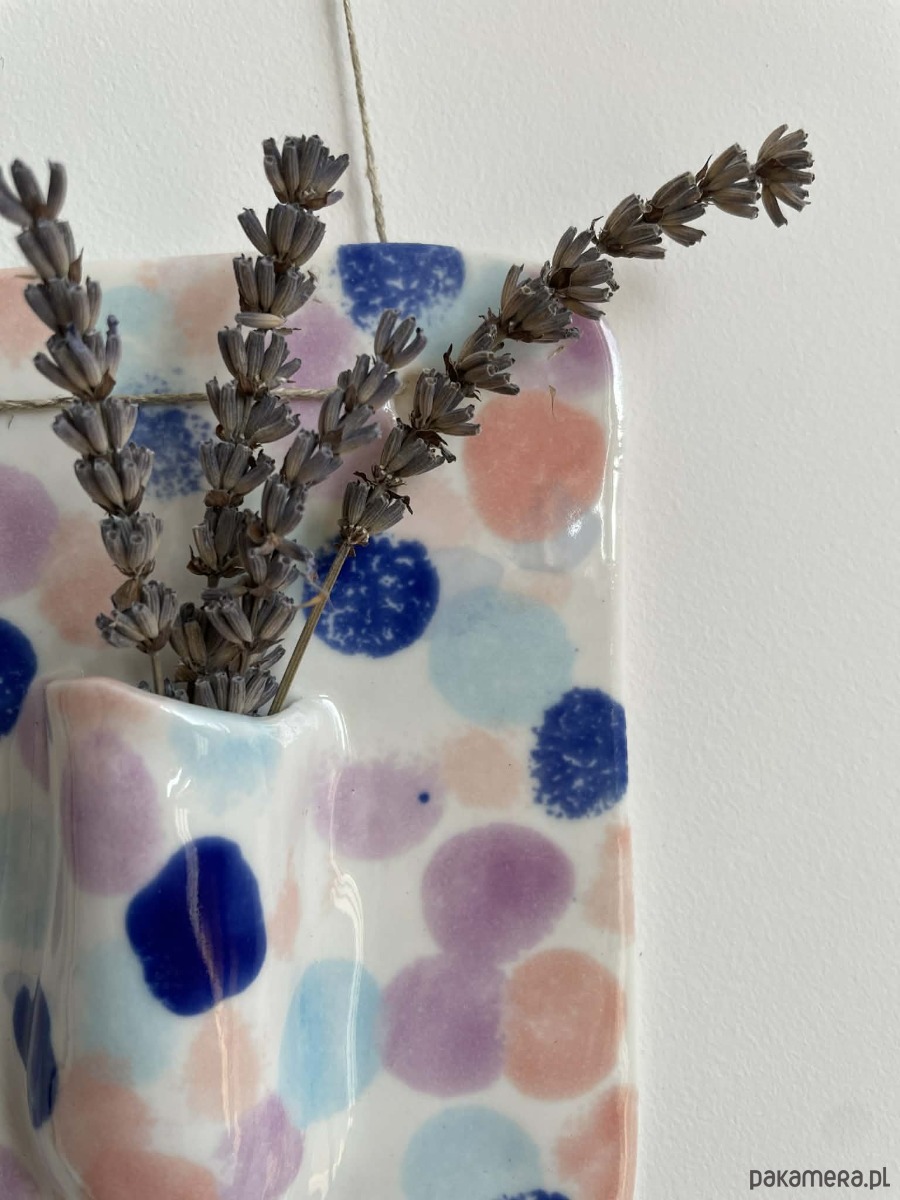 To porcelanowy wazon naścienny o lekkiej, radosnej formie i dekoracyjnym charakterze.