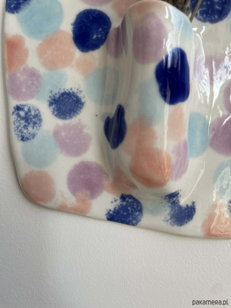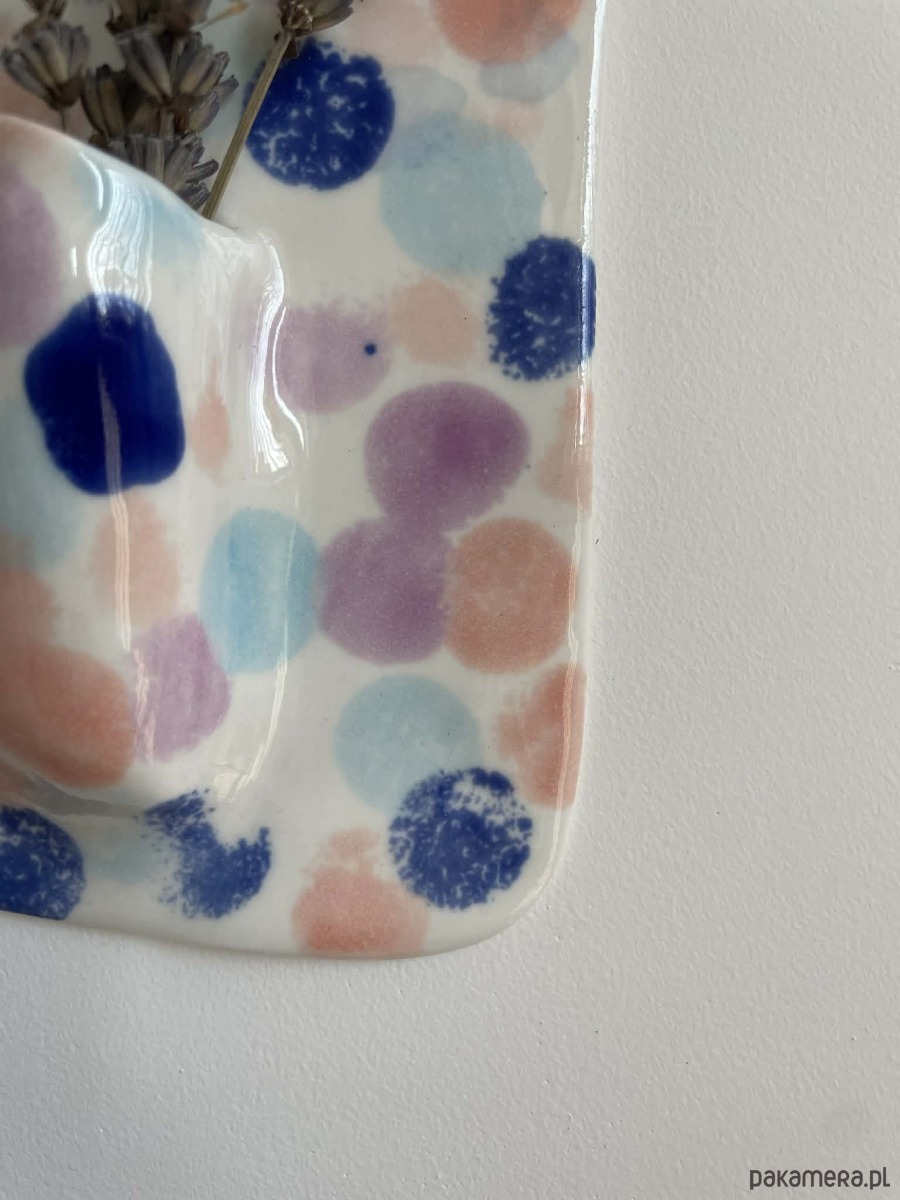 Ma kształt prostokątnej płytki z miękko zaokrąglonymi rogami. Powierzchnia pokryta jest przezroczystym szkliwem, na którym pojawiają się nieregularne, malarskie plamy w odcieniach kobaltu, błękitu, pastelowego różu i lawendy. Kolorowe kropki mają miękkie, rozproszone krawędzie, dzięki czemu tworzą swobodny, artystyczny wzór przypominający akwarelowe odbicia.