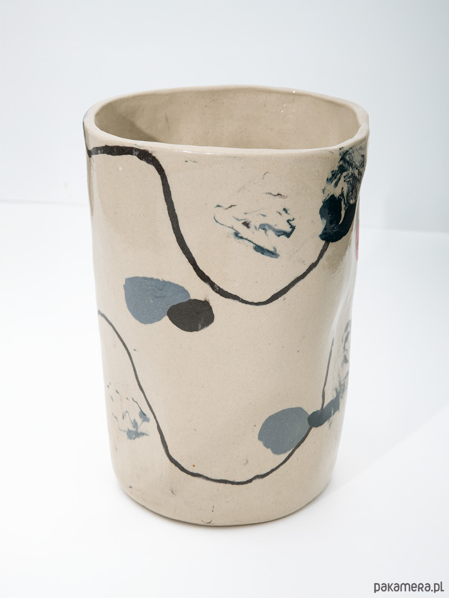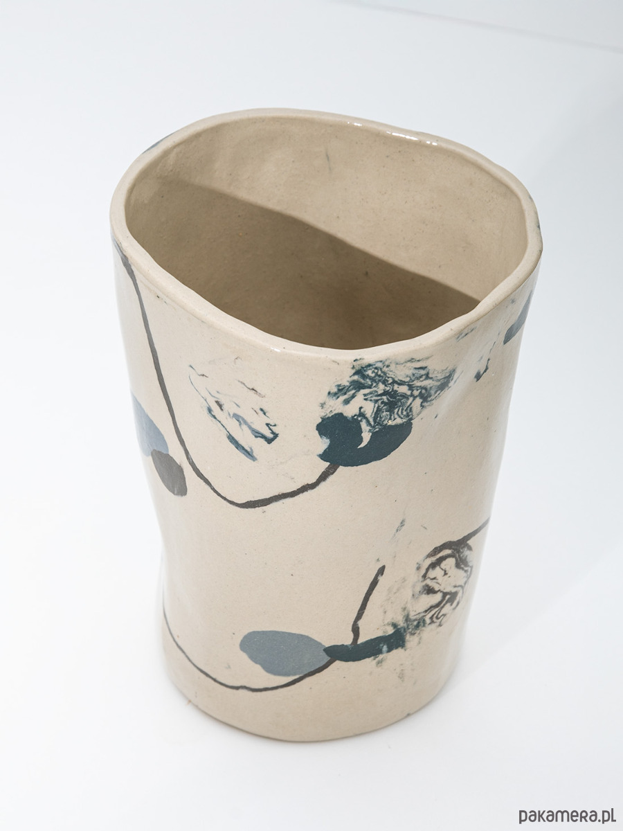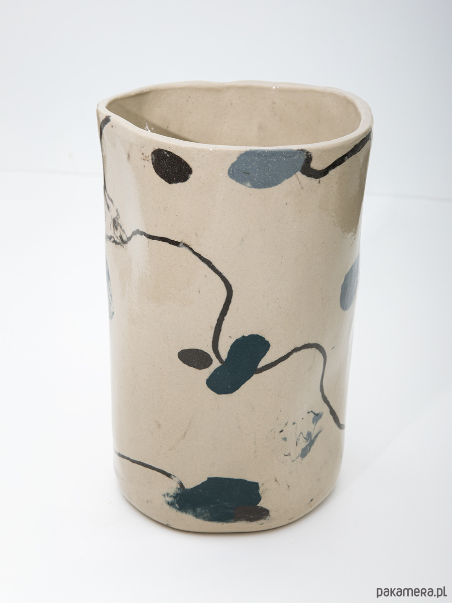 Wazon ceramiczny wykonany z beżowej gliny, pokryty transparentnym szkliwem. Ma prostą, cylindryczną a zarazem nieregularną formę.