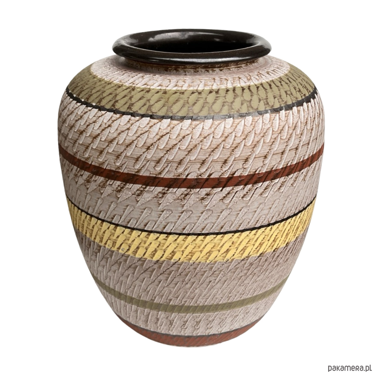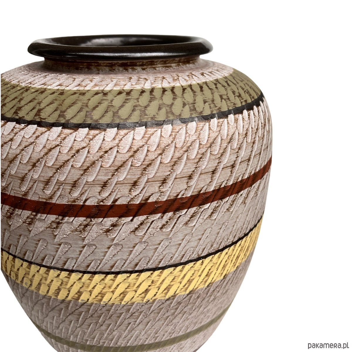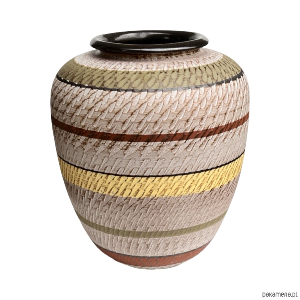 Efektowny wazon podłogowy z lat 60./70. XX wieku, wyprodukowany przez renomowaną niemiecką manufakturę Dümler & Breiden. Model w stylu Faux Klinker, charakterystyczny dla epoki mid-century modern — o fakturowanej powierzchni i geometrycznym układzie pasów w odcieniach beżu, żółci, brązu i oliwki.
