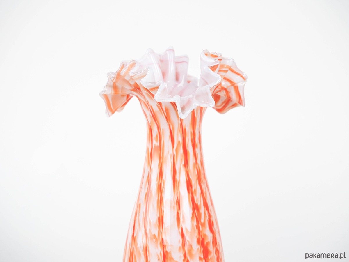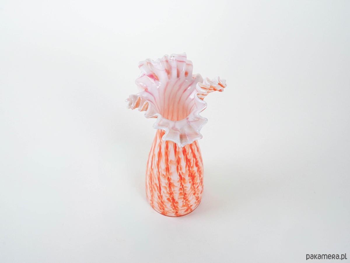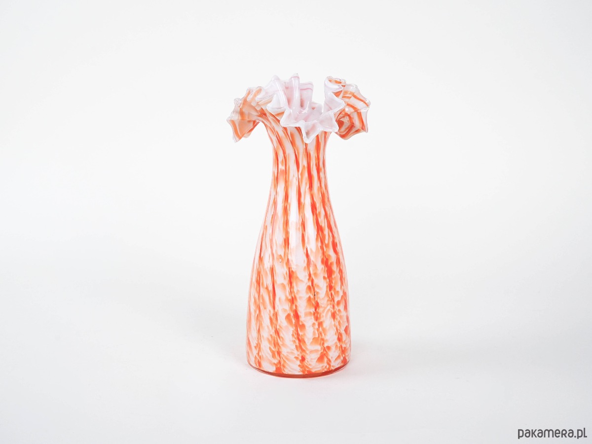 Efektowny wazon wykonany ze szkła artystycznego w odcieniach pomarańczu, czerwieni i bieli, z wyraźnym efektem millefiori i spiralnego wzoru (latticino). Rozchylone, falujące brzegi podkreślają ręczne wykonanie i nadają całości dynamicznej formy. Wazon nawiązuje do szklarskich tradycji Murano, gdzie od XIX wieku mistrzowie stosowali techniki barwienia i łączenia kolorowych prętów szklanych w dekoracyjne, organiczne kompozycje. Oryginalny egzemplarz vintage, powstały w latach 60./70., o wysokich walorach kolekcjonerskich. Idealny jako obiekt dekoracyjny, wpisujący się w klimat retro i kolekcje szkła artystycznego.