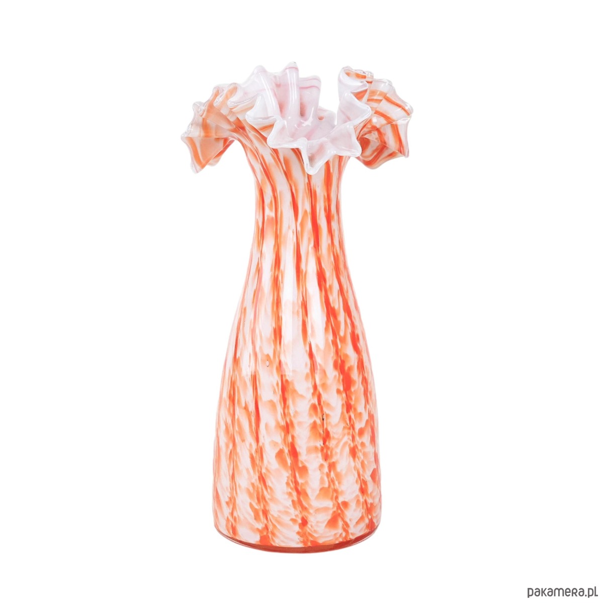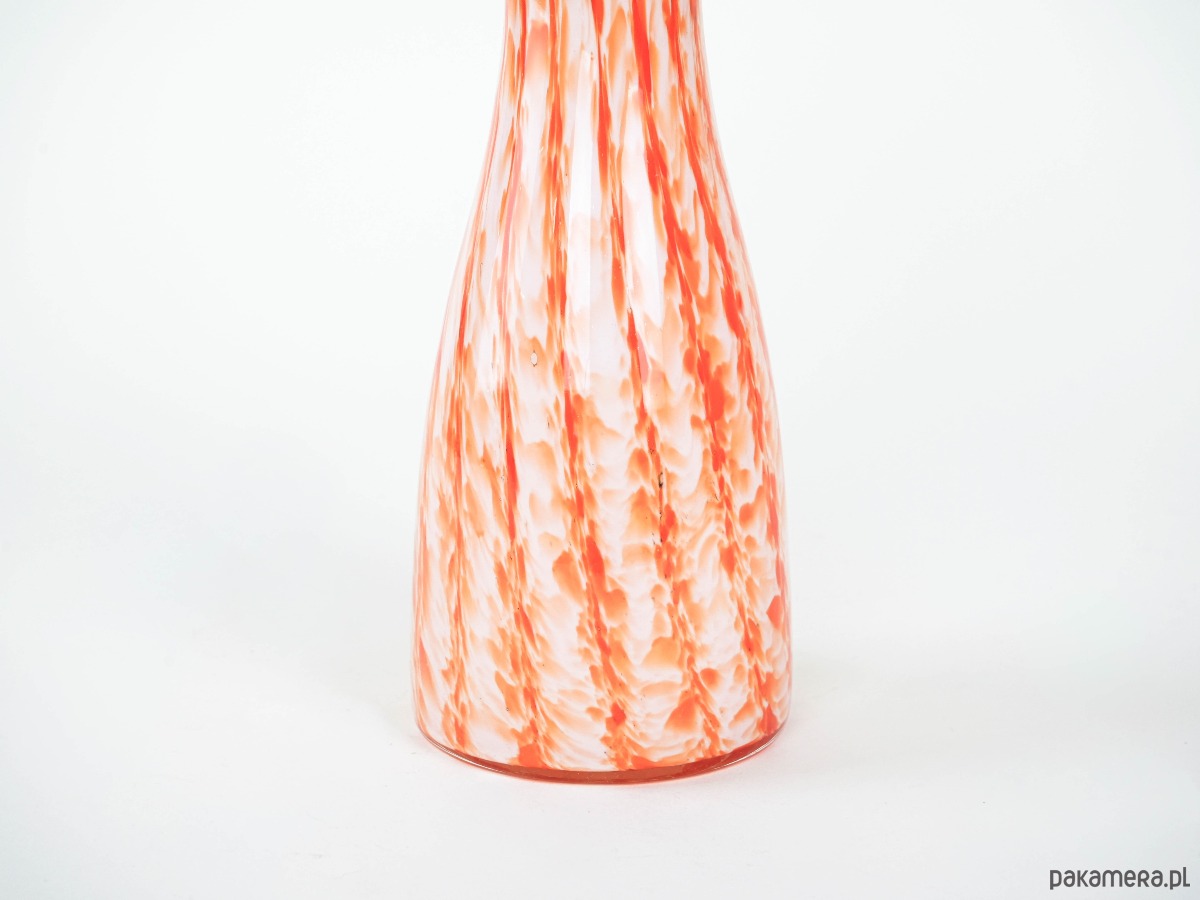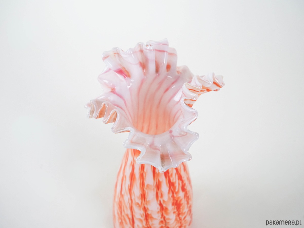 Efektowny wazon wykonany ze szkła artystycznego w odcieniach pomarańczu, czerwieni i bieli, z wyraźnym efektem millefiori i spiralnego wzoru (latticino). Rozchylone, falujące brzegi podkreślają ręczne wykonanie i nadają całości dynamicznej formy. Wazon nawiązuje do szklarskich tradycji Murano, gdzie od XIX wieku mistrzowie stosowali techniki barwienia i łączenia kolorowych prętów szklanych w dekoracyjne, organiczne kompozycje. Oryginalny egzemplarz vintage, powstały w latach 60./70., o wysokich walorach kolekcjonerskich. Idealny jako obiekt dekoracyjny, wpisujący się w klimat retro i kolekcje szkła artystycznego.