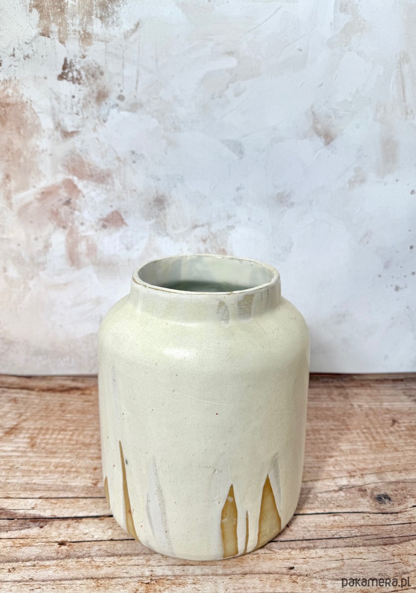 Unikatowy, ręcznie wykonany wazon z jasnej gliny, pokryty subtelnym, jasnym matowym szkliwem. Naturalny, lekko kremowy odcień w połączeniu z nieregularnymi spływami szkliwa tworzy efekt organicznej prostoty i ponadczasowej elegancji.