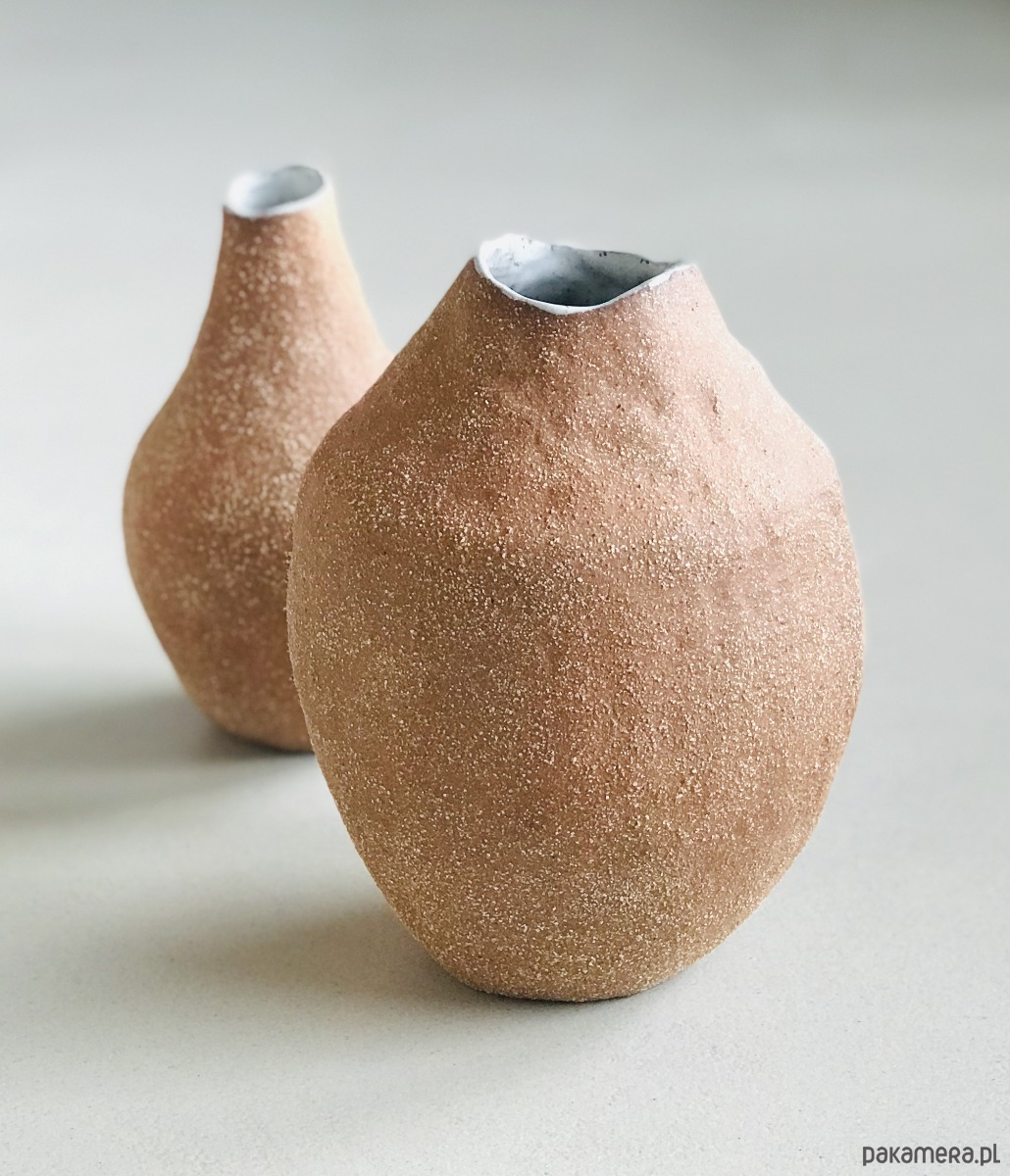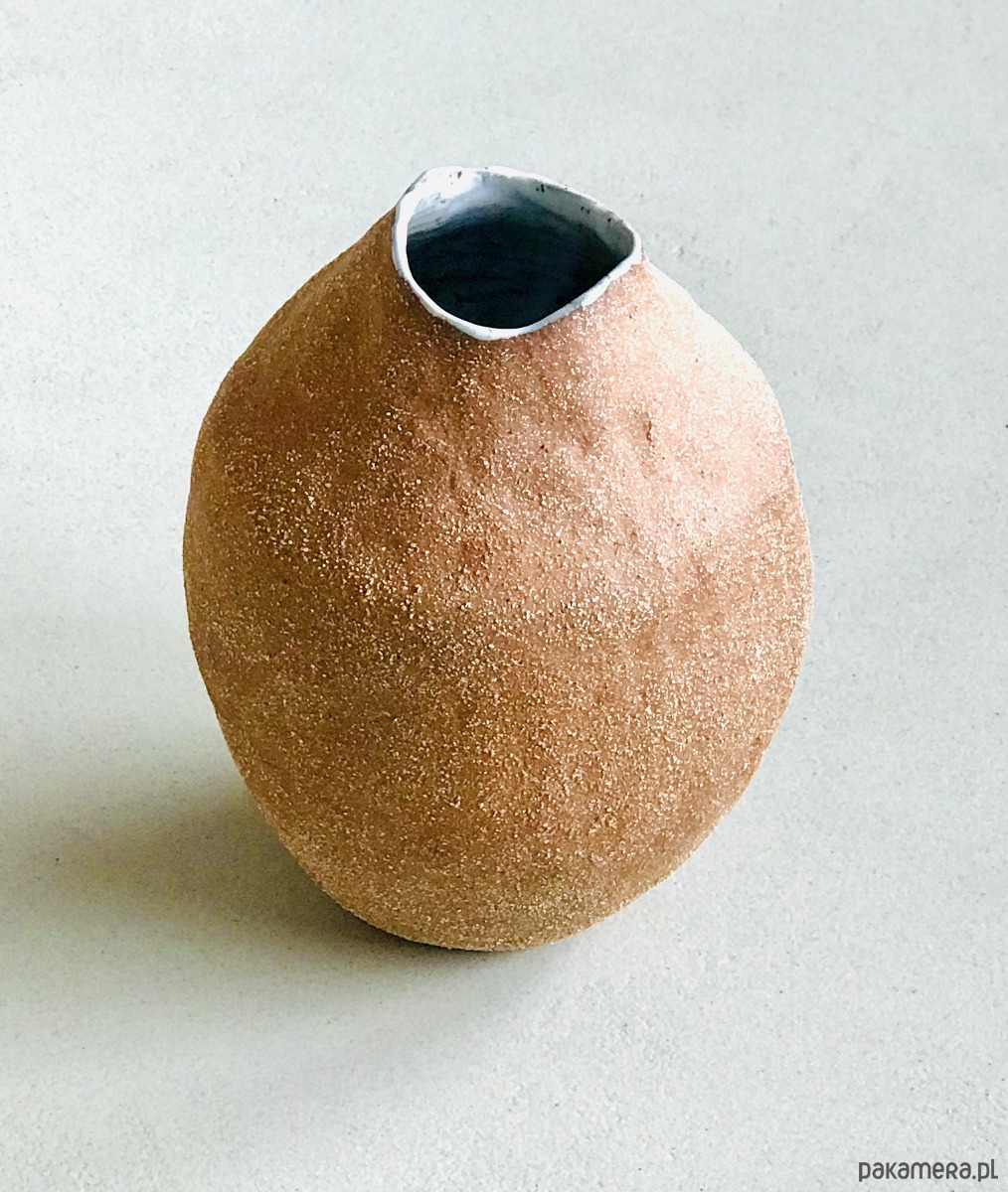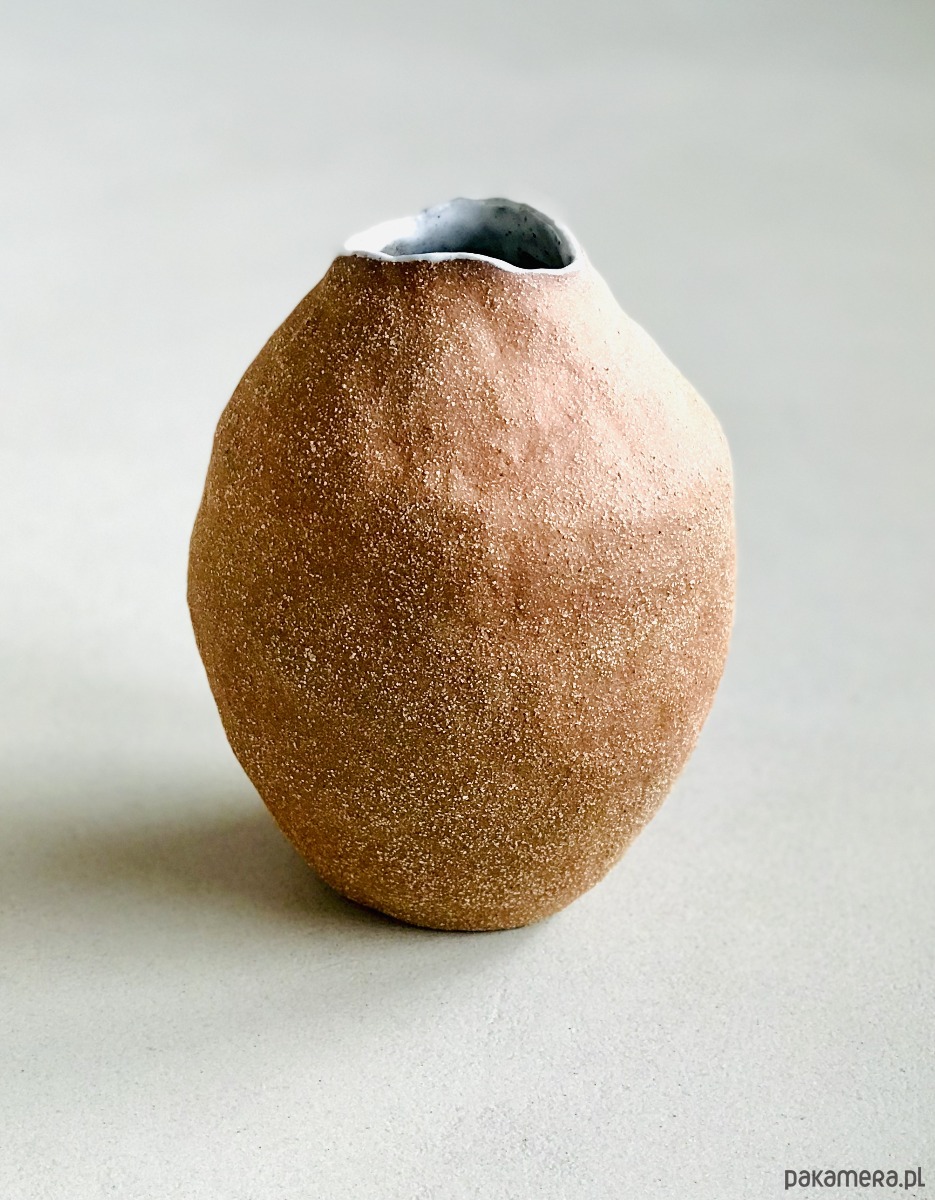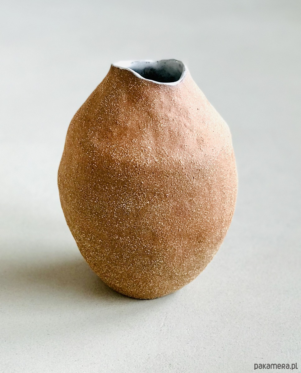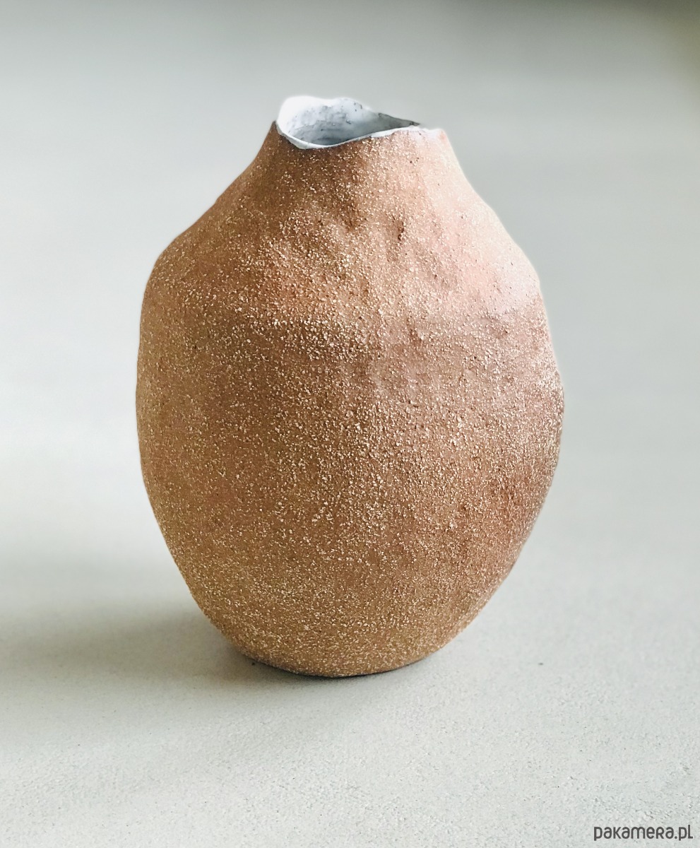 Wazon został wykonany z czerwonej, szamotowej gliny a jego wnętrze pokryte białym, nakrapianym szkliwem. Uwydatniona faktura gliny nadaje ceramice oryginalny, rustykalny charakter.