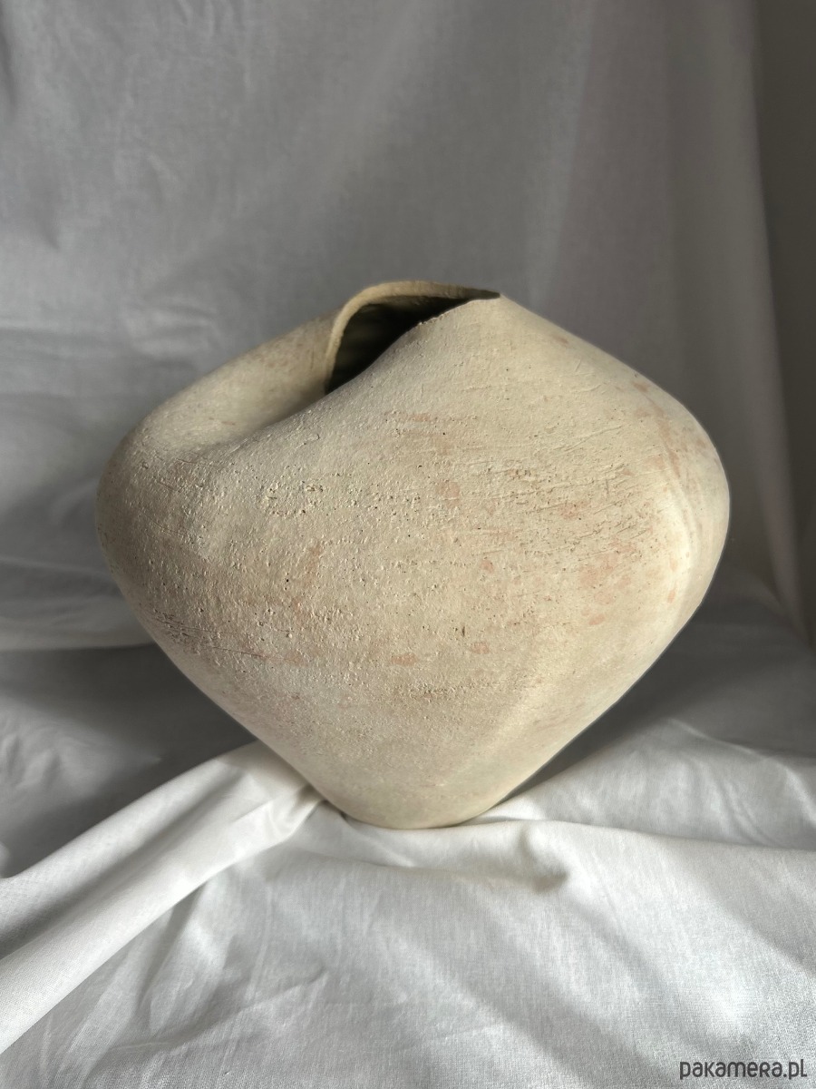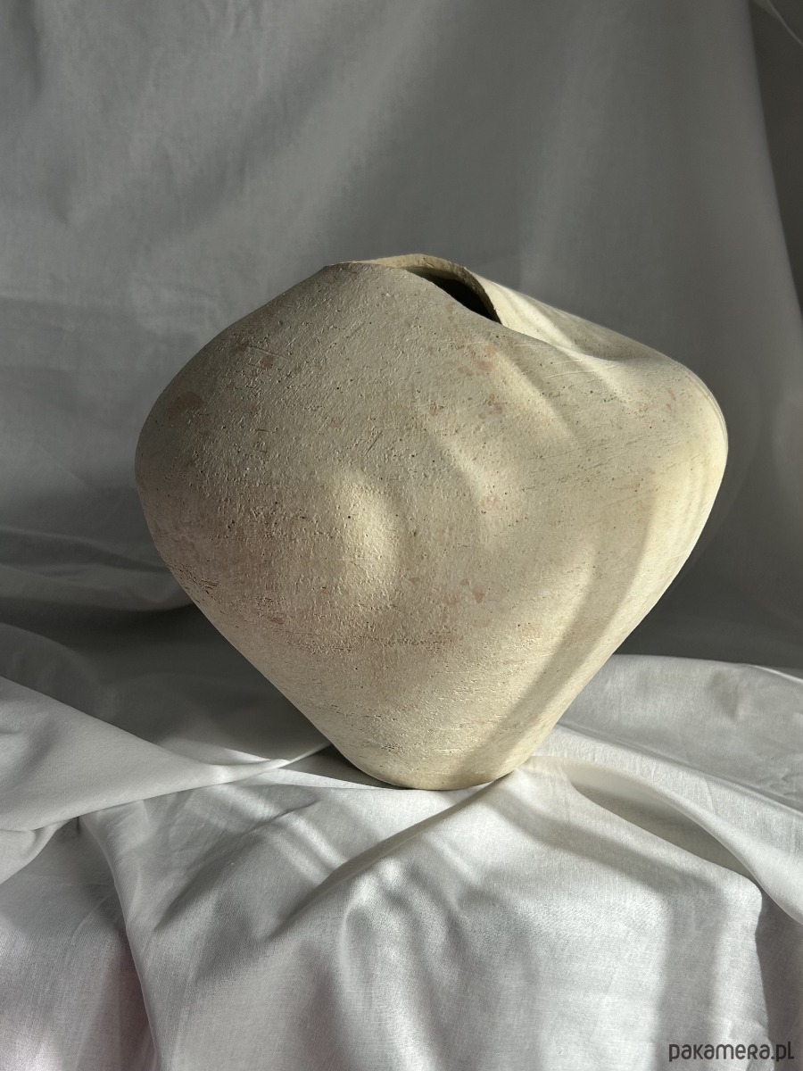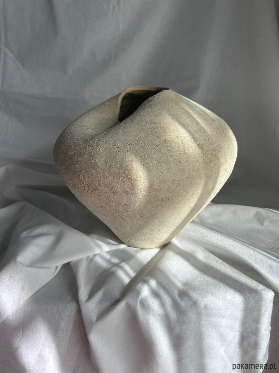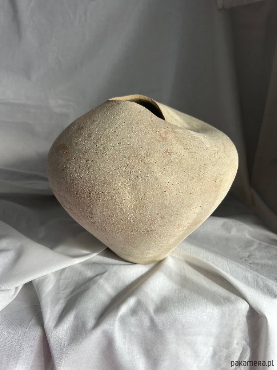Ten unikatowy wazon ceramiczny powstaje w całości ręcznie, bez użycia form i koła garncarskiego. Formowany w powolnym, intuicyjnym procesie, a następnie rzeźbiony, zyskuje miękką, organiczną linię i subtelną, nieregularną sylwetkę. Jego forma jest zamknięta, pełna i lekko asymetryczna, z delikatnie otwartym, nieregularnym wlotem, który nadaje mu rzeźbiarski charakter.