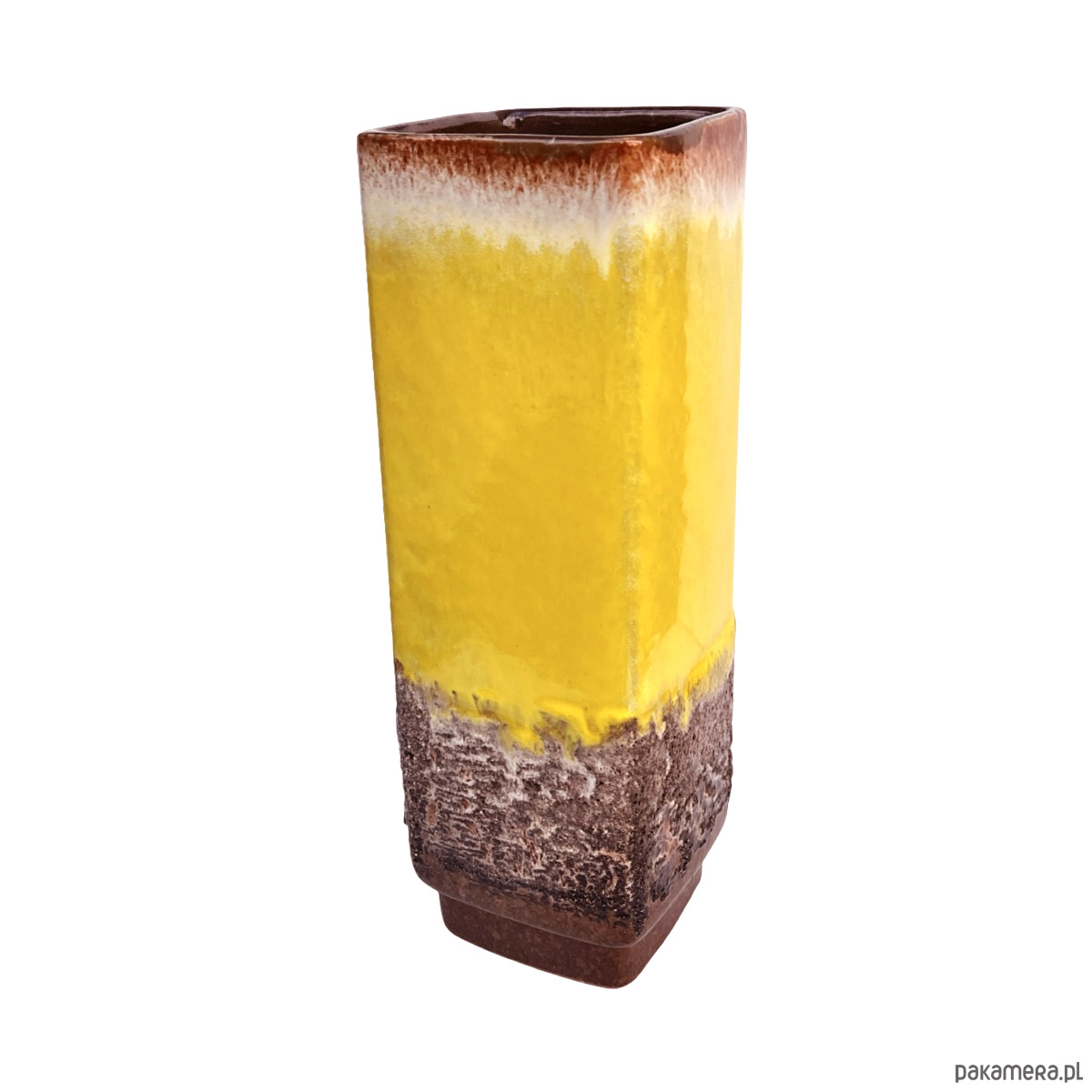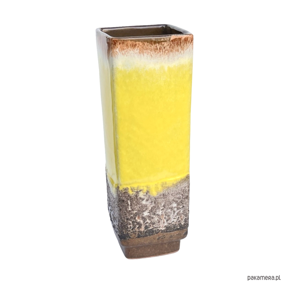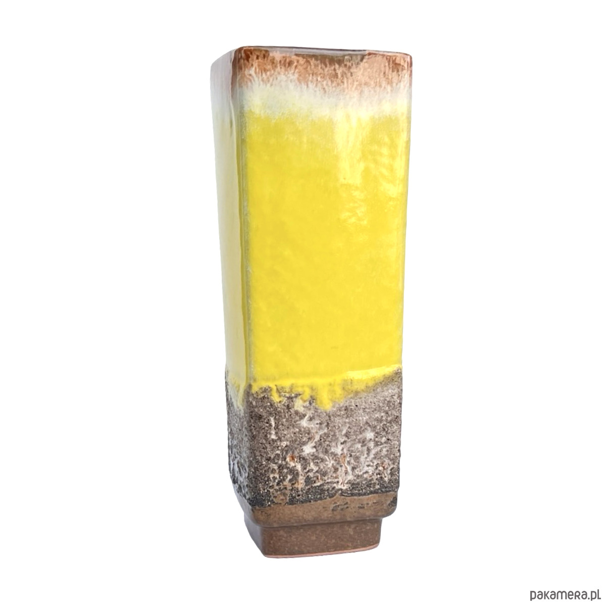 Oryginalny wazon ceramiczny z wytwórni Strehla Keramik (NRD), model 1224/24, charakterystyczny dla estetyki lat 60. i 70. Wyróżnia się żywą, żółtą glazurą typu fat lava, która przechodzi w białe i brązowe tony w górnej części, oraz w teksturowaną, wulkaniczną glazurę u podstawy. Minimalistyczna, prostokątna forma doskonale łączy się z energetycznym wykończeniem, typowym dla produkcji Strehli z tego okresu.