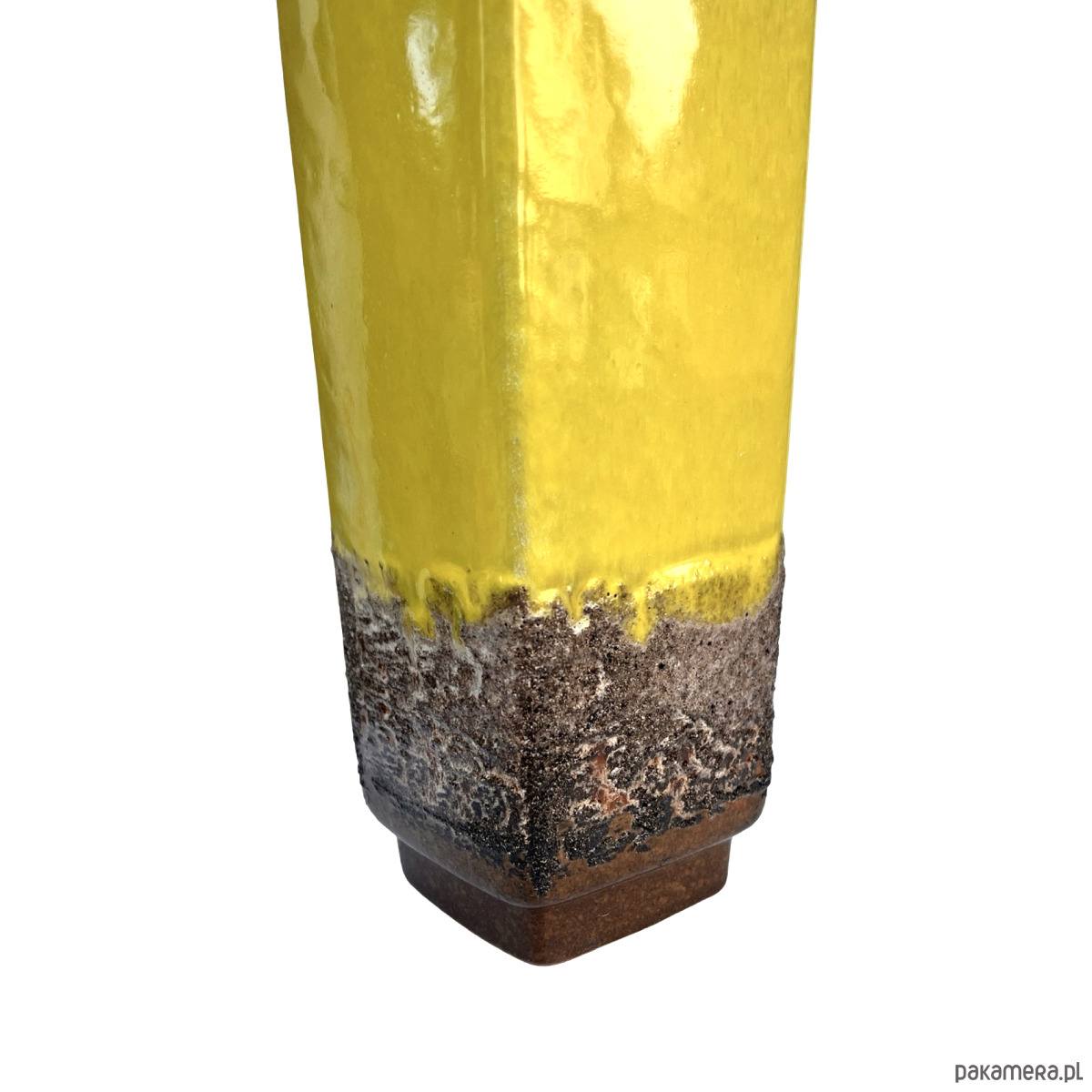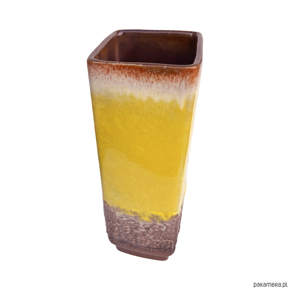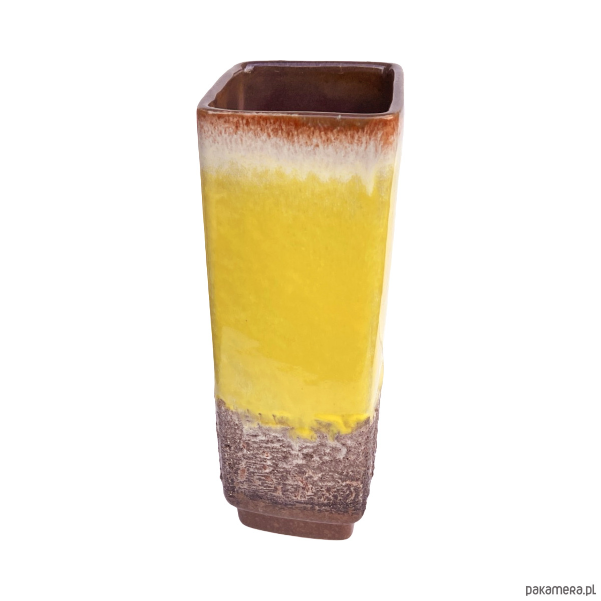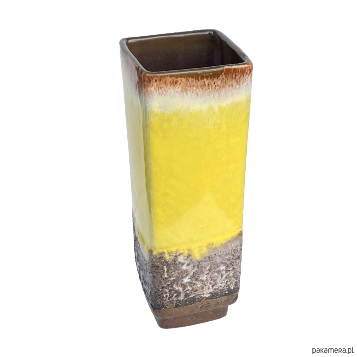 Oryginalny wazon ceramiczny z wytwórni Strehla Keramik (NRD), model 1224/24, charakterystyczny dla estetyki lat 60. i 70. Wyróżnia się żywą, żółtą glazurą typu fat lava, która przechodzi w białe i brązowe tony w górnej części, oraz w teksturowaną, wulkaniczną glazurę u podstawy. Minimalistyczna, prostokątna forma doskonale łączy się z energetycznym wykończeniem, typowym dla produkcji Strehli z tego okresu.