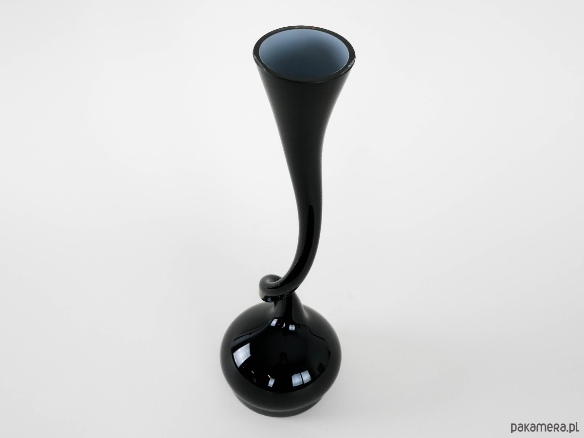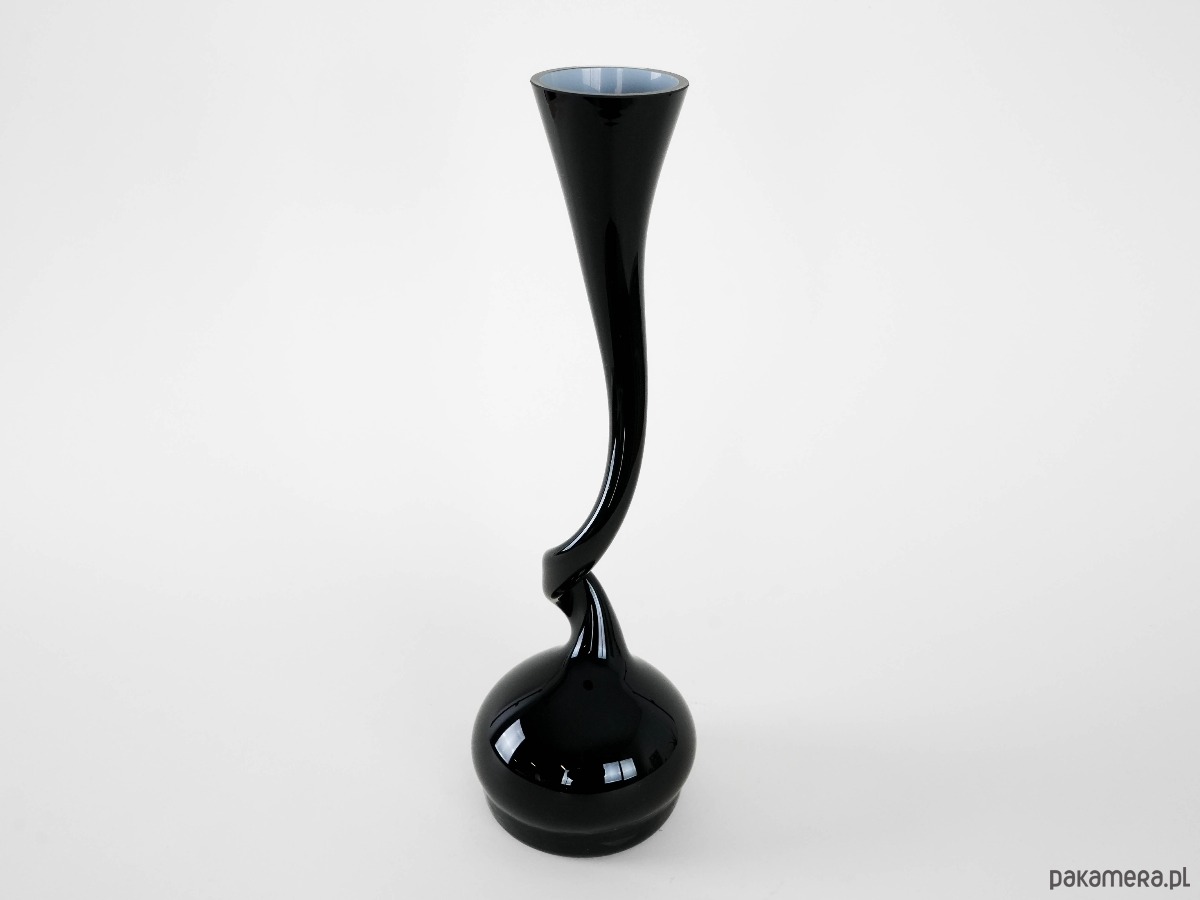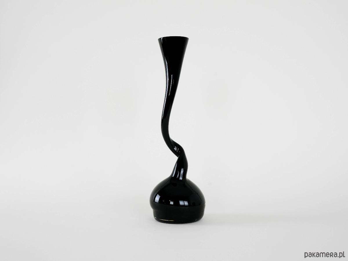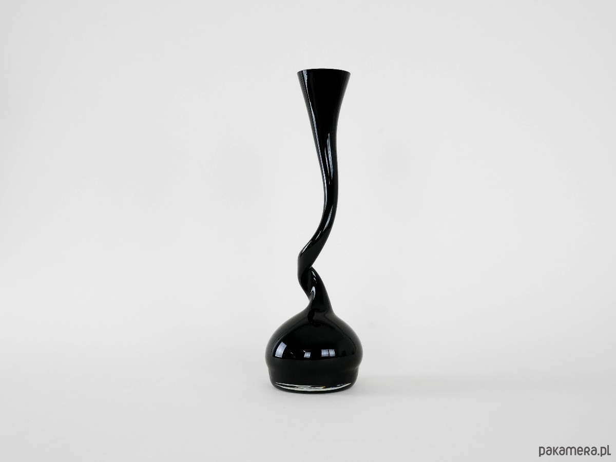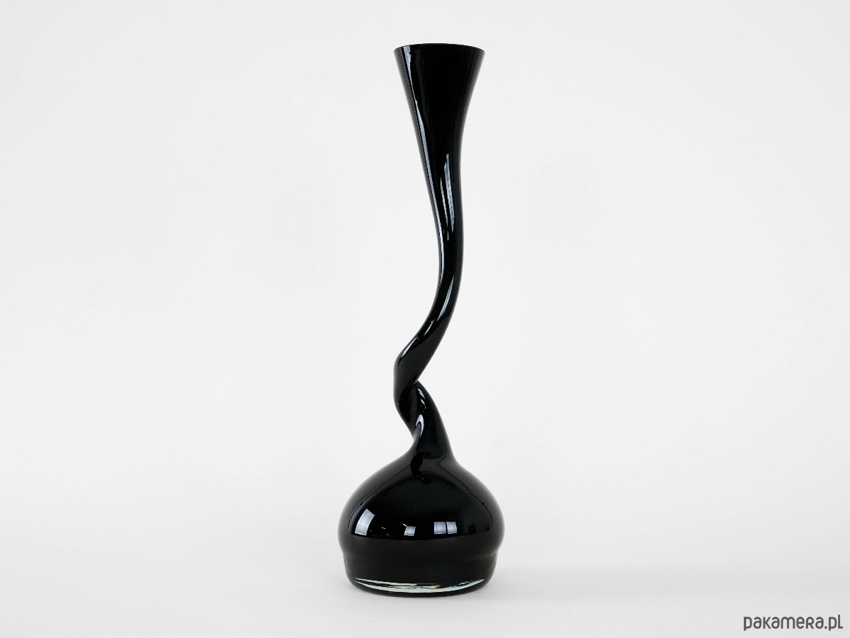 Każdy egzemplarz wykonany ręcznie ze szkła ma niepowtarzalny, organiczny kształt, który nadaje mu rzeźbiarski charakter. Czarne szkło o wysokim połysku i płynna, skręcona linia szyjki tworzą dynamiczną, a zarazem elegancką sylwetkę — idealną jako pojedynczy akcent dekoracyjny w nowoczesnym wnętrzu.