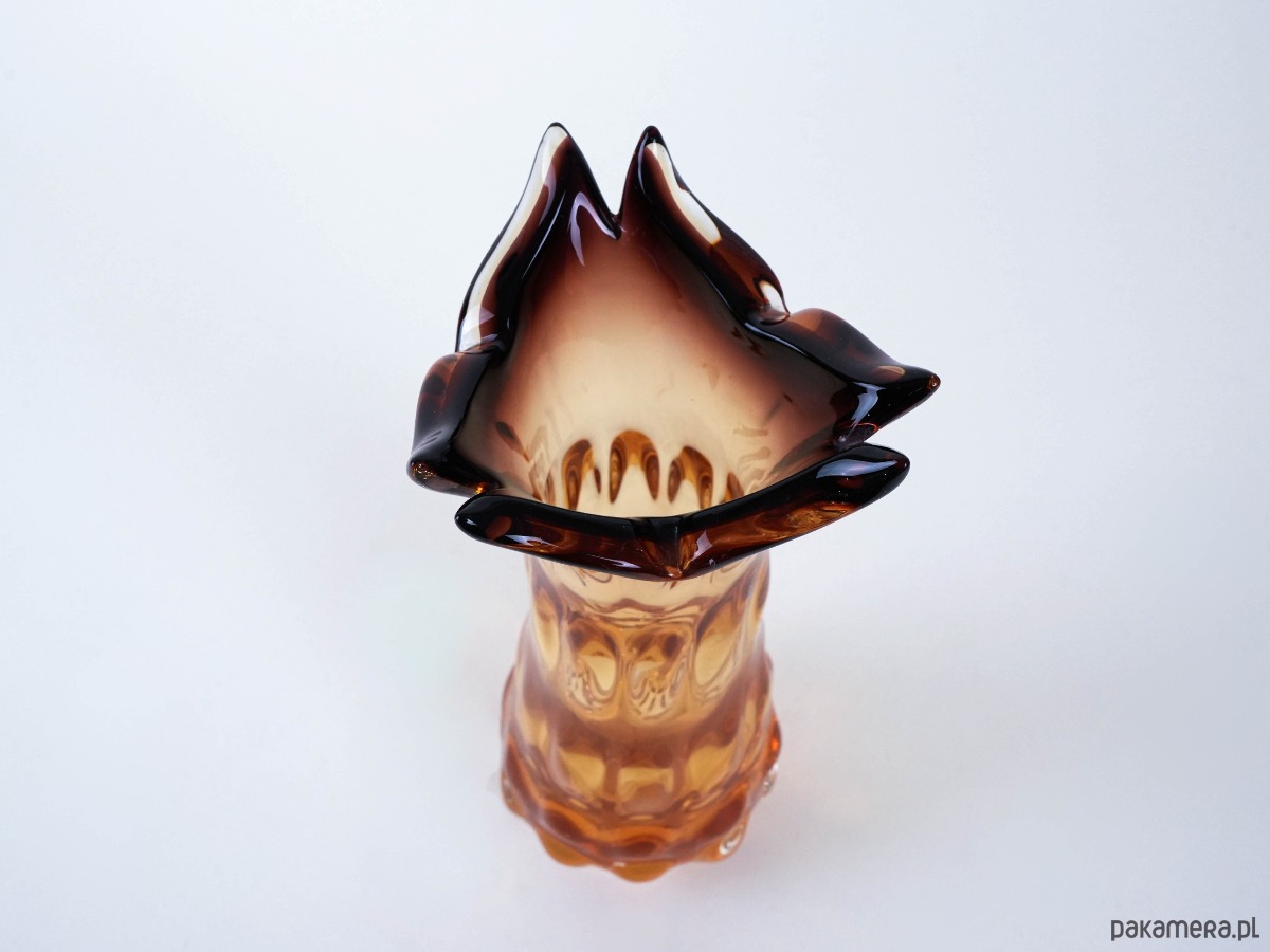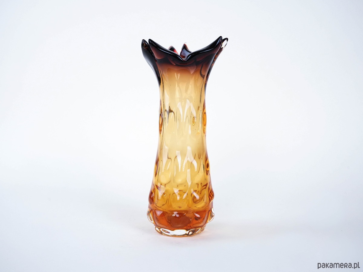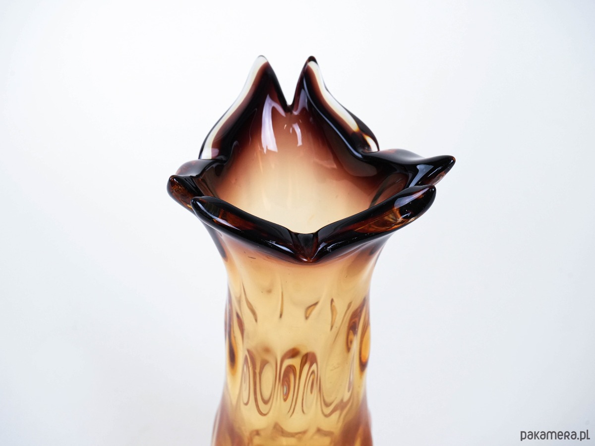 Wazon z lat 60./70., wykonany ze szkła artystycznego w odcieniach bursztynu i śliwki, z dekoracyjnym, nieregularnym rantem. Gradient barw i efektowne detale w strukturze szkła przywodzą na myśl techniki charakterystyczne dla Murano. Oryginalny egzemplarz vintage – ceniony zarówno kolekcjonersko, jak i dekoracyjnie.