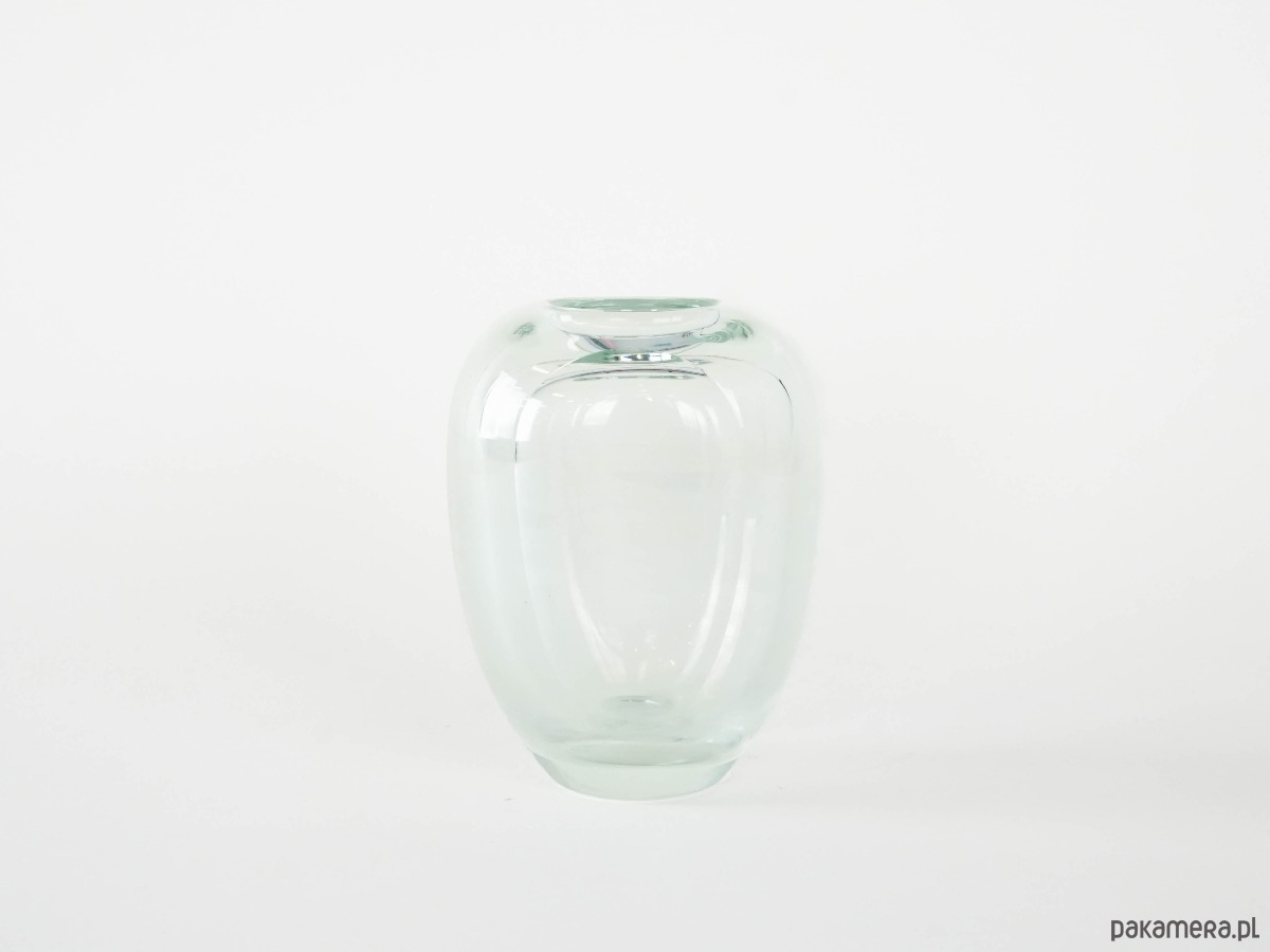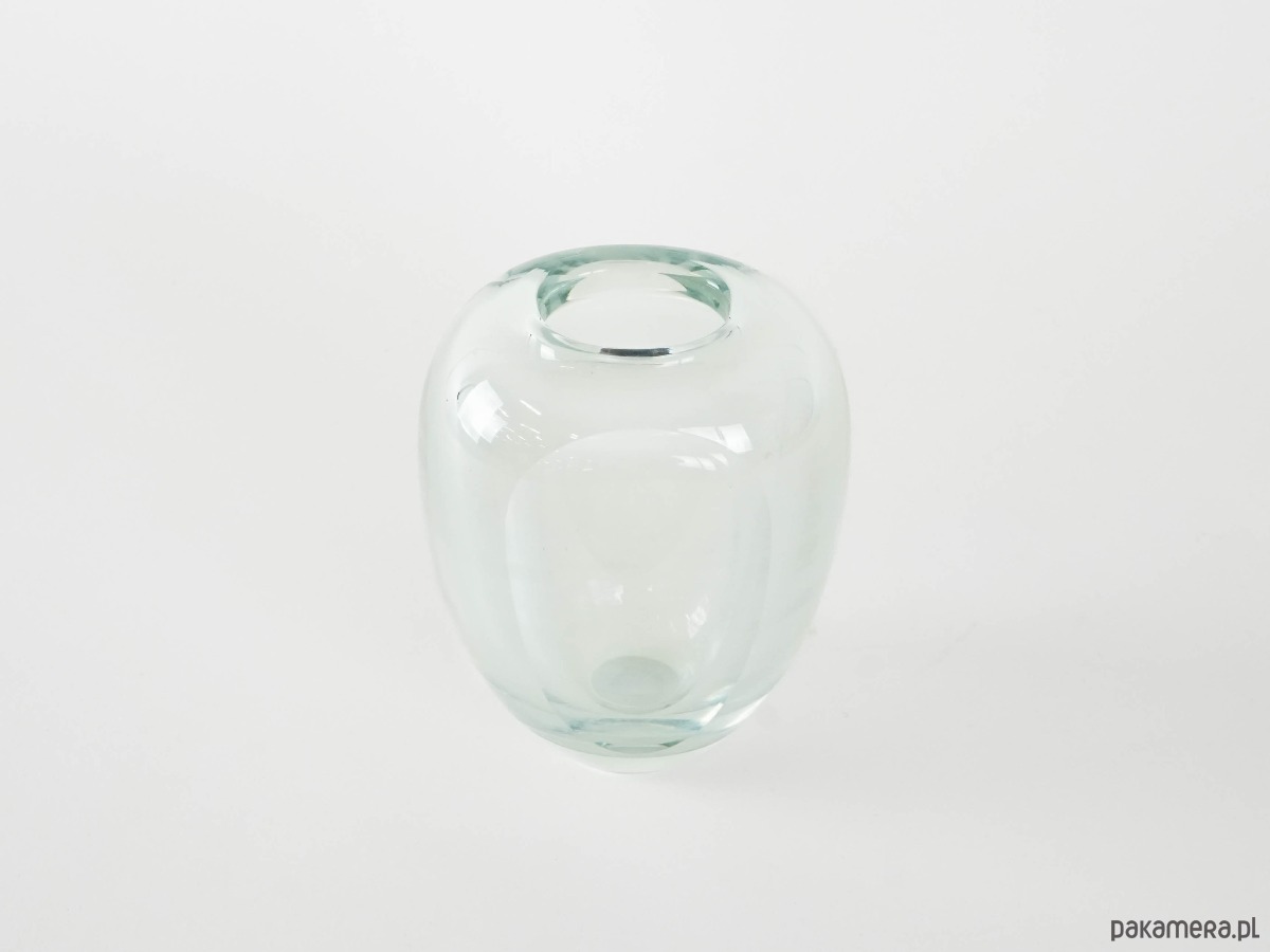 Ręcznie formowany wazon o opływowej, organicznej sylwetce. Wykonany ze szkła o pięknie zaokrąglonych liniach, z charakterystycznymi optycznymi efektami światła wewnątrz ścianek. Powierzchnia matowa. Rzadki przykład duńskiego designu, idealny do kolekcji skandynawskiego szkła art glass.