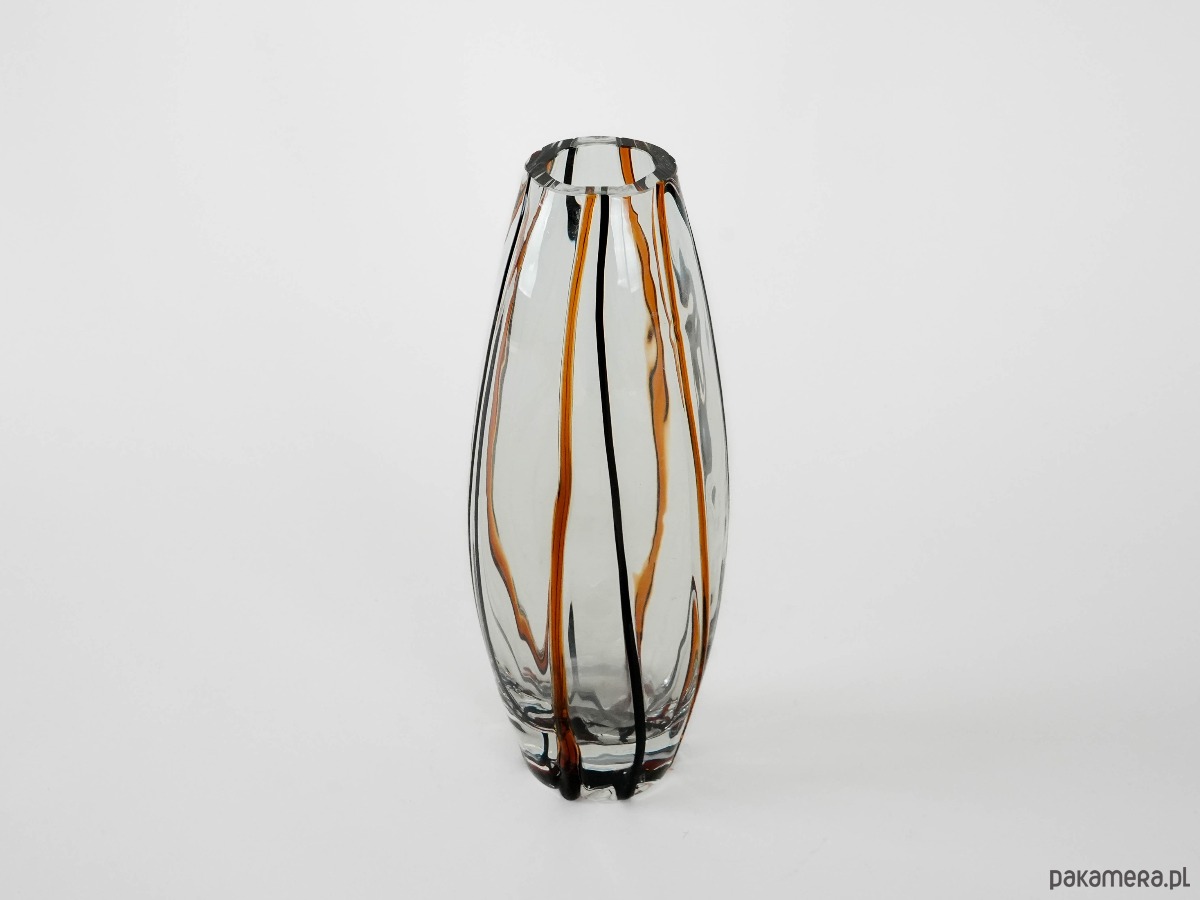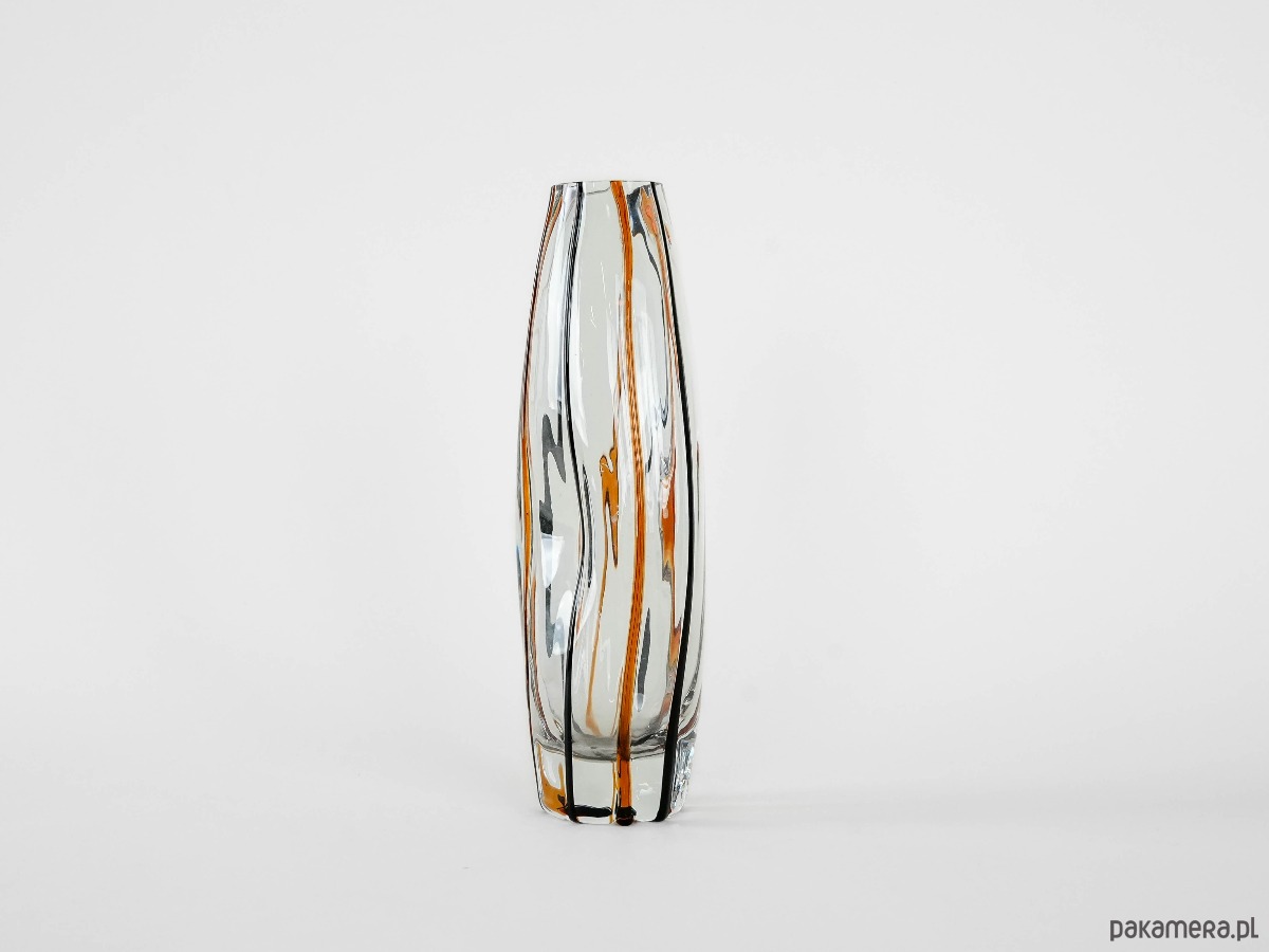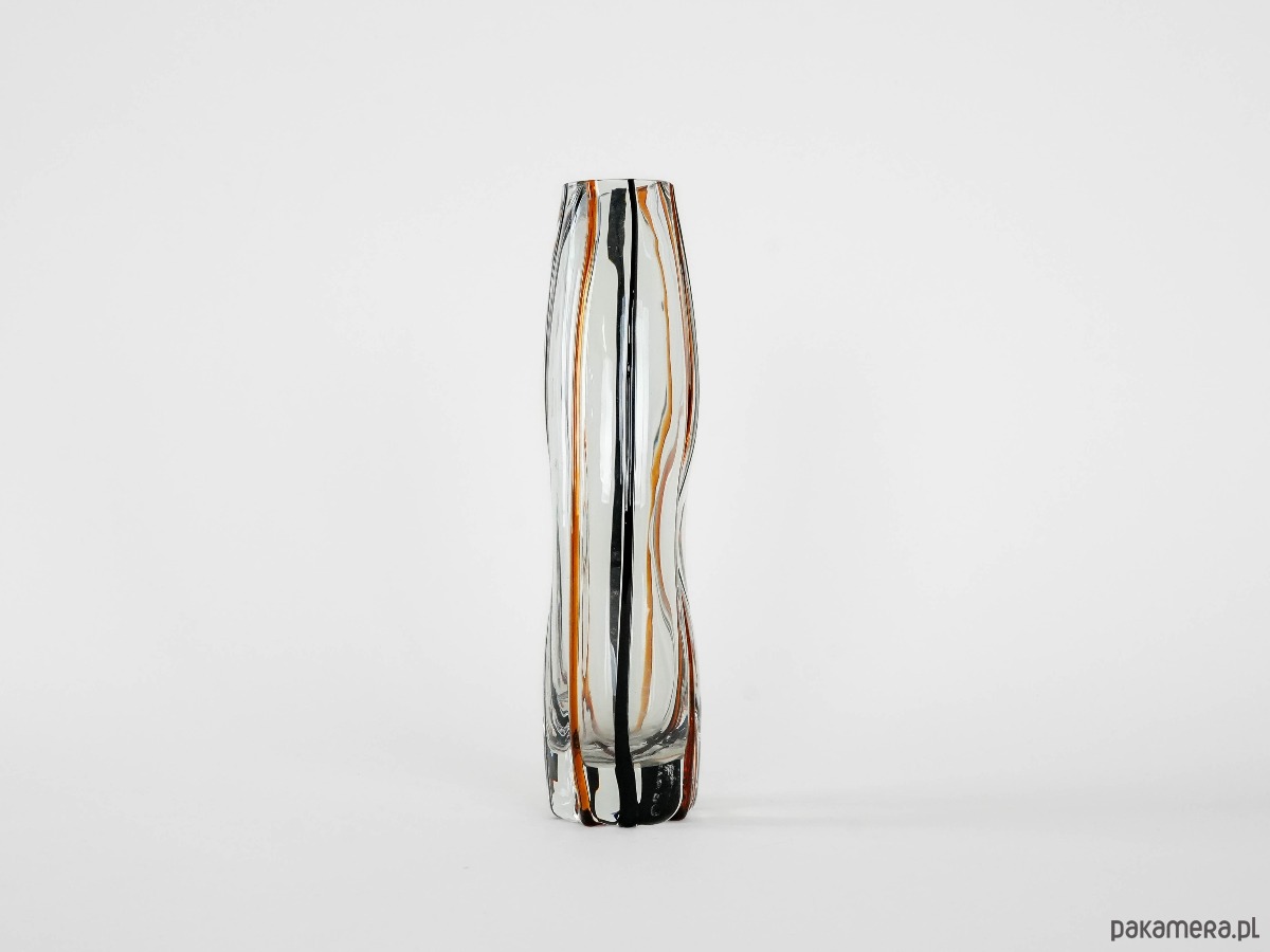 Elegancki, ręcznie formowany wazon z grubego, transparentnego szkła kryształowego z wtopionymi pasami w kolorze bursztynowym i czarnym. Smukła, geometryczna forma o lekko nieregularnym kształcie podkreśla nowoczesny charakter obiektu, a gra światła i barwy nadaje mu wyjątkową głębię. Doskonały przykład rzemiosła artystycznego drugiej połowy XX wieku, idealny do wnętrz w stylu mid-century, modern lub eklektycznym.