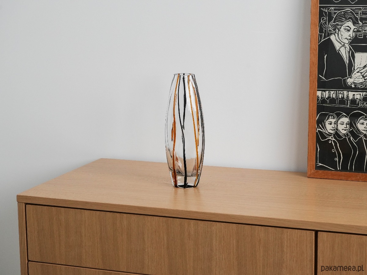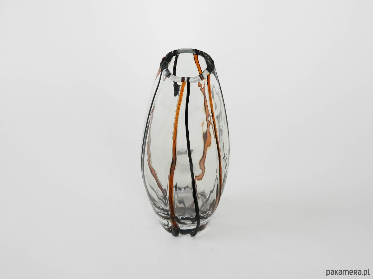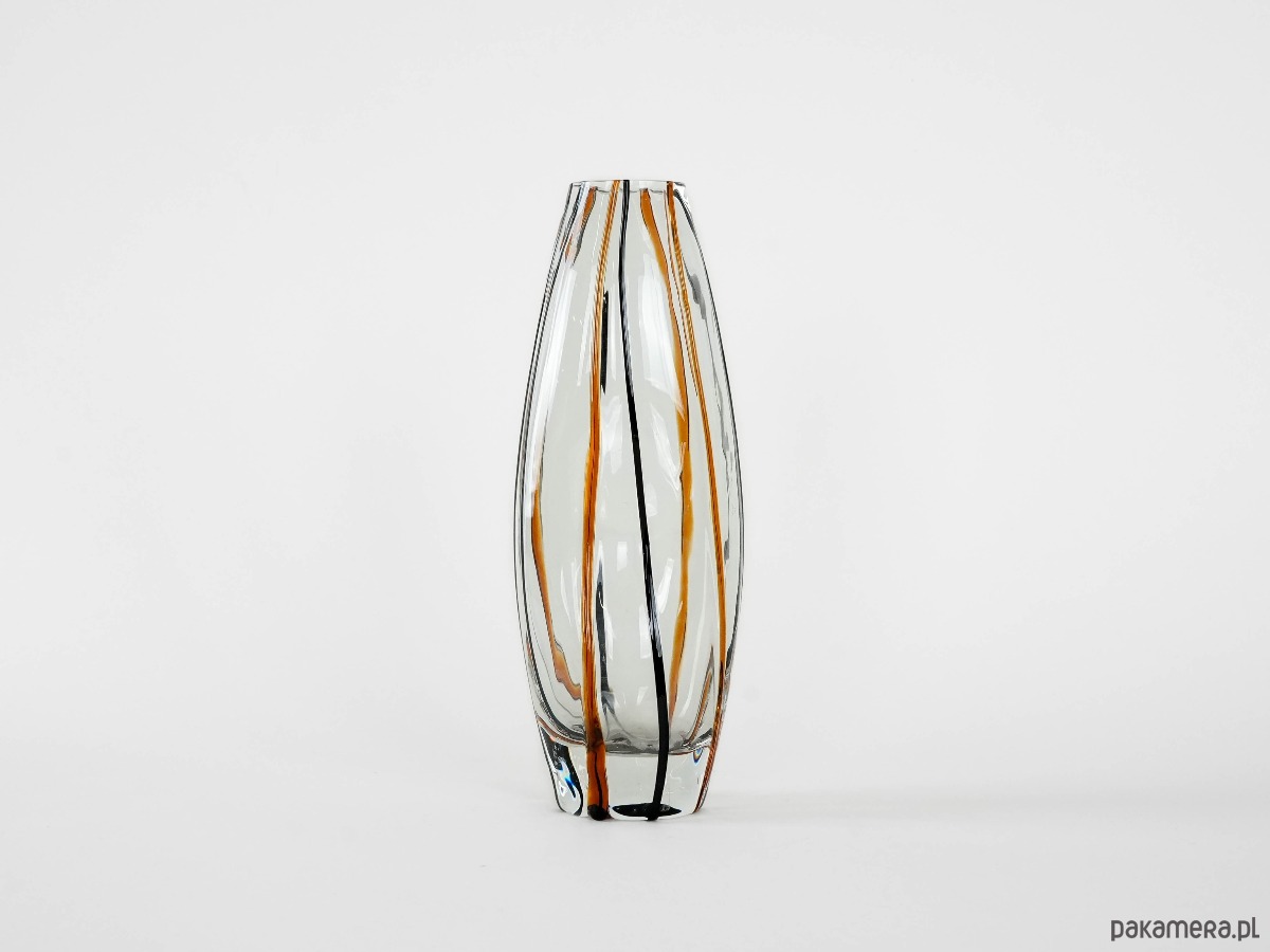 Elegancki, ręcznie formowany wazon z grubego, transparentnego szkła kryształowego z wtopionymi pasami w kolorze bursztynowym i czarnym. Smukła, geometryczna forma o lekko nieregularnym kształcie podkreśla nowoczesny charakter obiektu, a gra światła i barwy nadaje mu wyjątkową głębię. Doskonały przykład rzemiosła artystycznego drugiej połowy XX wieku, idealny do wnętrz w stylu mid-century, modern lub eklektycznym.