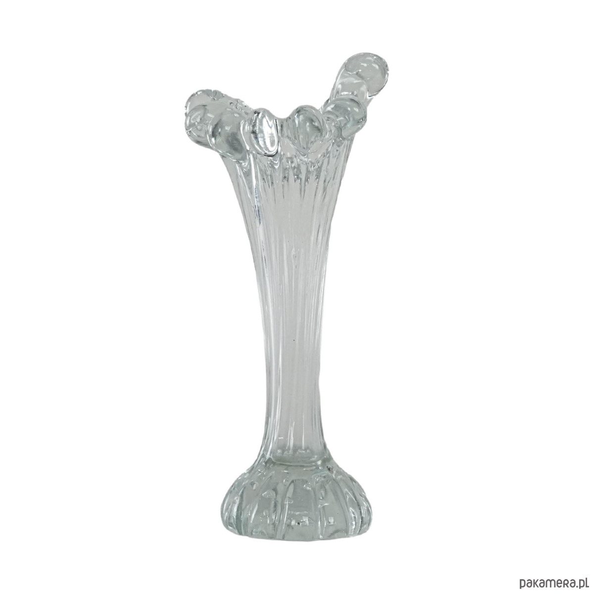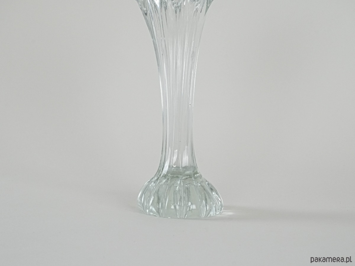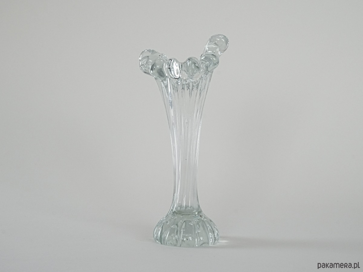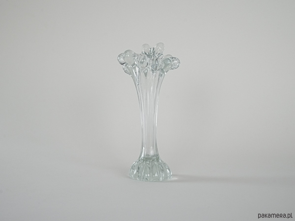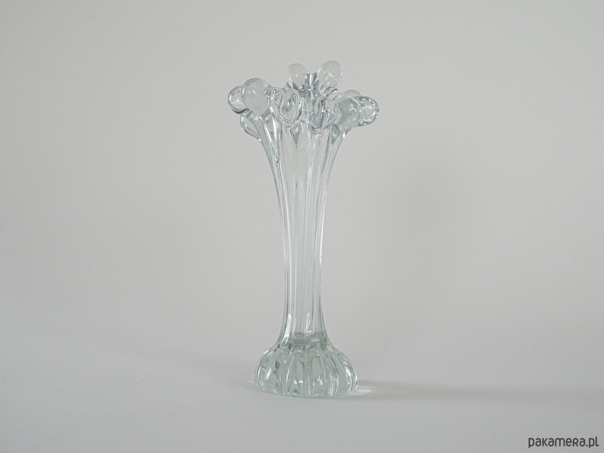 Unikatowy przykład szkła dekoracyjnego z epoki mid-century. Smukły korpus osadzony na dekoracyjnej, rzeźbionej podstawie, płynnie przechodzi w dynamiczne, organiczne zdobienia w górnej partii przypominające szklane krople. Subtelnie transparentny, z delikatnym refleksem światła, prezentuje się niezwykle elegancko zarówno jako samodzielna dekoracja, jak i z kompozycją kwiatów. Doskonały dodatek do kolekcji szkła artystycznego, a także element wprowadzający lekkość i retro charakter do wnętrza.