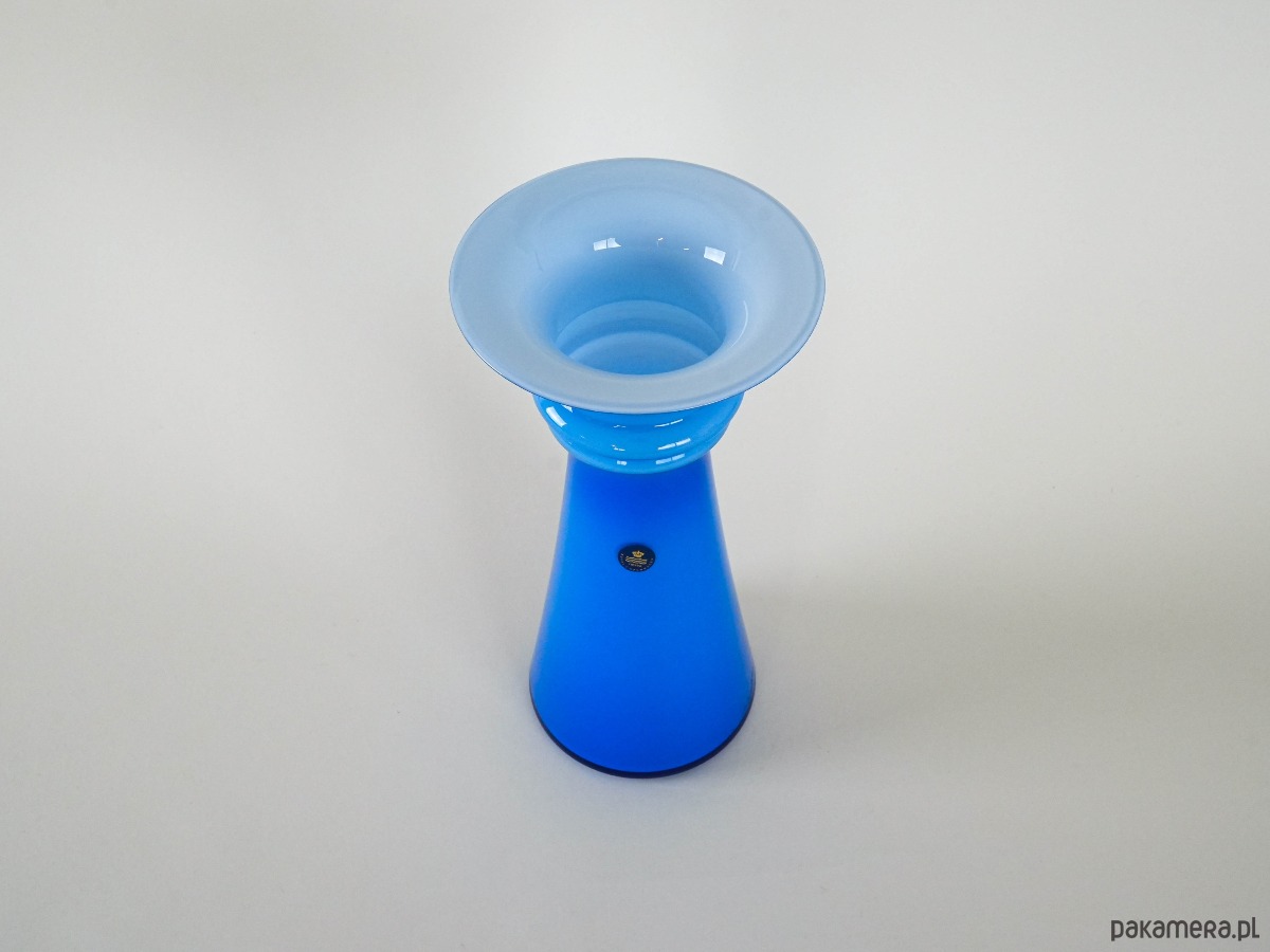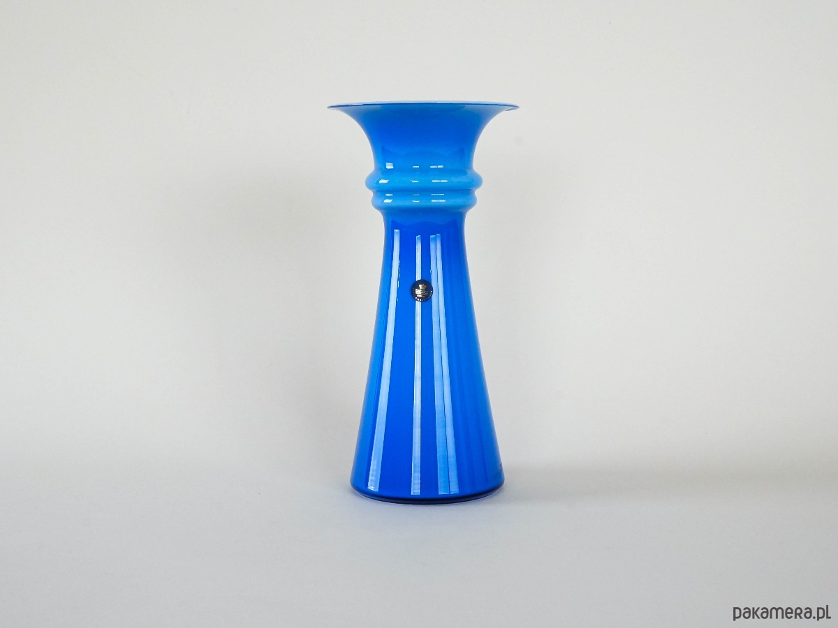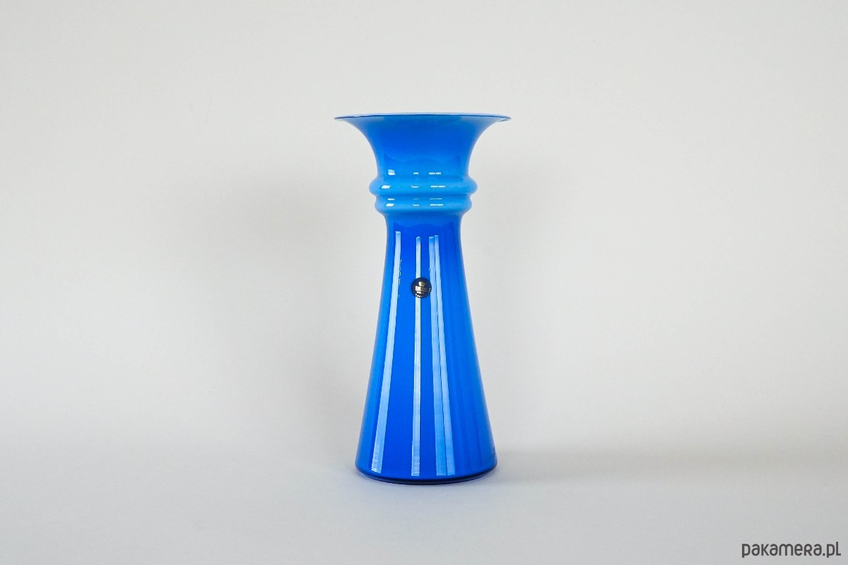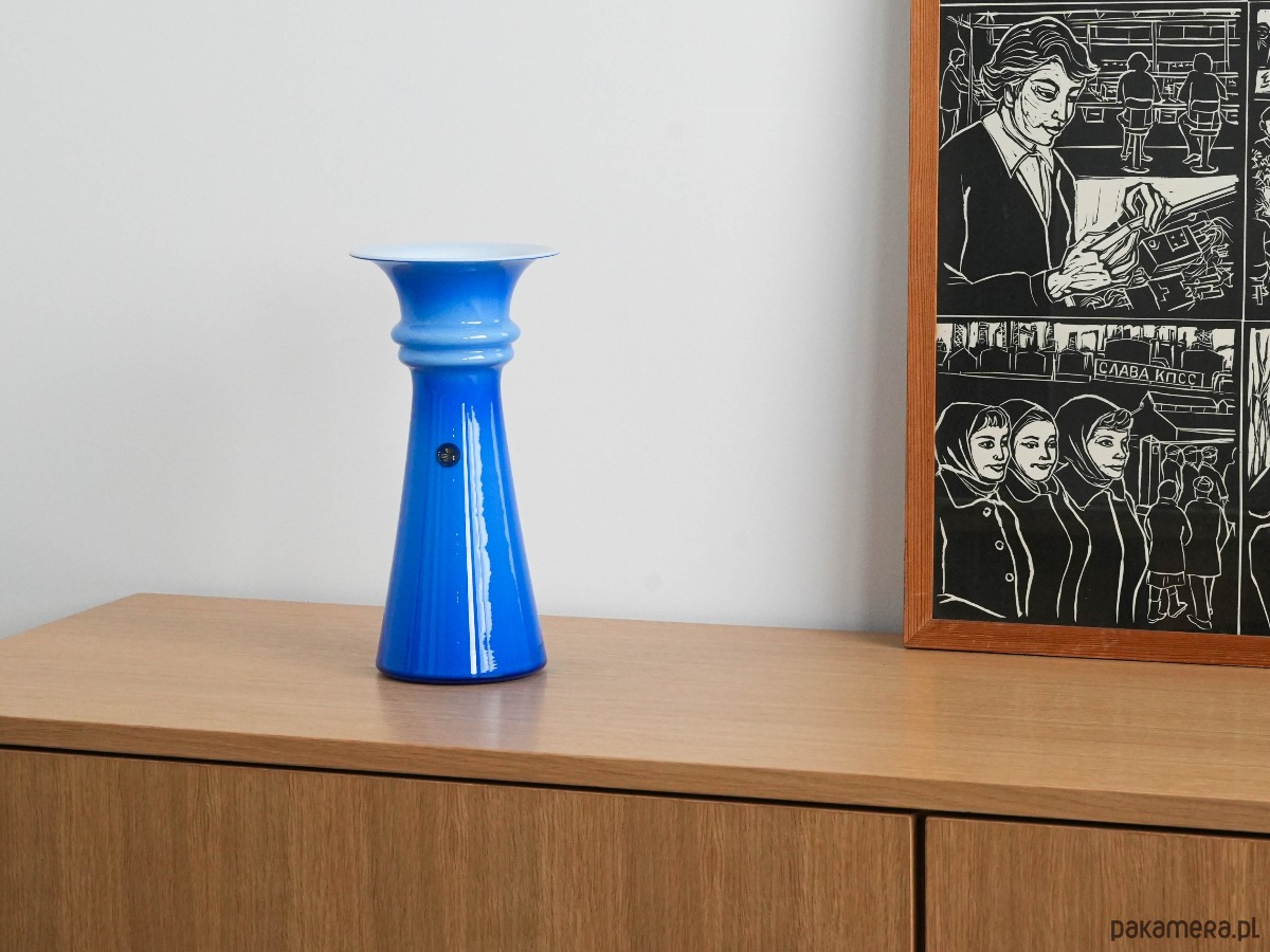 Rzadki, kolekcjonerski wazon ze szkła artystycznego, zaprojektowany przez Michaela Banga dla Holmegaard we współpracy z Royal Copenhagen w latach 80. XX wieku. Charakterystyczna forma z szerokim, rozchylonym rantem i dekoracyjnym przewężeniem w centralnej części to przykład duńskiego modernizmu w najlepszym wydaniu. Głębia niebieskiego koloru i perfekcyjna jakość szkła czynią z tego egzemplarza wyjątkowy obiekt kolekcjonerski i efektowną ozdobę wnętrza.
