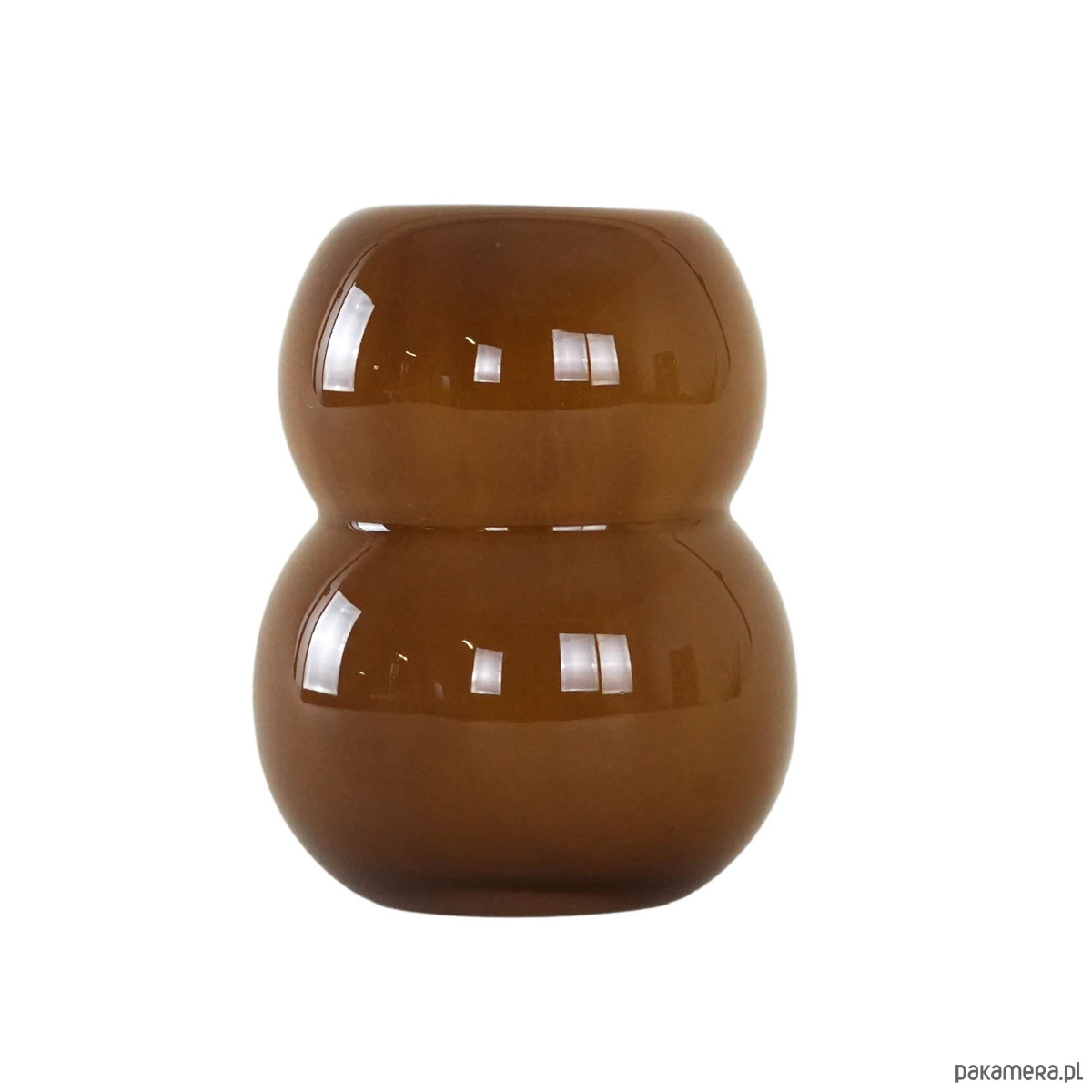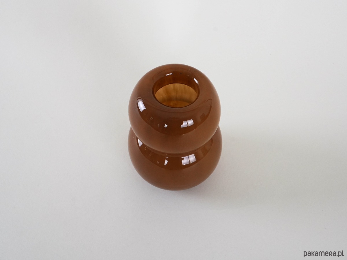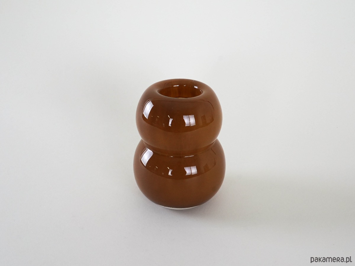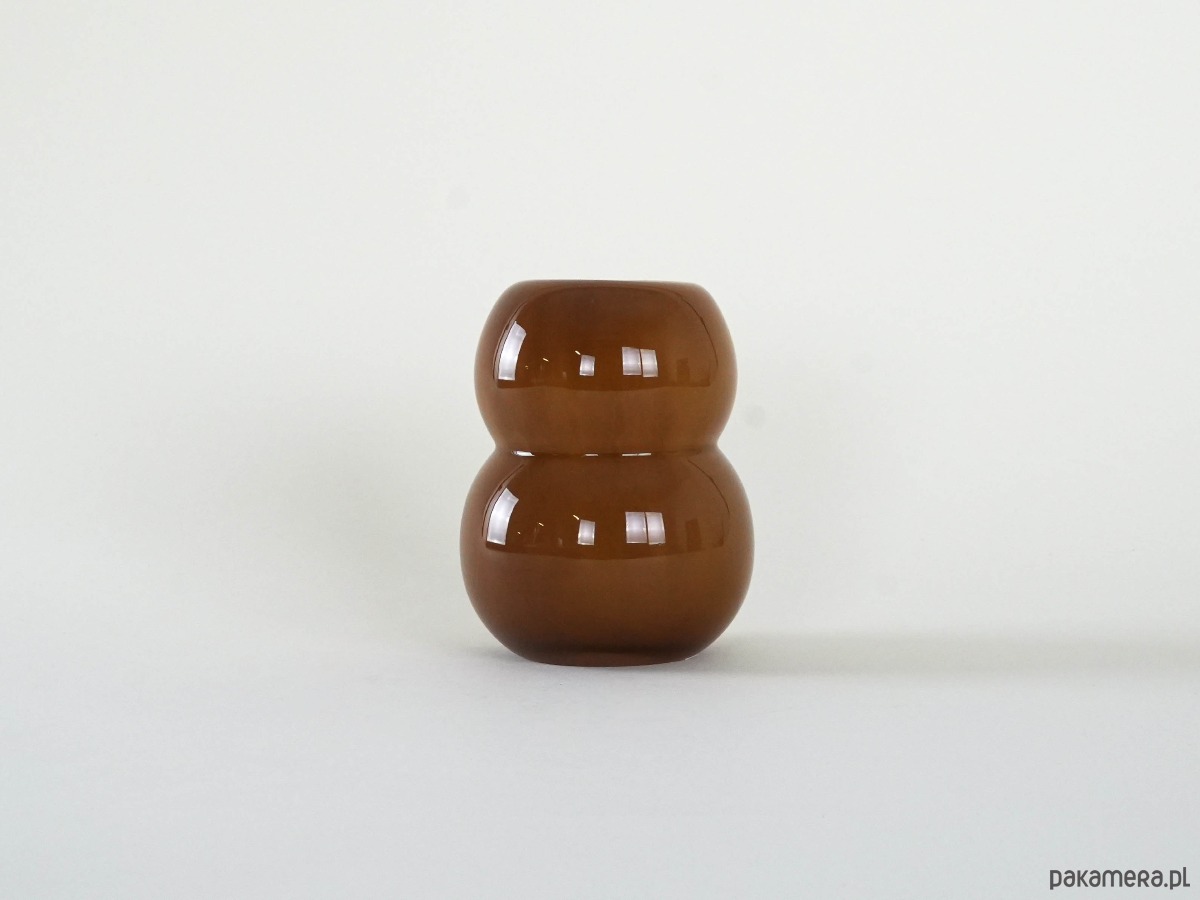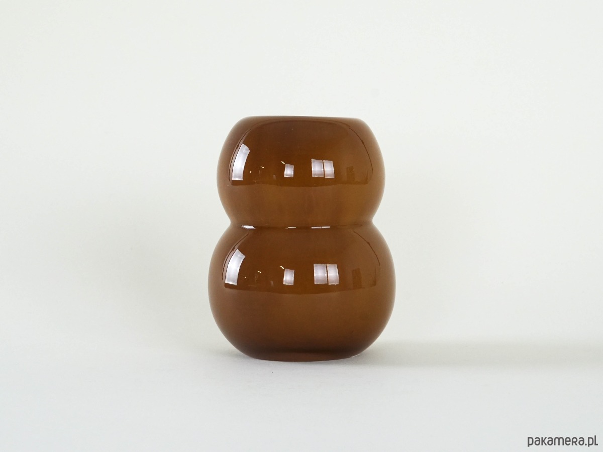 Wazon wykonany ze szkła w kolorze karmelowym. Charakteryzuje się obłą, dwuczęściową formą o miękkiej, rzeźbiarskiej linii, która przyciąga uwagę swoją prostotą i jednocześnie nowoczesnym wyrazem. Gładka, lśniąca powierzchnia podkreśla głębię karmelowego odcienia, nadając całości elegancji i subtelnego uroku. Świetny akcent do wnętrz w duchu mid-century modern, skandynawskiego minimalizmu czy eklektycznych aranżacji.