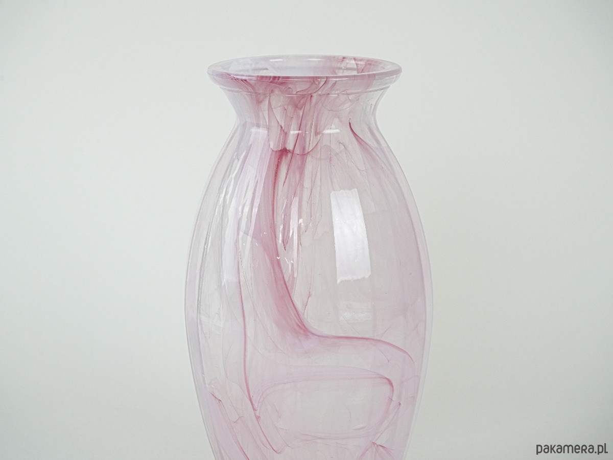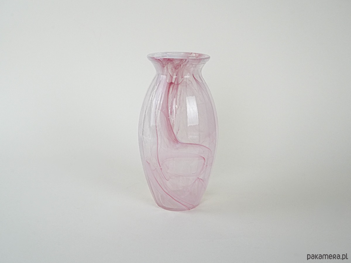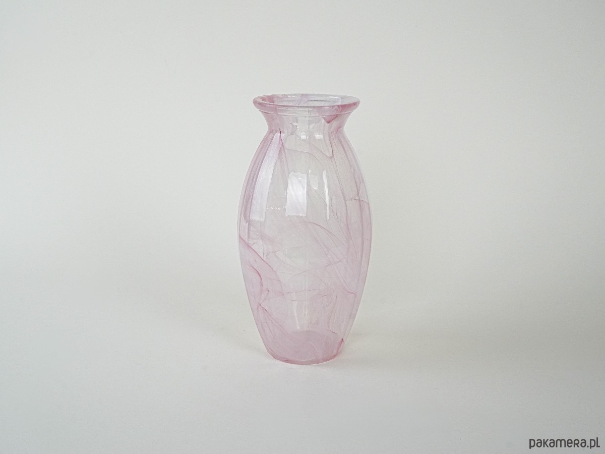 Wazon z dmuchanego szkła w odcieniach różu, z dekoracyjnymi smugami zatopionymi w masie szkła. Prawdopodobnie produkcja z lat 80.–90., w stylu studia artystycznego szkła. Subtelna kolorystyka i unikatowy wzór czynią go efektowną ozdobą wnętrza, zarówno w aranżacjach klasycznych, jak i nowoczesnych.