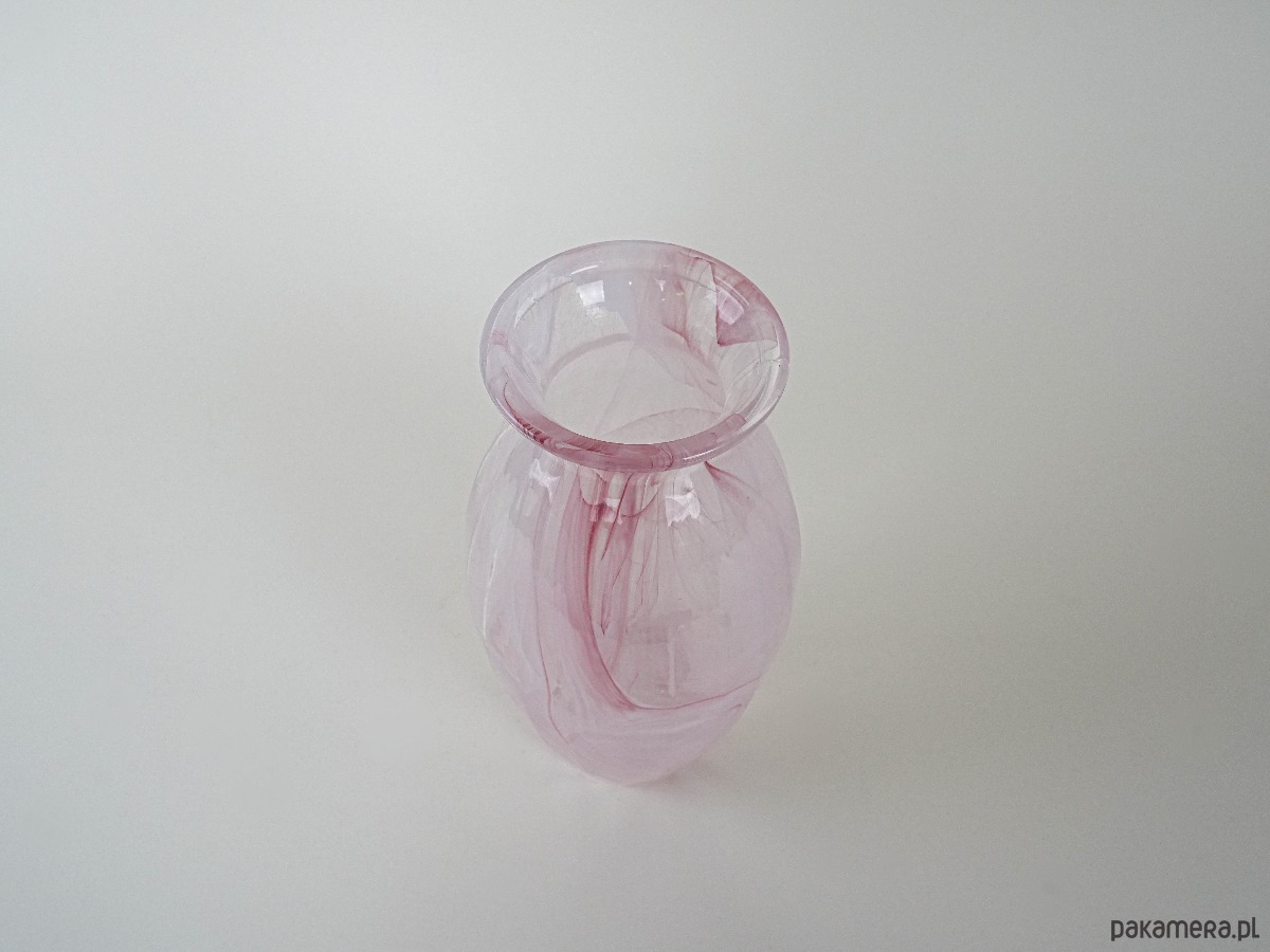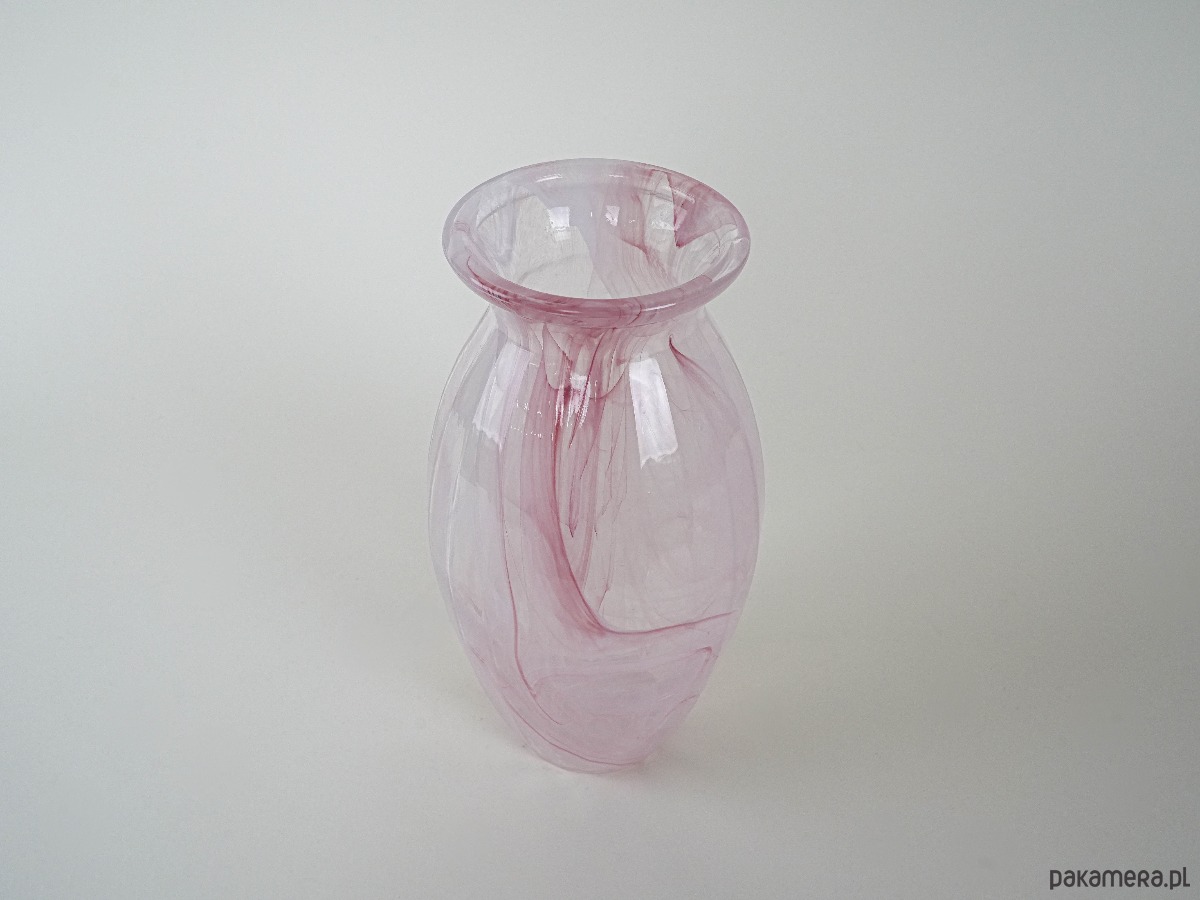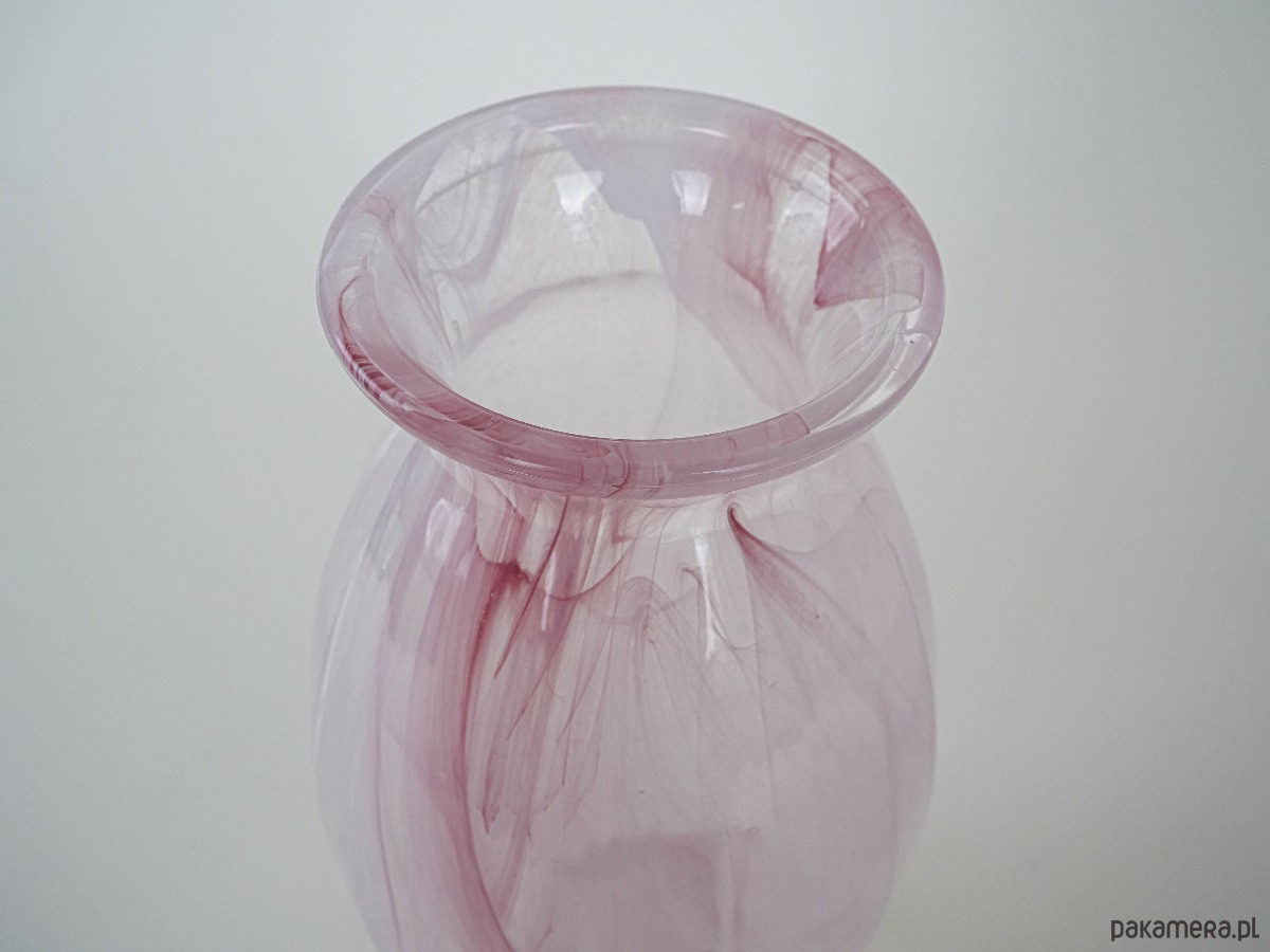 Wazon z dmuchanego szkła w odcieniach różu, z dekoracyjnymi smugami zatopionymi w masie szkła. Prawdopodobnie produkcja z lat 80.–90., w stylu studia artystycznego szkła. Subtelna kolorystyka i unikatowy wzór czynią go efektowną ozdobą wnętrza, zarówno w aranżacjach klasycznych, jak i nowoczesnych.