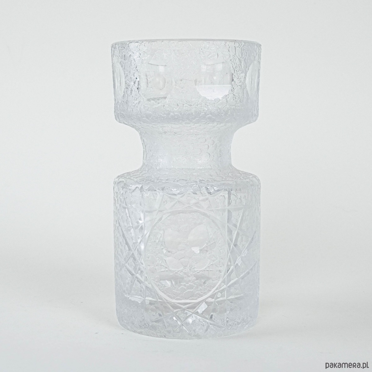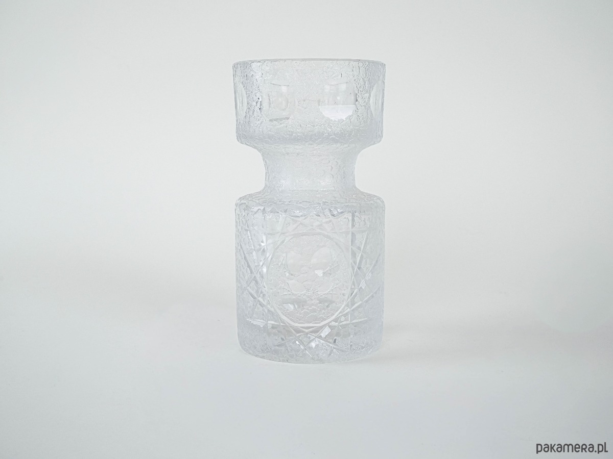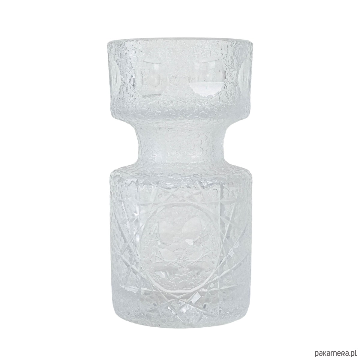 Wazon w stylu Scandinavian Modern, lata 60.–70. XX wieku. Szkło sodowe o wyrazistej, lodowej fakturze („ice glass”), charakterystycznej dla projektów skandynawskich hut, takich jak Riihimäen Lasi, Iittala czy Kosta Boda. Cylindryczna forma z przewężeniem i geometrycznym szlifem na dolnej partii nadaje przedmiotowi rzeźbiarski charakter. Strukturalna powierzchnia pięknie rozprasza światło, tworząc grę refleksów, typową dla designu z okresu mid-century. Obiekt kolekcjonerski, dekoracyjny i użytkowy jednocześnie.
