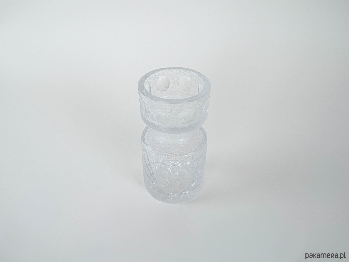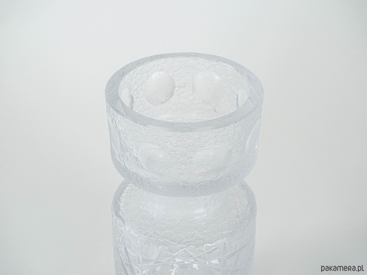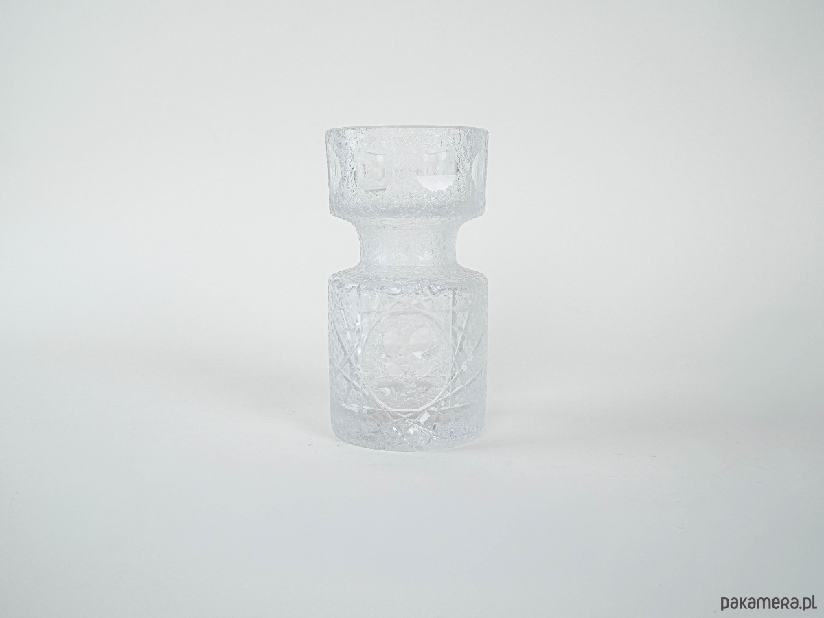 Wazon w stylu Scandinavian Modern, lata 60.–70. XX wieku. Szkło sodowe o wyrazistej, lodowej fakturze („ice glass”), charakterystycznej dla projektów skandynawskich hut, takich jak Riihimäen Lasi, Iittala czy Kosta Boda. Cylindryczna forma z przewężeniem i geometrycznym szlifem na dolnej partii nadaje przedmiotowi rzeźbiarski charakter. Strukturalna powierzchnia pięknie rozprasza światło, tworząc grę refleksów, typową dla designu z okresu mid-century. Obiekt kolekcjonerski, dekoracyjny i użytkowy jednocześnie.