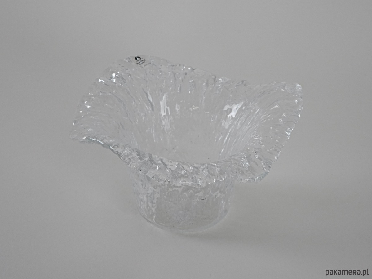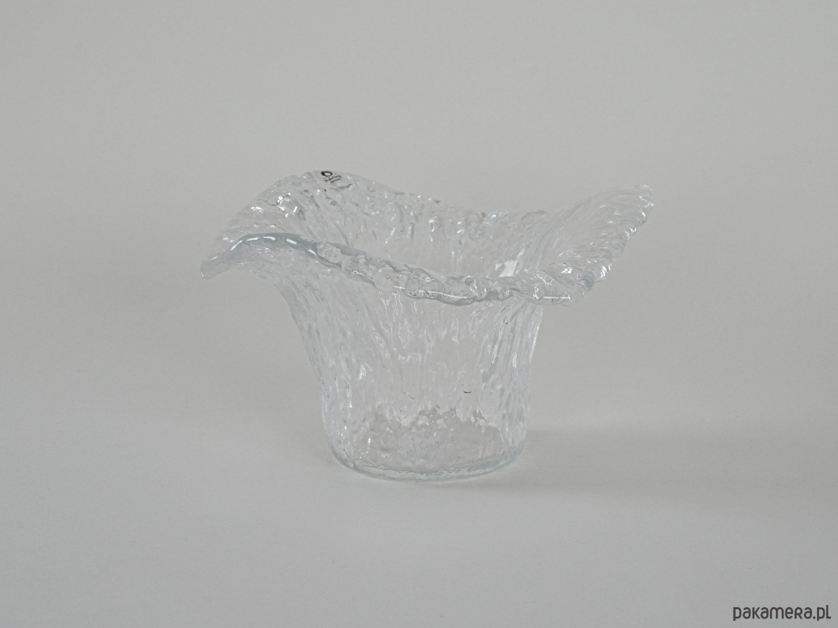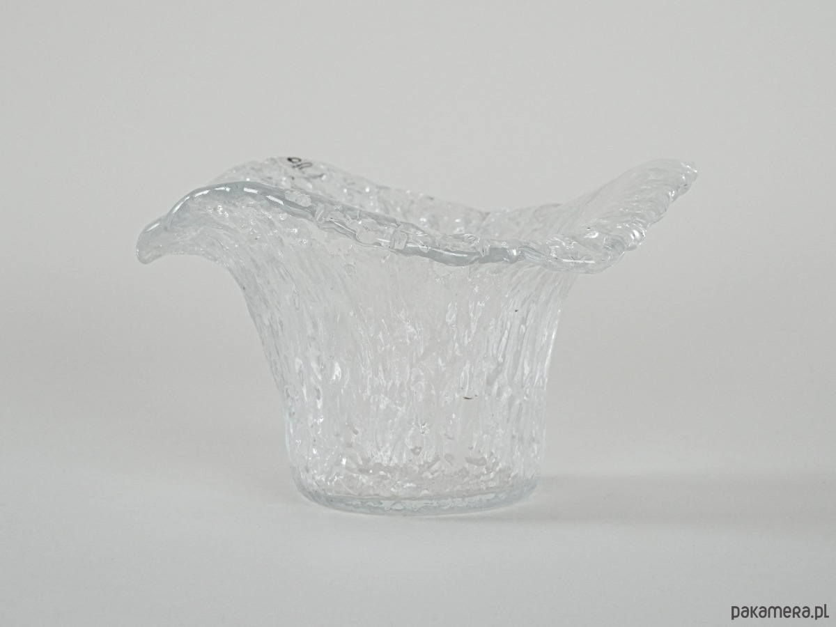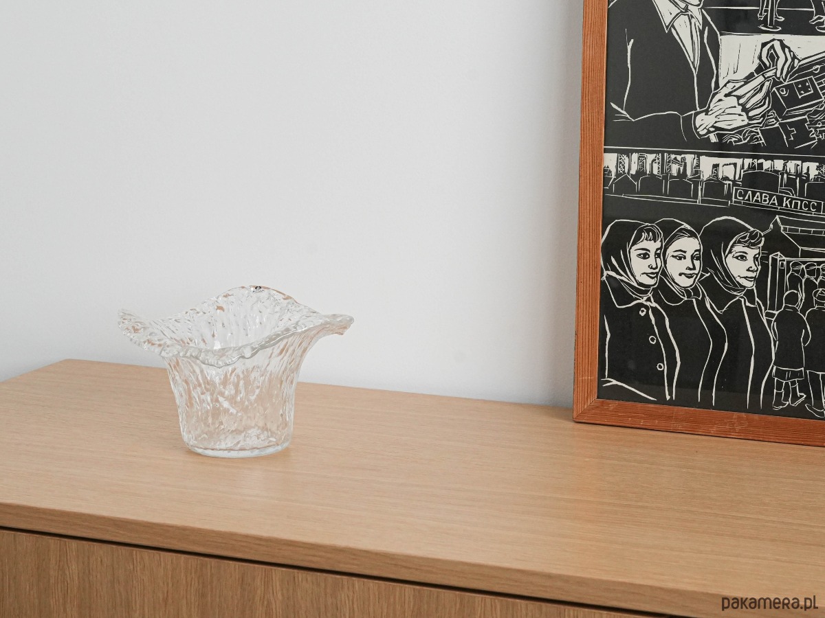 Wyjątkowy przykład szwedzkiego szkła artystycznego z renomowanej huty Pukeberg. Wazon o organicznej, lekko falującej formie i wyrazistej fakturze lodowego szkła, charakterystycznej dla skandynawskiego designu lat 60. Światło pięknie załamuje się w strukturze szkła, tworząc efekt głębi i elegancji. Idealny jako element kolekcji nordyckiego szkła, ale także jako samodzielna dekoracja w stylu mid-century modern. Harmonijnie łączy funkcjonalność z artystycznym wyrazem, wprowadzając do wnętrza lekkość i chłodny, skandynawski klimat.