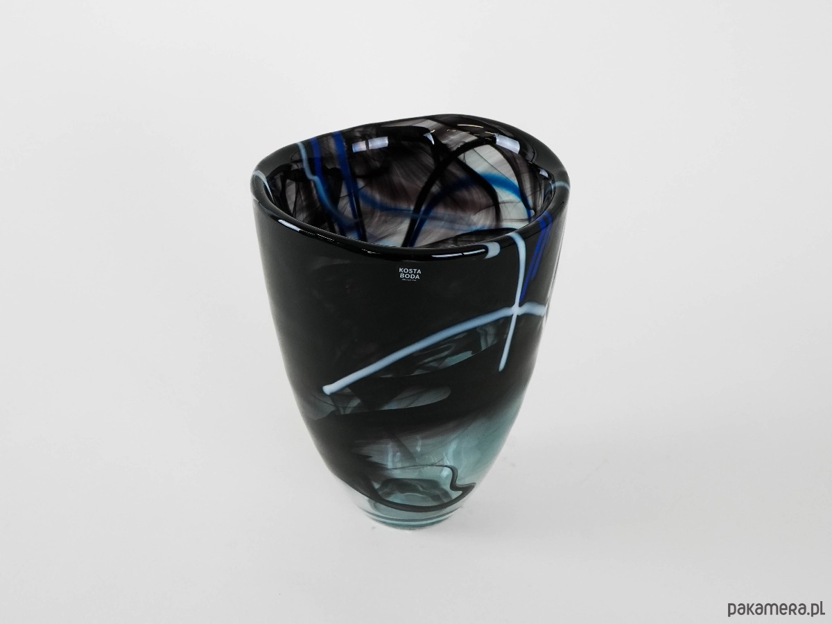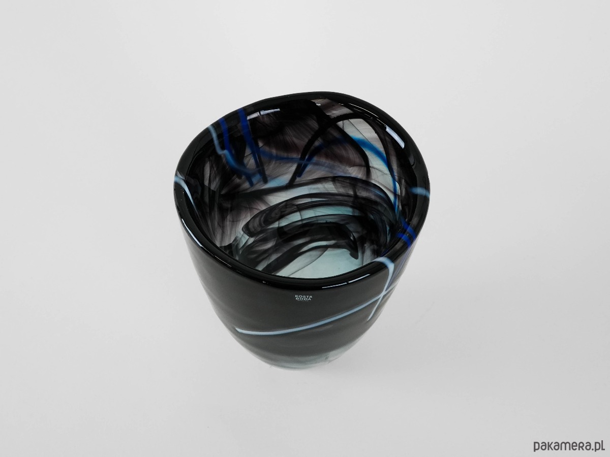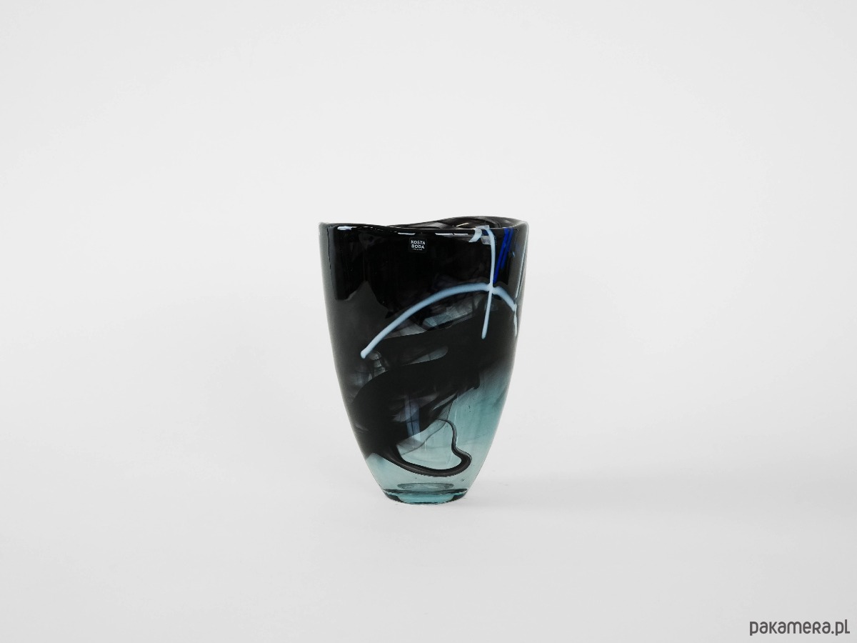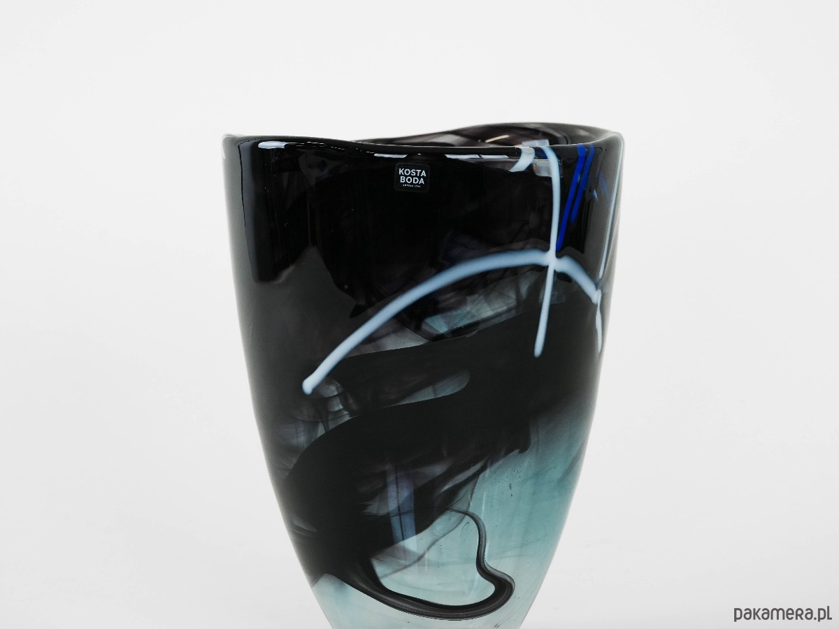 Kontrastowy wazon ze szkła artystycznego, projekt autorstwa Anny Ehrner dla Kosta Boda, Szwecja, lata 80. XX w. Ręcznie formowane szkło w odcieniach czerni i błękitu z dynamicznymi, białymi akcentami wewnątrz masy szklanej. Charakterystyczny dla Ehrner eksperymentalny styl, oparty na kontraście barw i abstrakcyjnych układach linii.