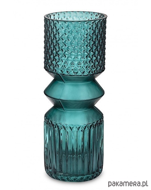 Ciekawy w swoim kształcie wazon wykonany z solidnego szkła. Celowo tłoczony oraz posiadający wypustki.