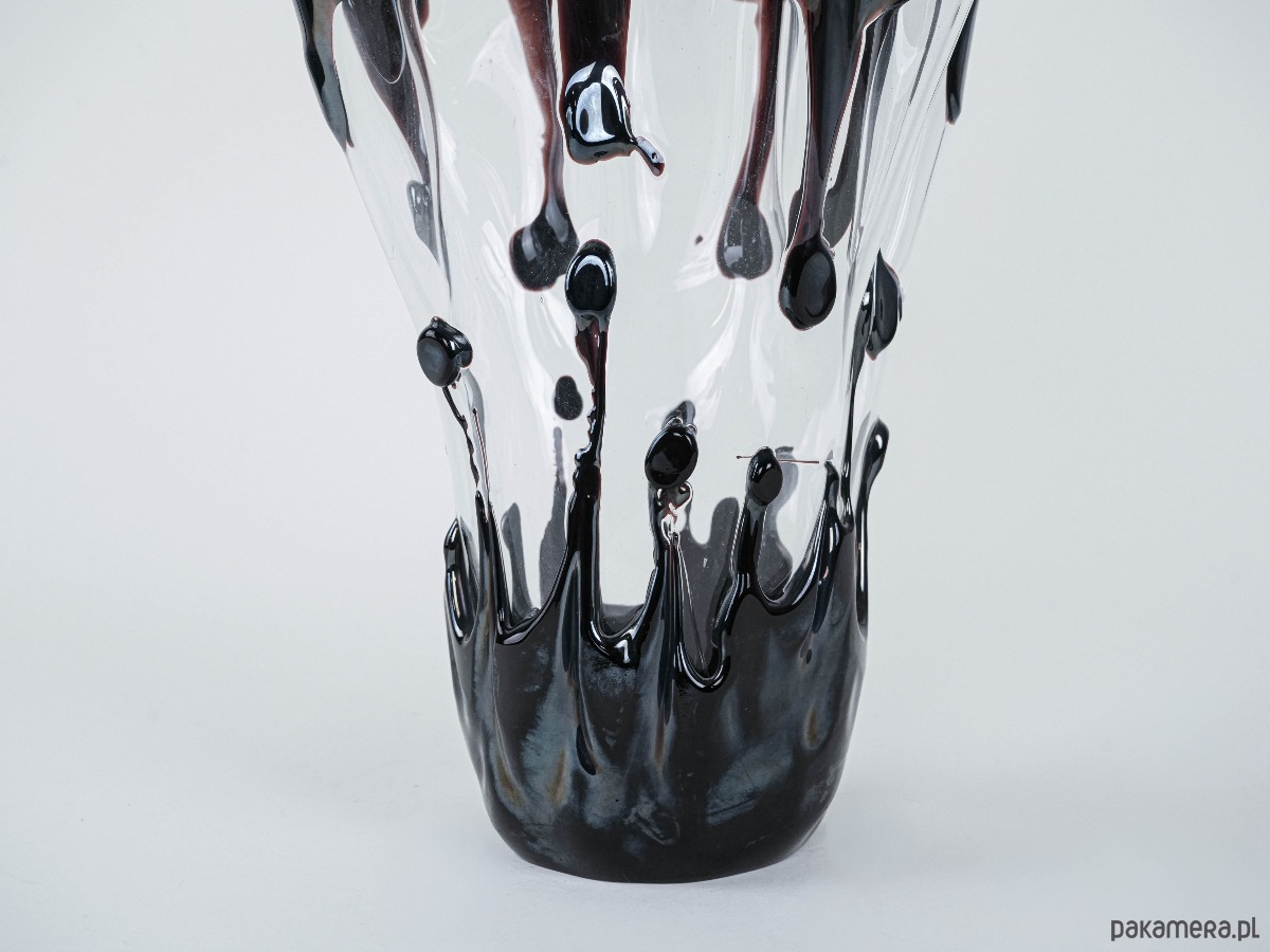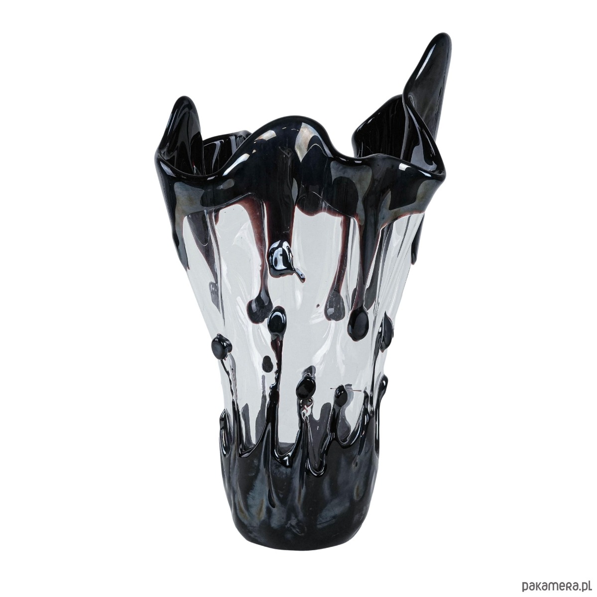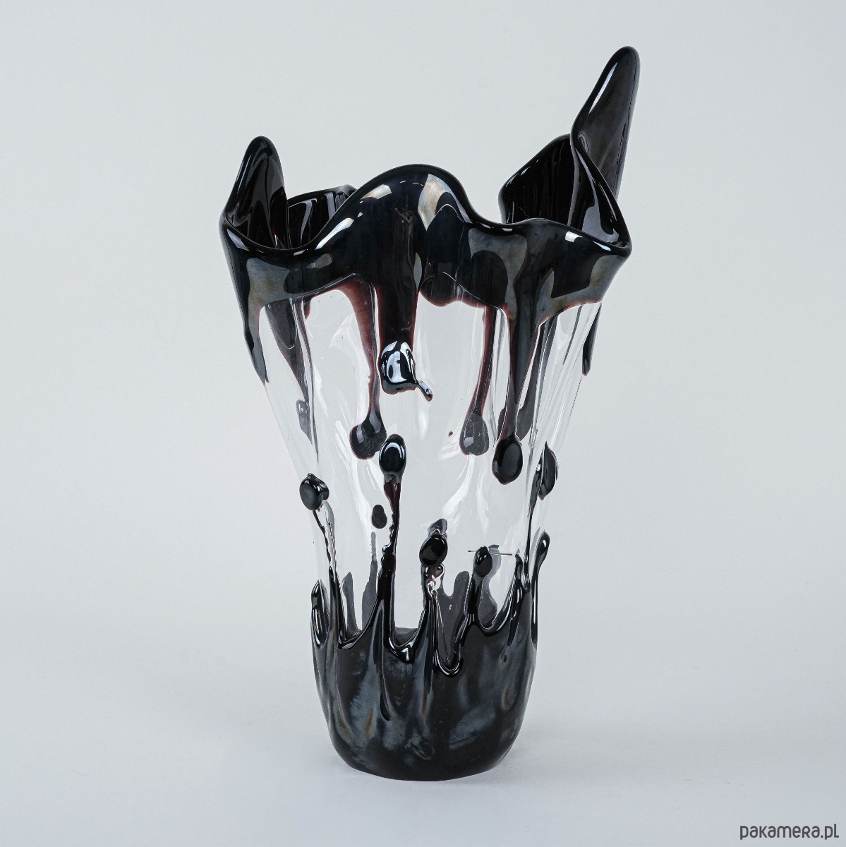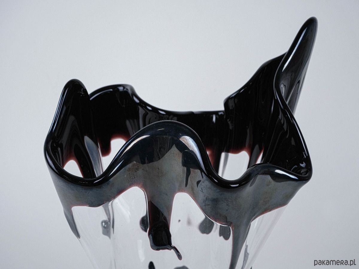 Spektakularny wazon artystyczny Murano, lata 60./70. XX w. – unikatowy przykład włoskiego szkła artystycznego w technice sommerso i lava glass. Transparentna bryła szkła o dynamicznie formowanej krawędzi została wzbogacona kontrastującymi strumieniami czerni i głębokiej czerwieni, które spływają niczym zastygła lawa, tworząc efekt dramatycznego ruchu i ekspresji. Monumentalna forma czyni z tego obiektu prawdziwą rzeźbę szklaną, idealną jako centralny punkt aranżacji wnętrza w stylu mid-century modern, glamour czy eklektycznym. Wazon ten należy do najbardziej widowiskowych dzieł murano z epoki – przykład mistrzowskiego połączenia tradycji rzemieślniczej i śmiałego, awangardowego wzornictwa.