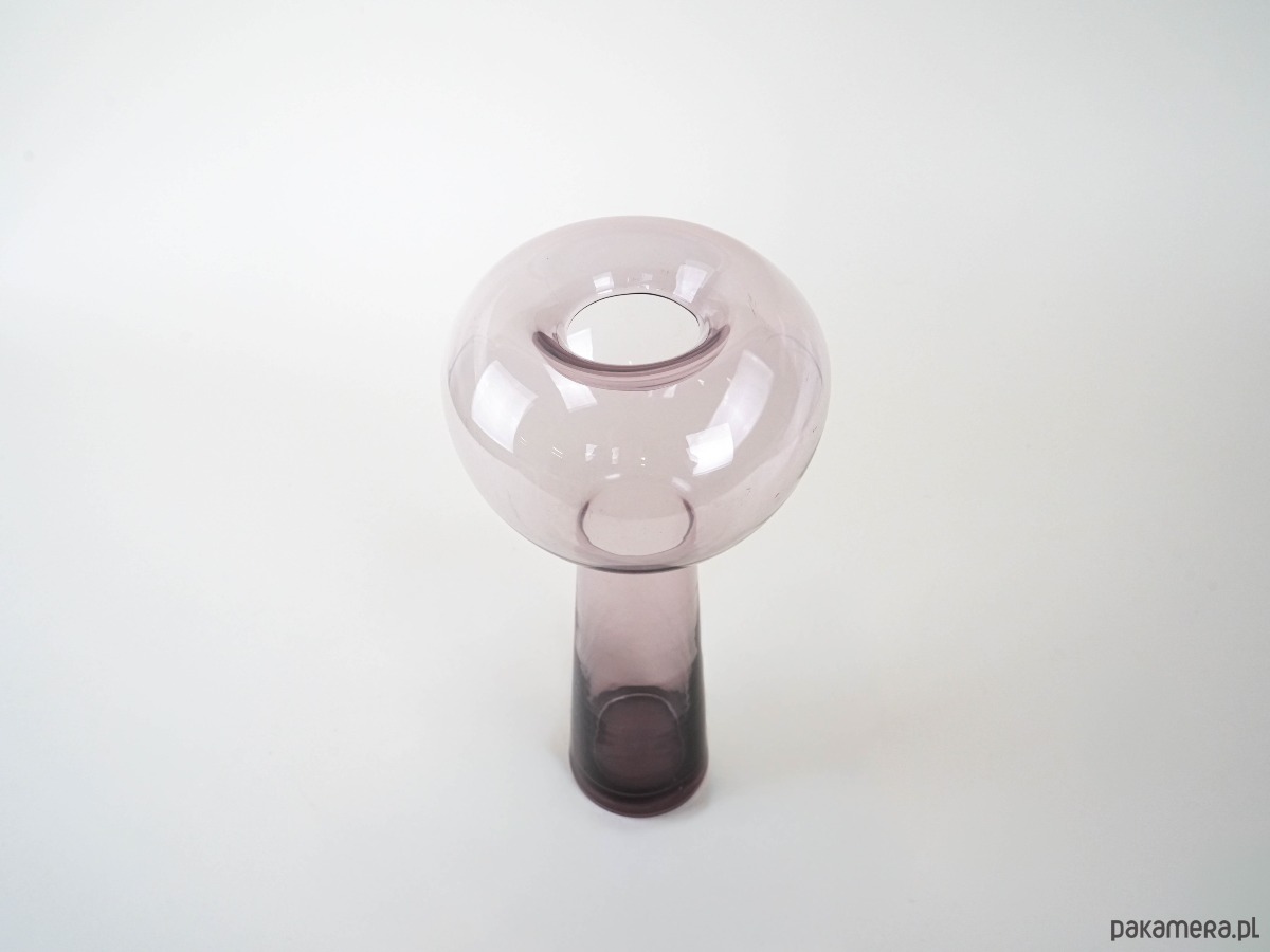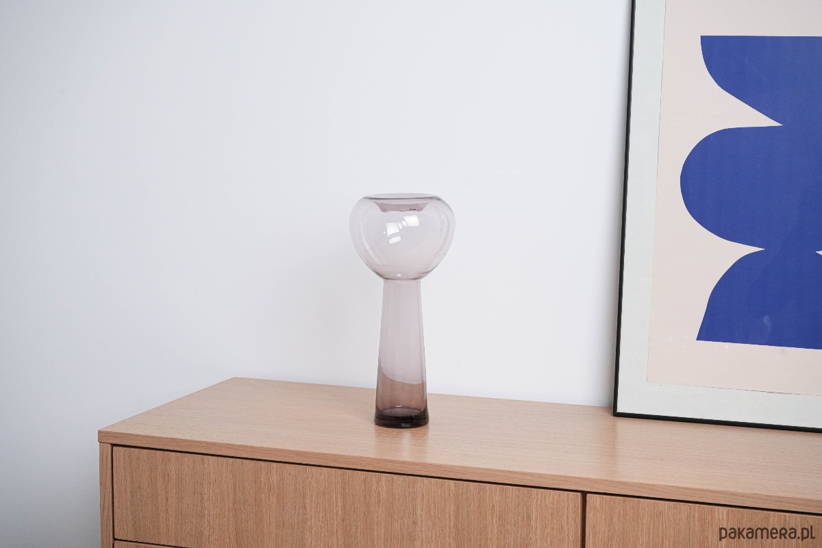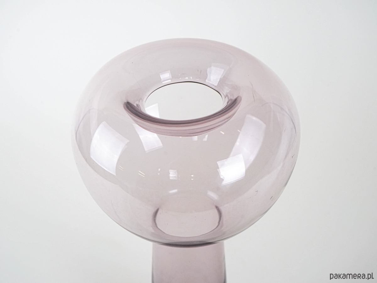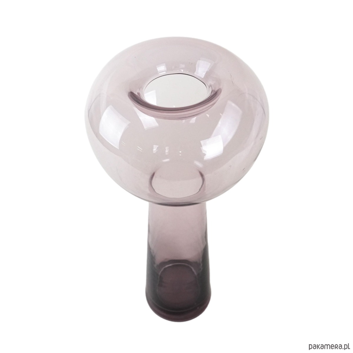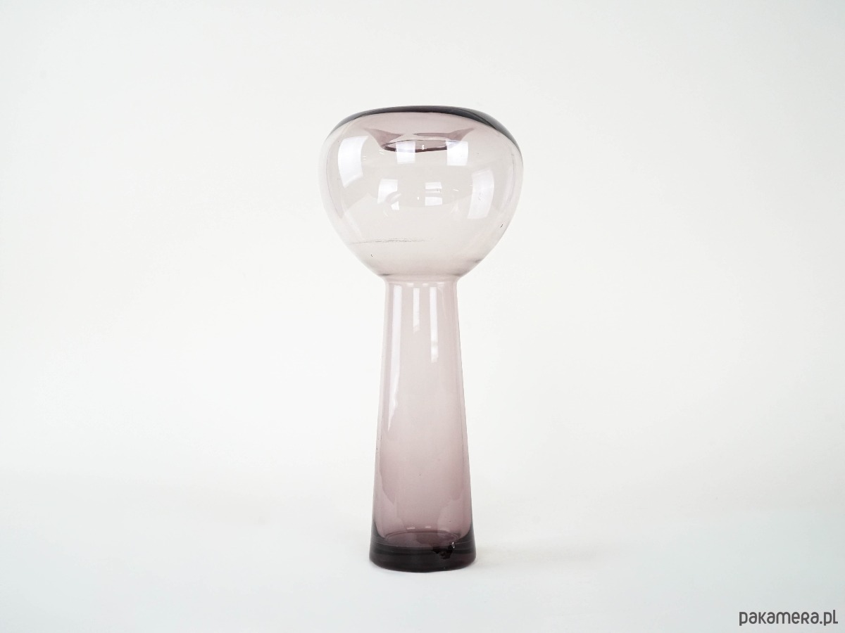 Szklany wazon w odcieniu przydymionego fioletu, o geometrycznej formie charakterystycznej dla designu lat 60–70. Smukła podstawa przechodzi w szeroką, kulistą górę, tworząc wyrazistą sylwetkę.