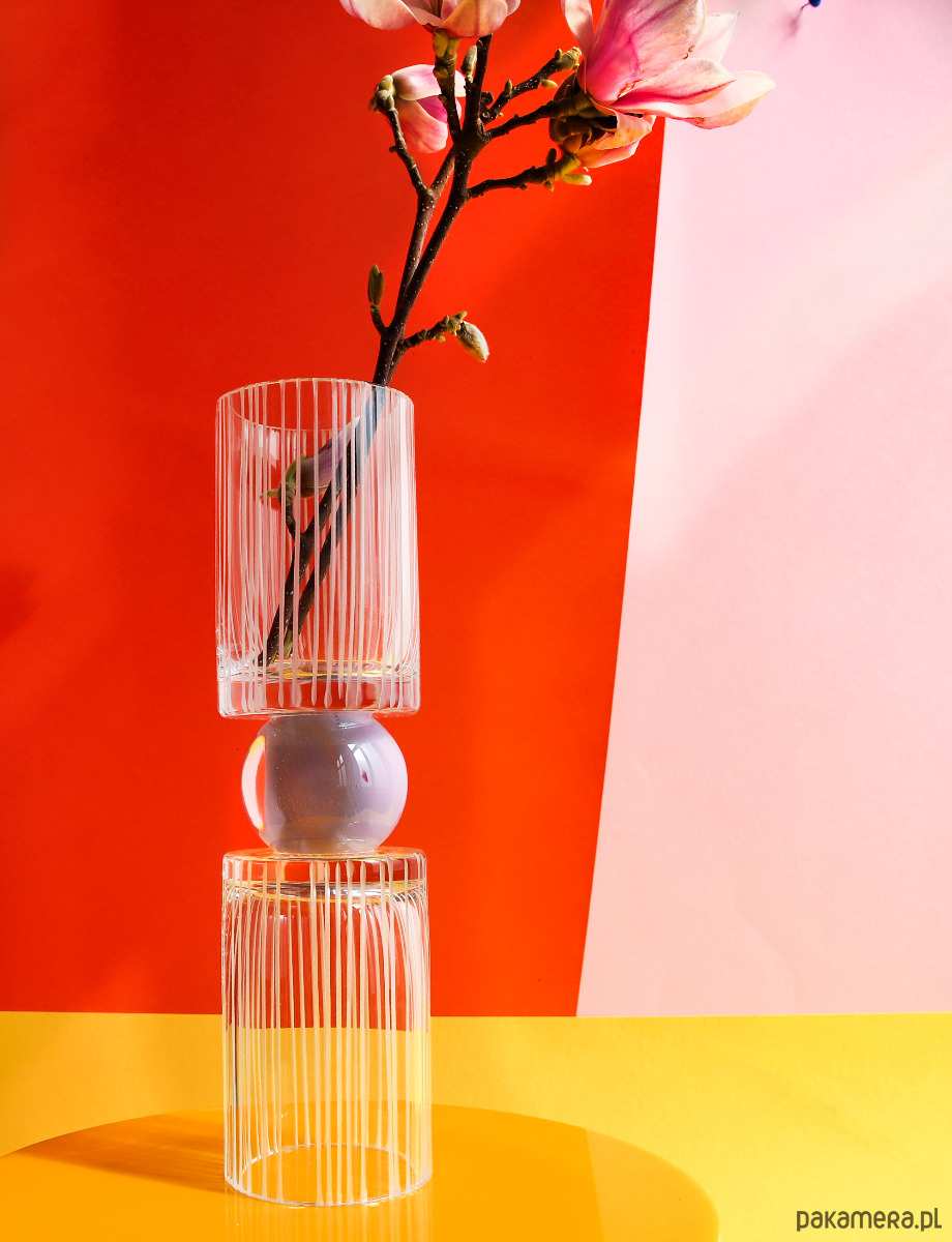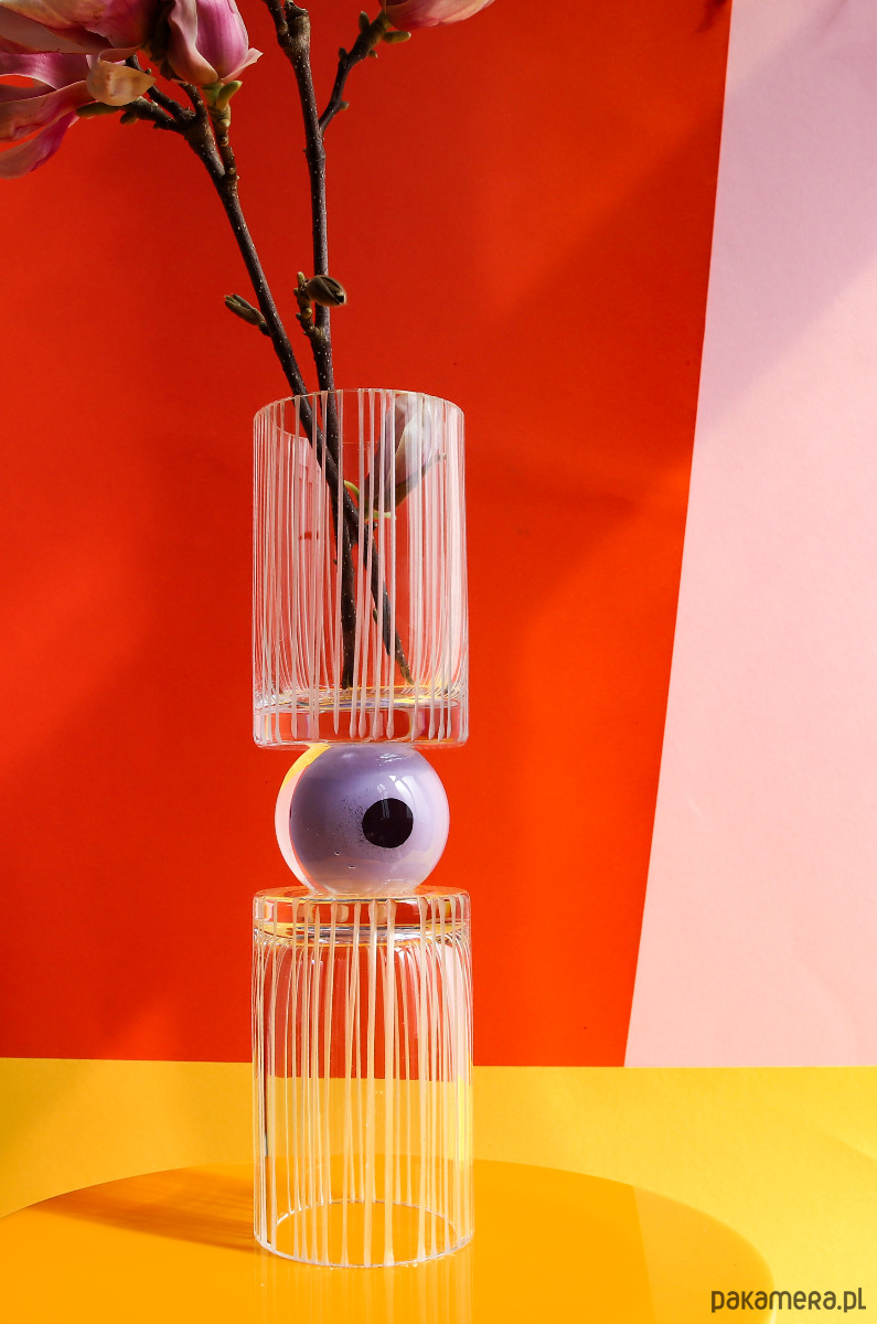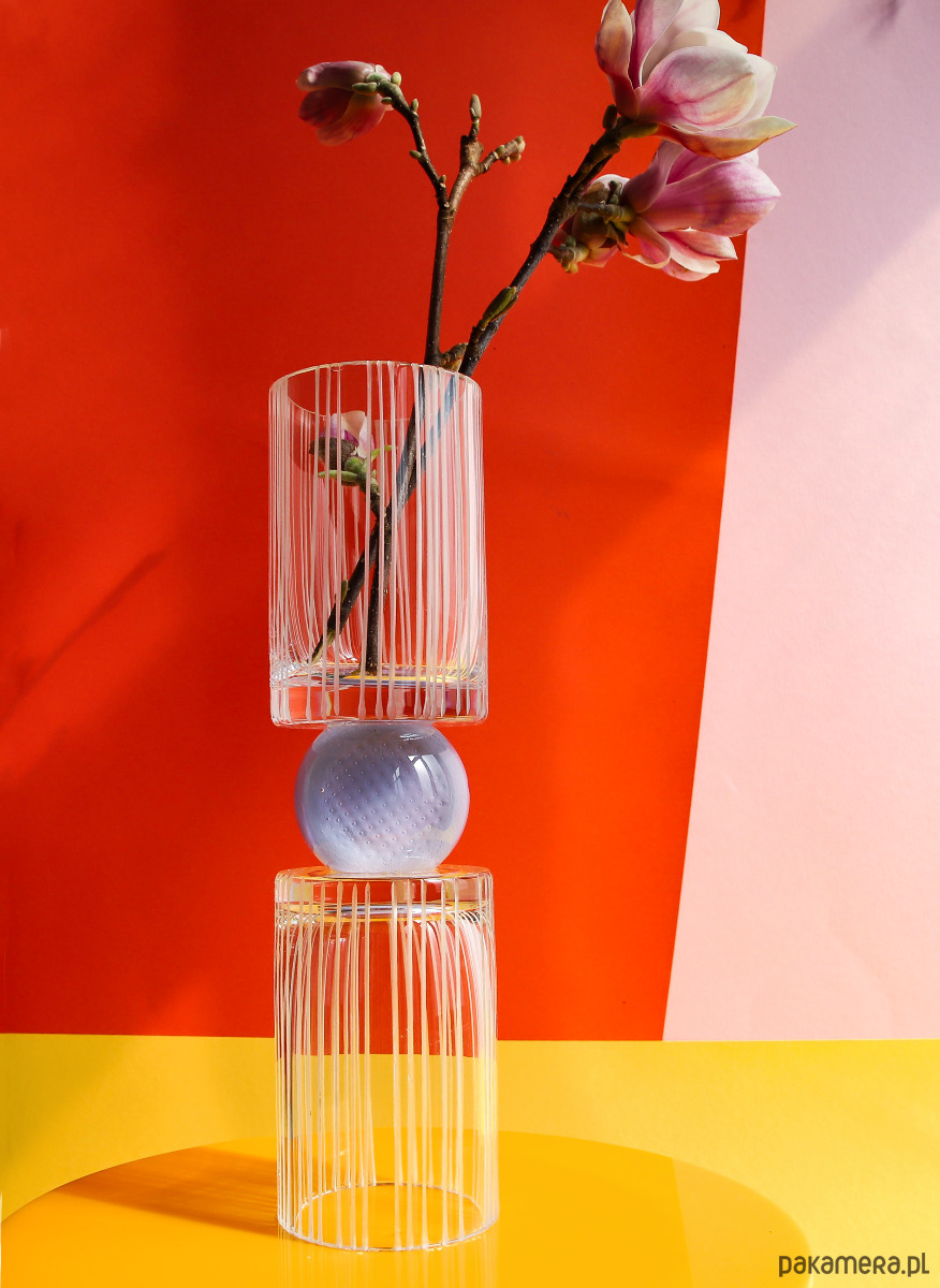 Powstał pod wpływem fascynacji współczesnej architektury. Wazon ma charakter prostych brył klejonych na zimno, kuli i walca. Każdy jest niepowtarzalny. Szlify wykonałam osobiście.