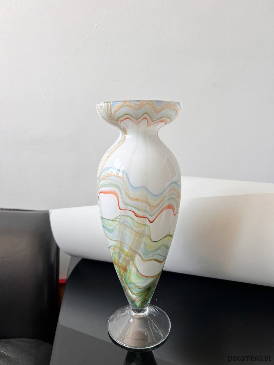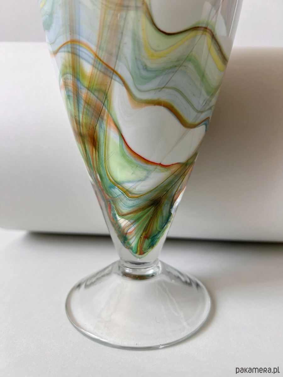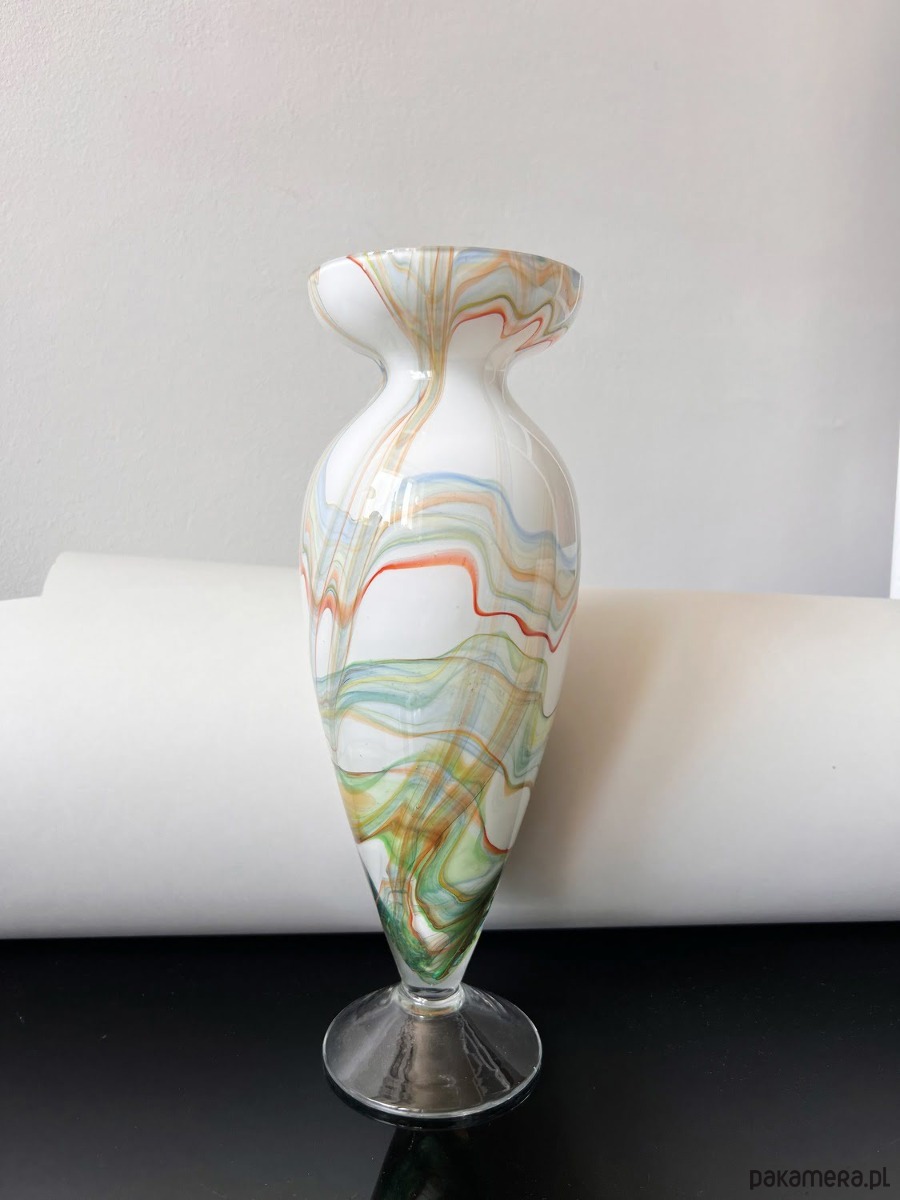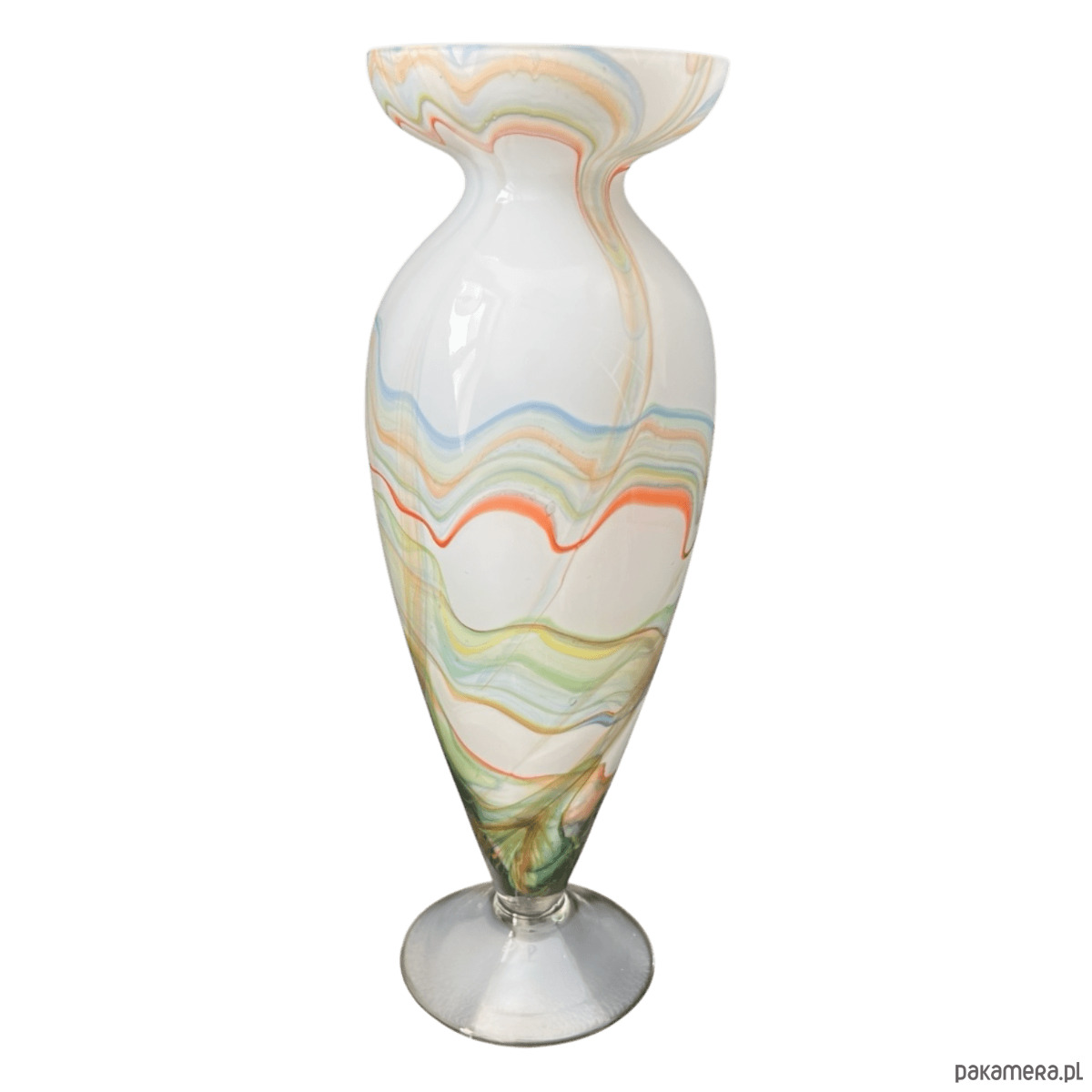Wazon ze szkła na nóżce przypominającej te od kieliszków. Biały w żyłkowany, falisty wzór, który przypomina abstrakcyjne malarstwo. Pozostaje subtelny, mimo wielu barw.