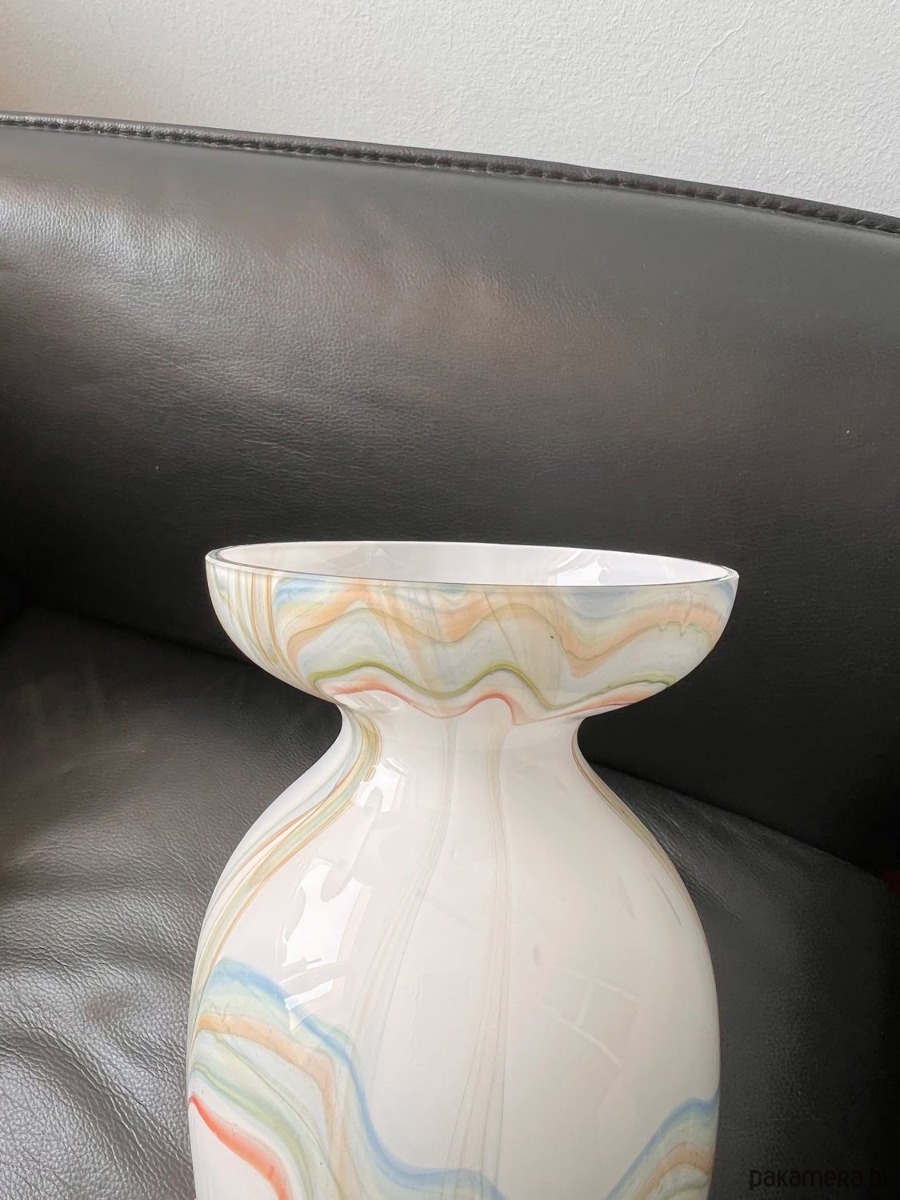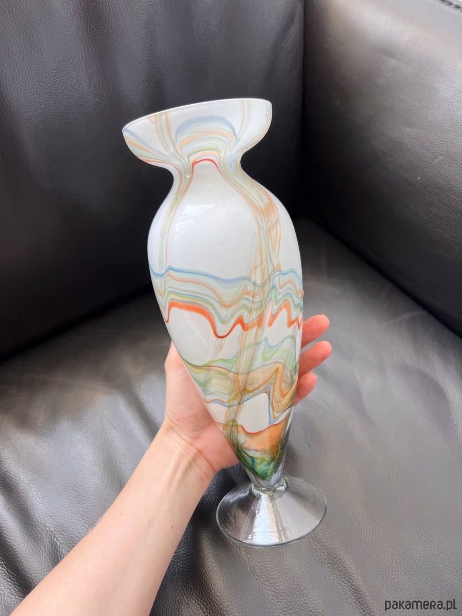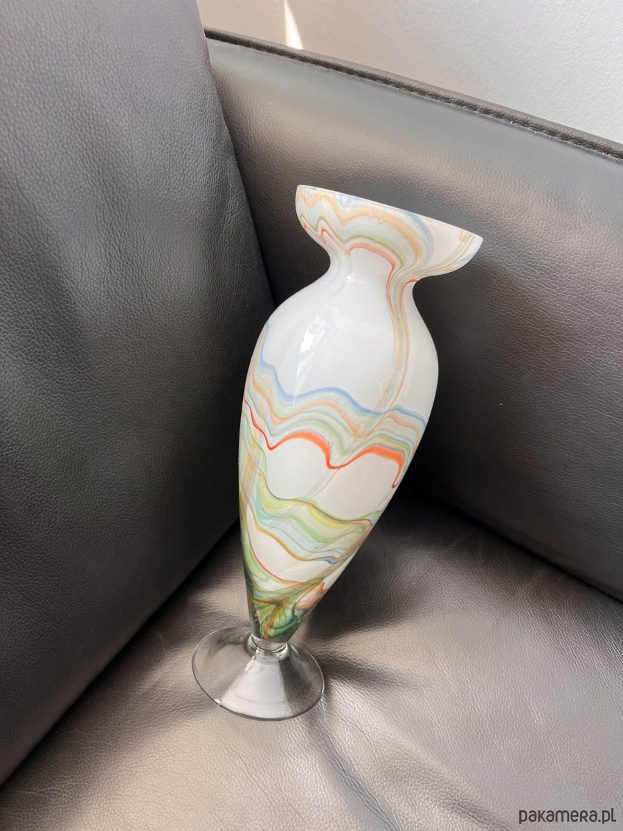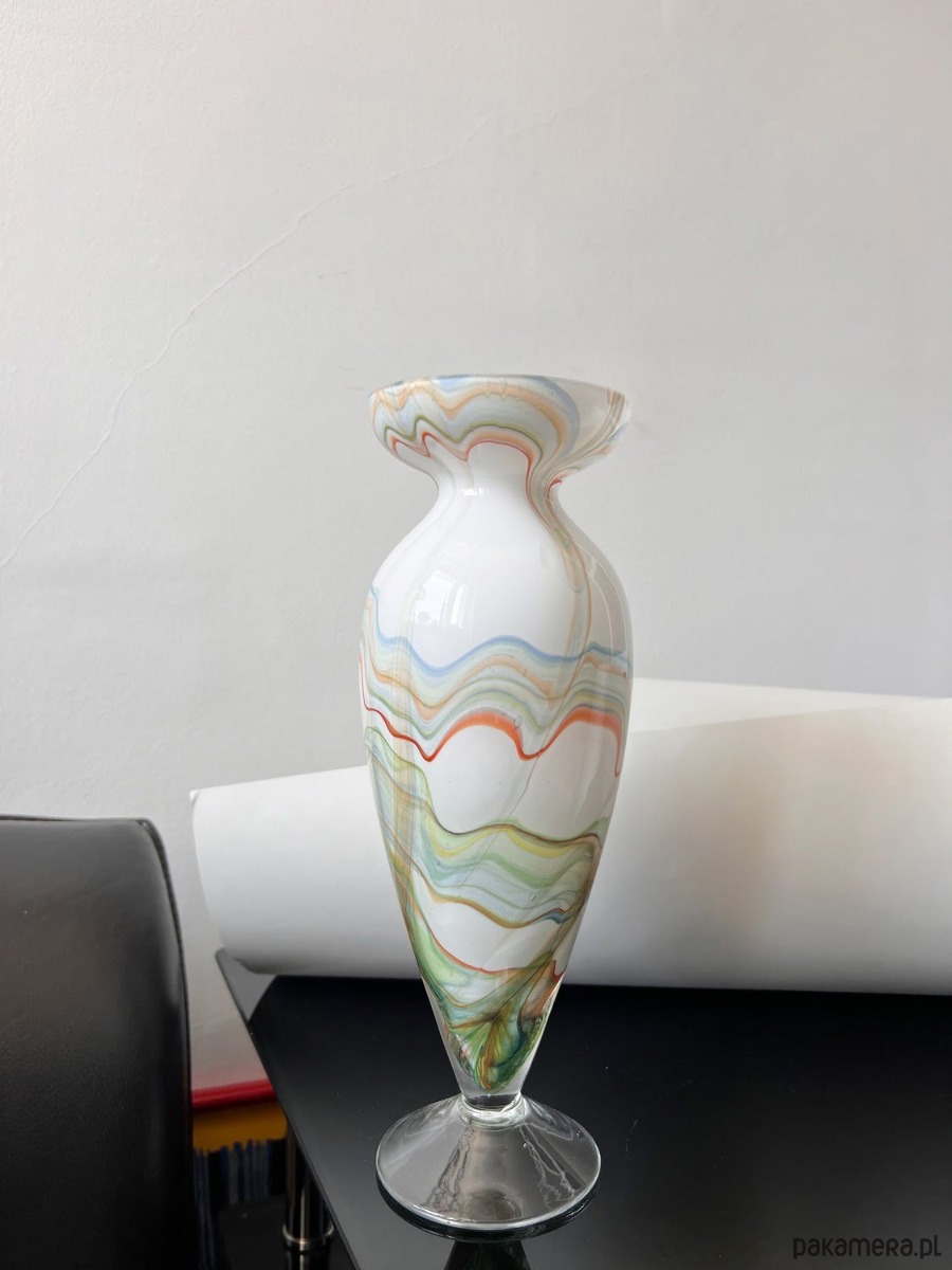 Wazon ze szkła na nóżce przypominającej te od kieliszków. Biały w żyłkowany, falisty wzór, który przypomina abstrakcyjne malarstwo. Pozostaje subtelny, mimo wielu barw.