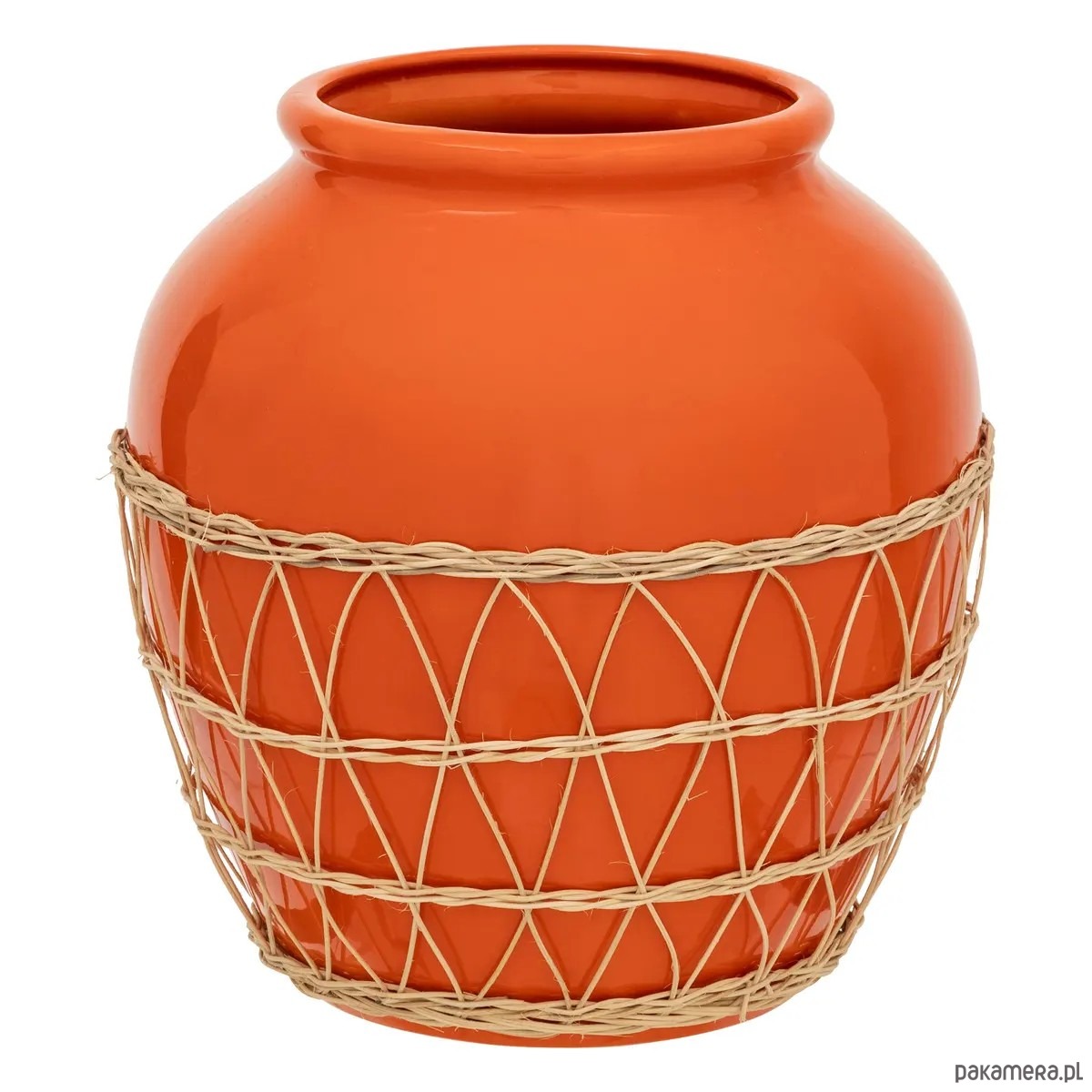Bardzo ciekawy wazon wykonany z dolomitu. W kolorze pomarańczowym. W dolnej części znajduje się rattanowa siatka.