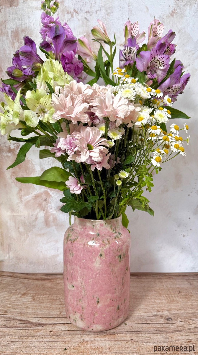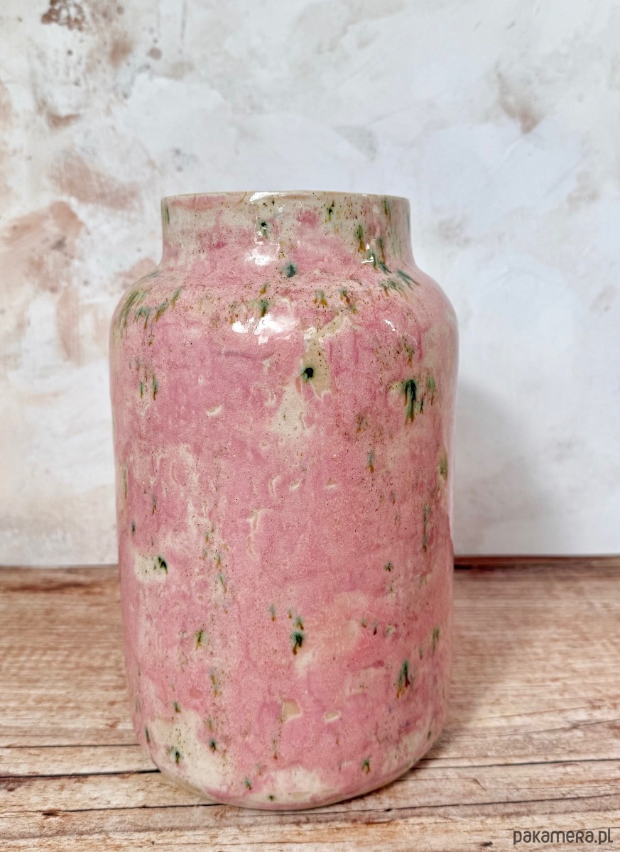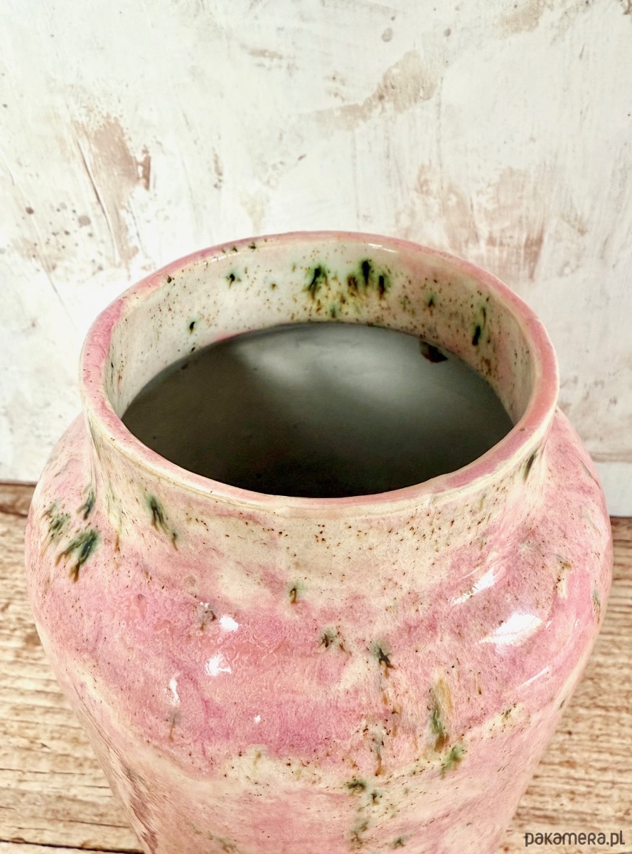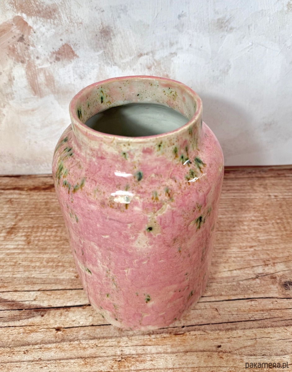 Unikatowy wazon wykonany ręcznie z jasnej gliny, szkliwiony autorskim, nieregularnym szkliwem w odcieniu pudrowego różu z subtelnymi zielonymi refleksami. Każdy egzemplarz jest jedyny w swoim rodzaju – delikatne przebarwienia, przejścia tonalne i organiczna faktura podkreślają rzemieślniczy charakter przedmiotu.